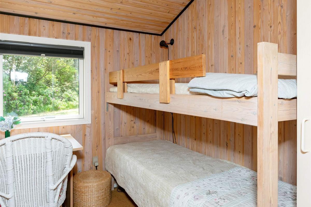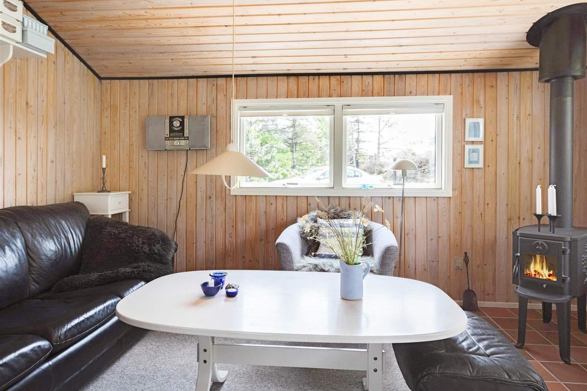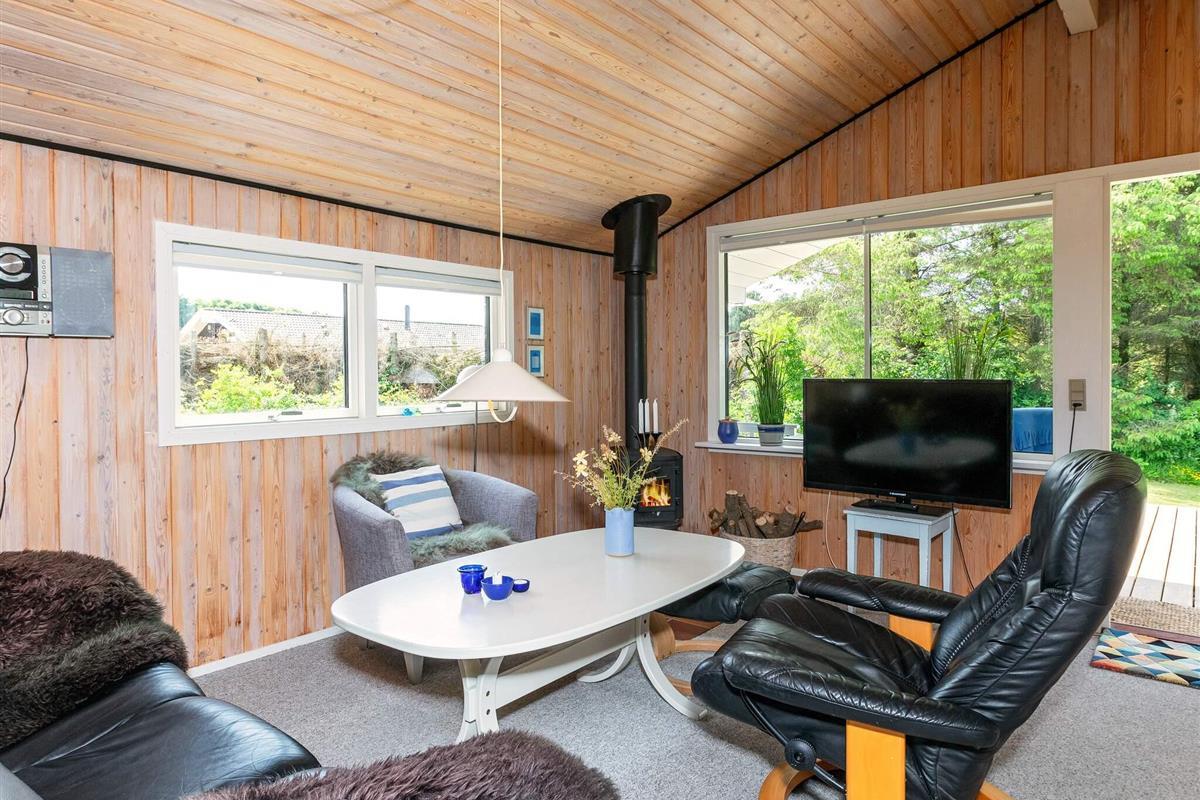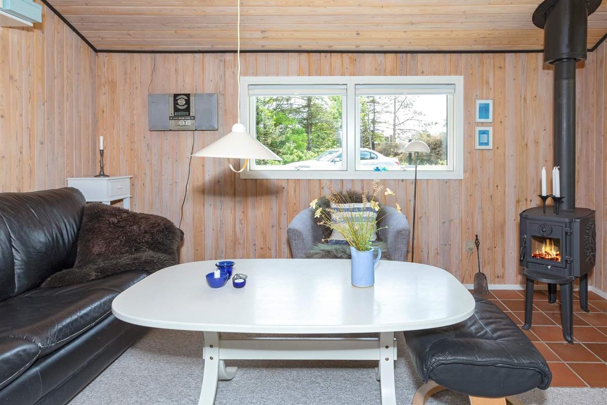 Das Ferienhaus ist mit einem schönen Wohnzimmer mit Holzofen in offener Verbindung zur Küche ausgestattet. Die Küche enthält u.a. Geschirrspüler. Darüber hinaus gibt es ein funktionelles Badezimmer und drei Schlafzimmer mit Etagenbetten bzw. Einzelbett. Im Haus befindet sich auch eine Waschmaschine.