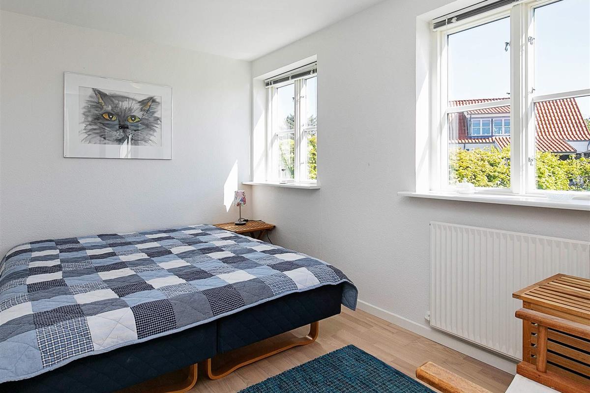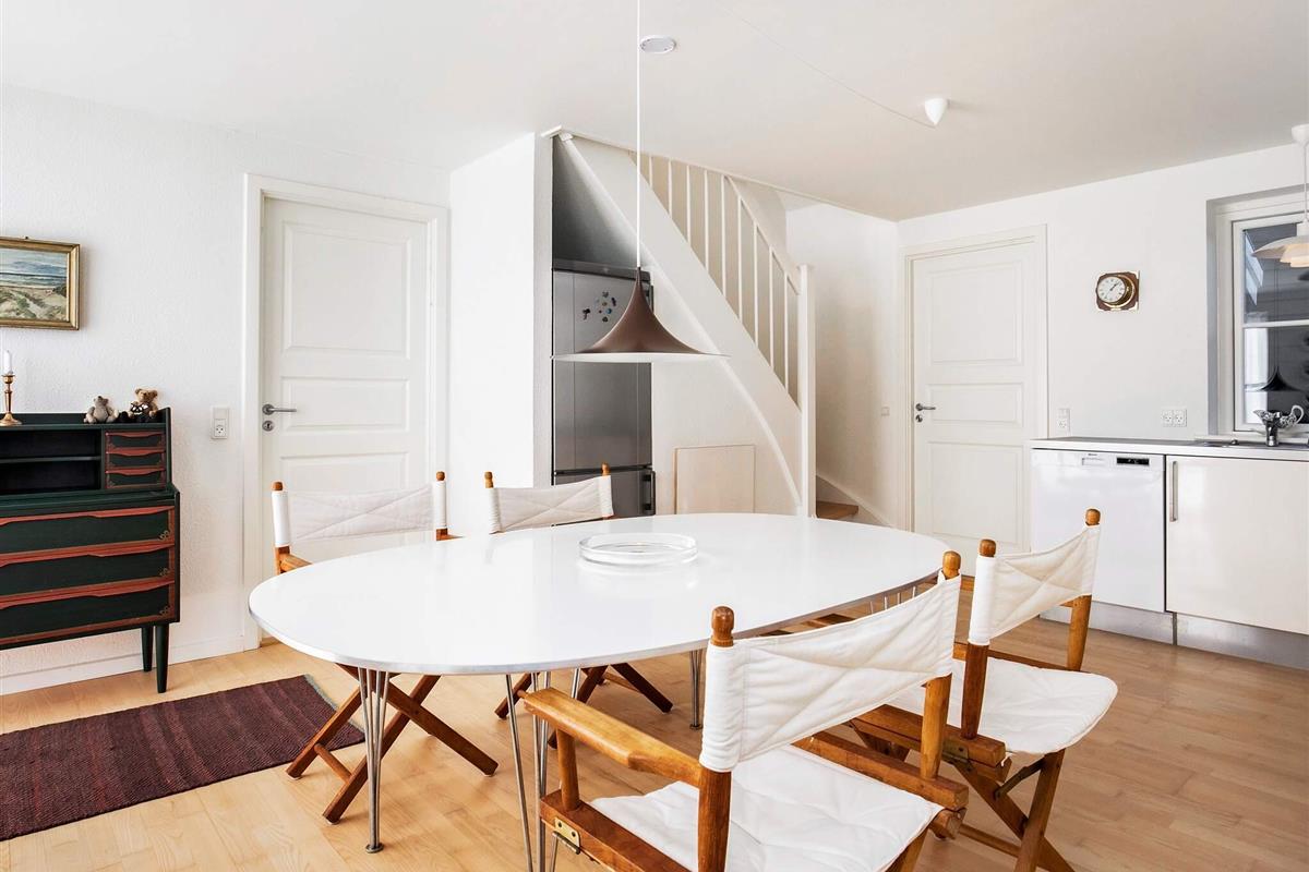 Im Parterre befinden sich ein geräumiger Küchen-/Essbereich sowie zwei Schlafzimmer, ein Badezimmer mit Fußbodenheizung und eine Eingangsdiele. In der oberen Etage findet man das Wohnzimmer und ein weiteres Schlafzimmer. Aufgrund der vielen großen Fenster im Haus ist das Wohnambiente besonders hell und einladend. Es gibt zudem viele schöne Details und moderne Annehmlichkeiten. Das Mobiliar wurde liebevoll ausgesucht und zusammengestellt, wobei eine gelungene Mischung aus teilweise Alt und Neu gelungen ist. Das Haus ist mit energiesparender Fernwärme ausgestattet.