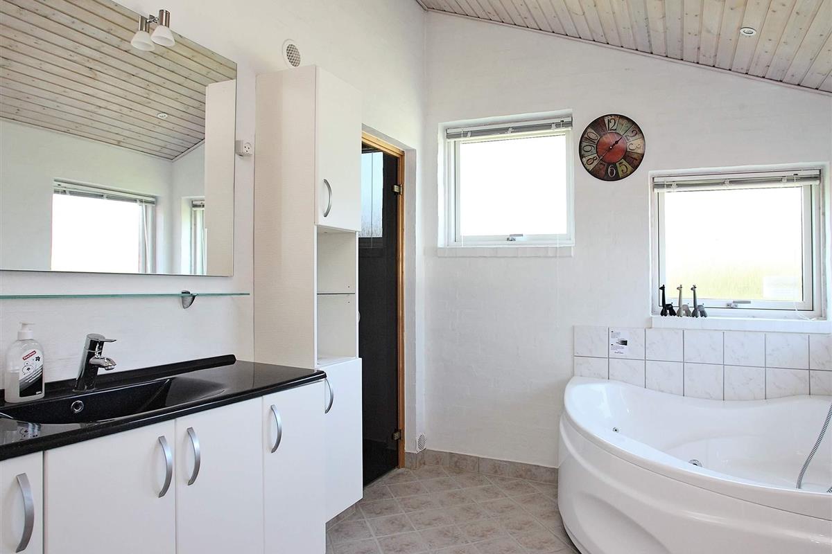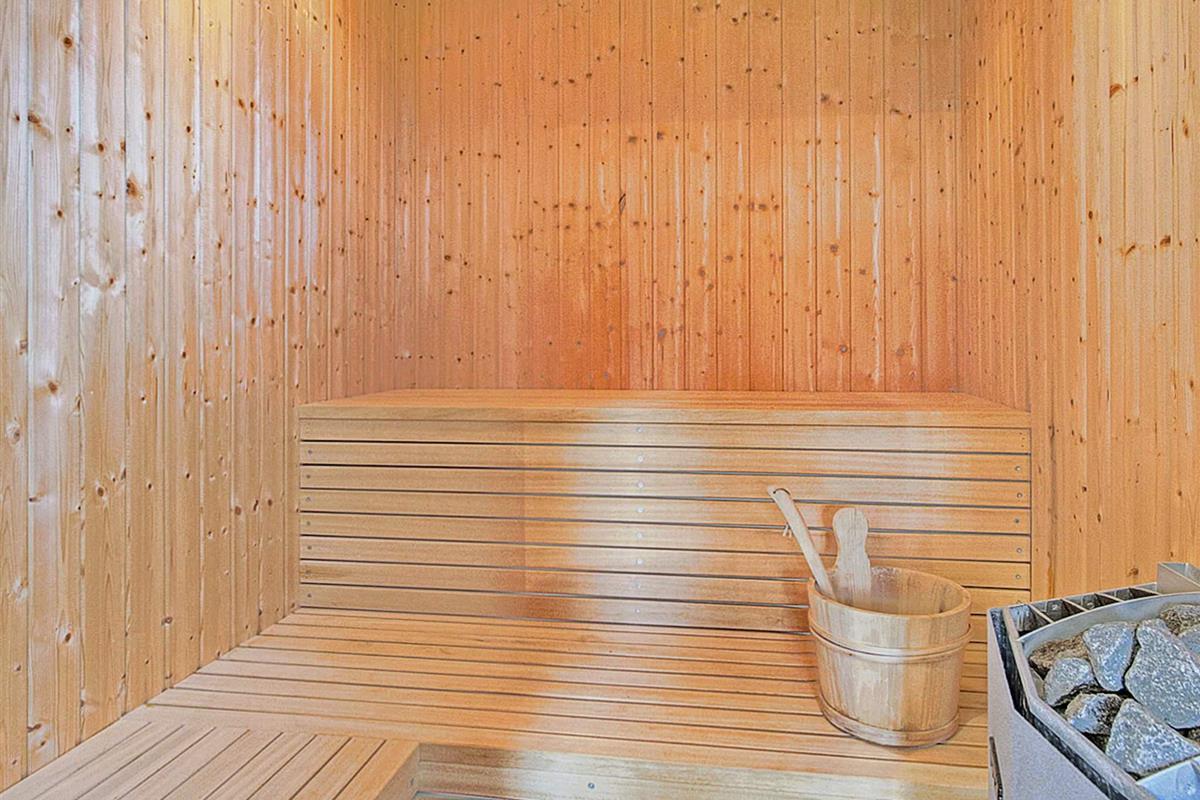 Geräumiges Ferienhaus mit Whirlpool, Sauna und viel Platz für den Familienurlaub. Zur umfassenden Ausstattung gehören ein offener Küchen-/Wohnbereich sowie vier Schlafzimmern, Badezimmer mit Whirlpool und Zugang zur Sauna, Gäste-WC mit Dusche, praktischer Hauswirtschaftsraum sowie eine teils überdachte Terrassenfläche.