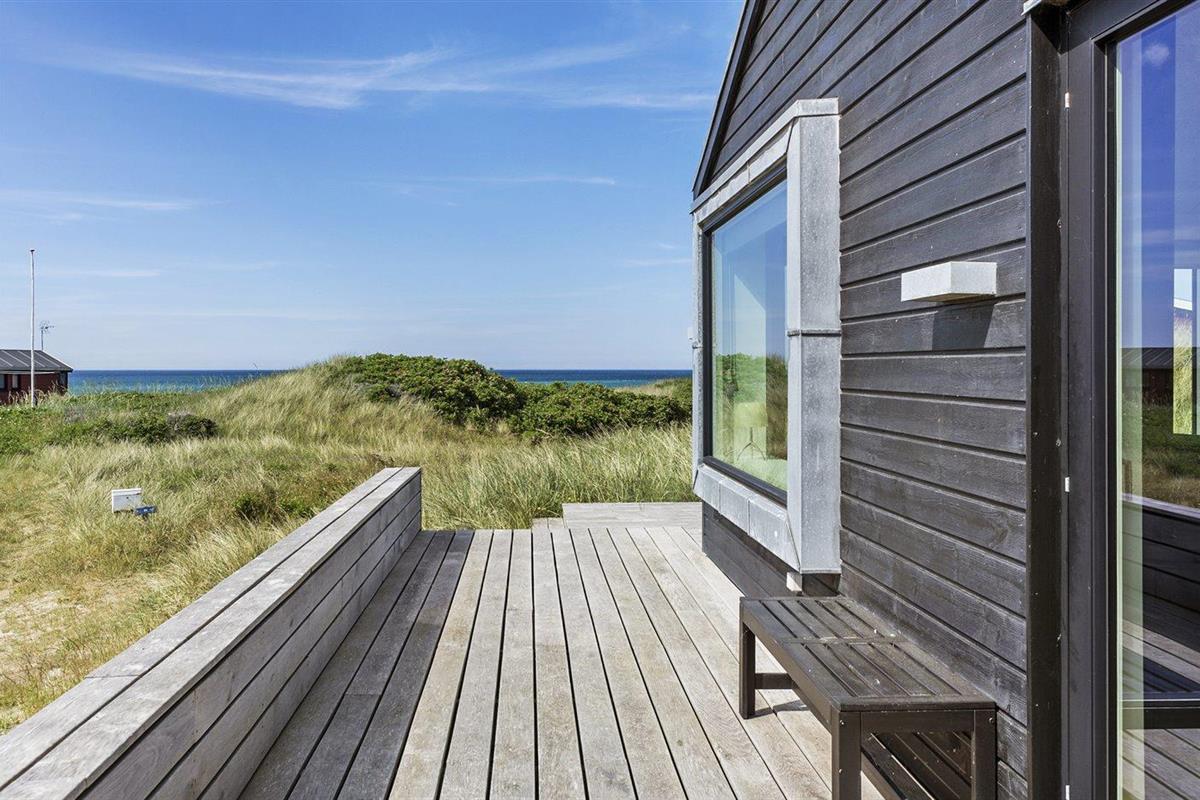 Modern vakantiehuis met zeezicht, groot terras en elektrische laadpaal in Lønstrup, Denemarken.