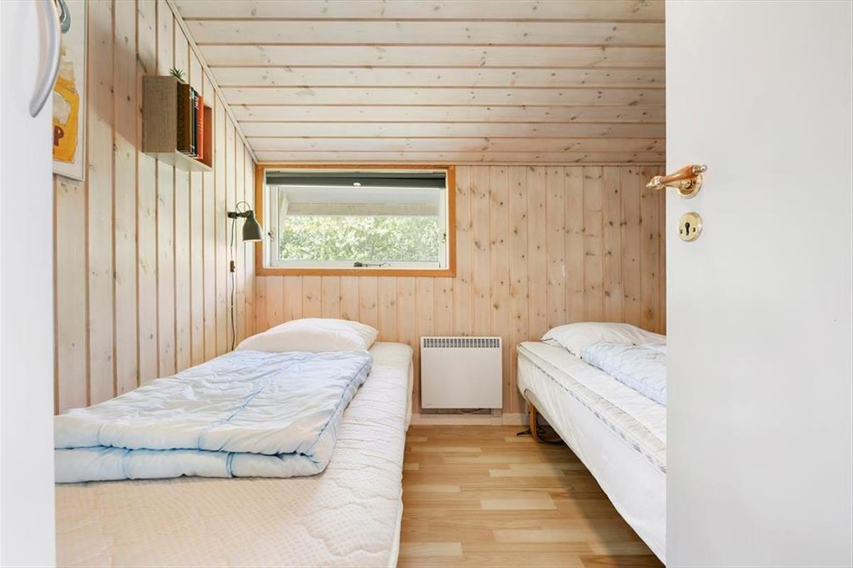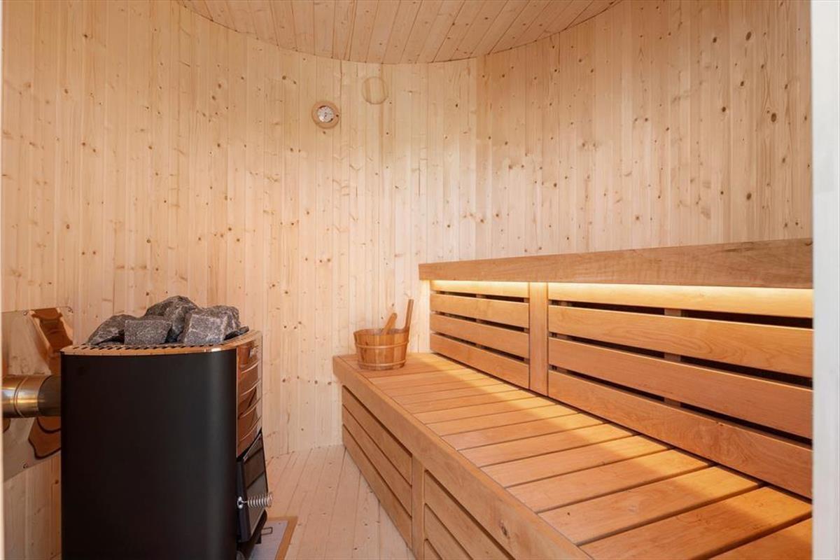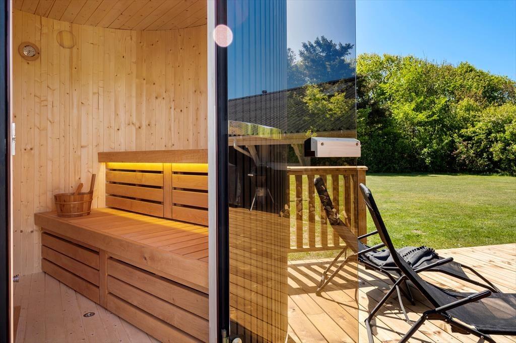 Die beiden Schlafbereiche sind durch einen kleinen Flur mit einer gemütlichen Sitzecke und Ausblick in den Garten getrennt. Das Haus verfügt über ein Gäste-WC und ein großes Badezimmer mit Whirlpool und Sauna – und jetzt auch über exklusiven Wellnesskomfort im Außenbereich.