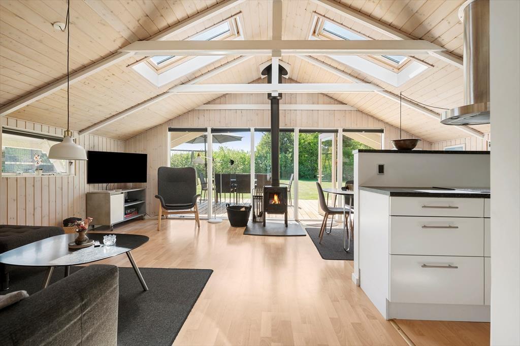 Vom Eingangsbereich gelangen Sie direkt in die helle, praktische Küche, die offen in das Wohnzimmer übergeht. Hier finden Sie alles, was Sie für die Zubereitung eines köstlichen Ferienessens benötigen. Das Wohnzimmer ist modern und einladend eingerichtet – von hier aus haben Sie Zugang zur überdachten Terrasse mit Blick in den Garten.