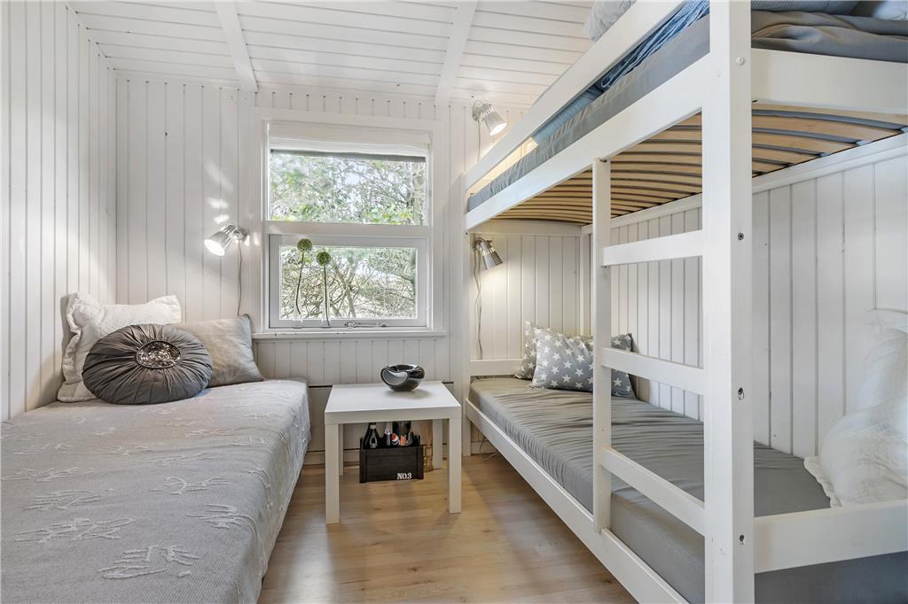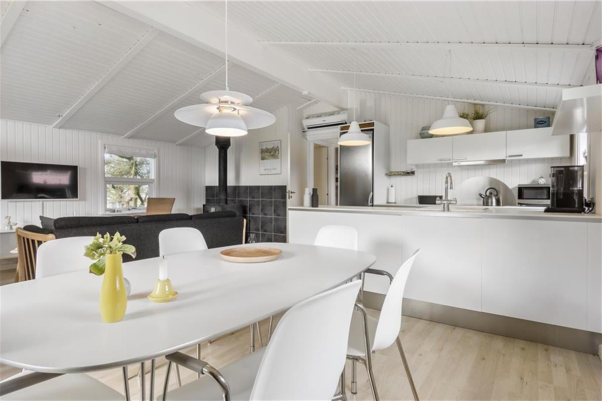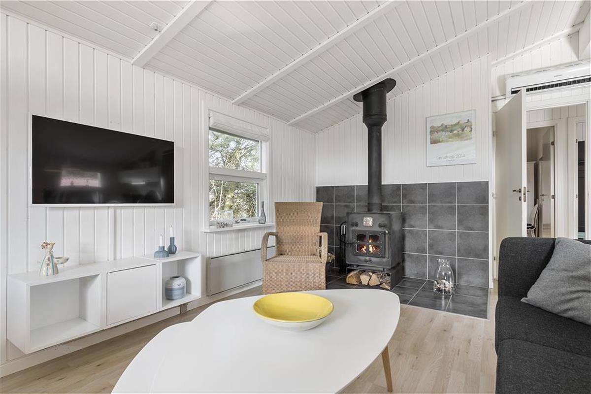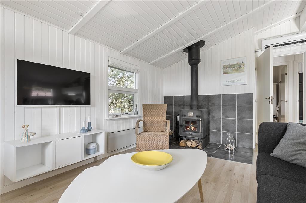 Das hell eingerichtete Ferienhaus empfängt Sie mit einer modernen Möblierung. Die hohen Decken verleihen dem Wohnbereich ein luftig, leichtes Wohnambiente. Ihnen stehen ein Schlafraum mit einem Doppelbett und ein Schlafraum mit einem Etagenbett und einem Einzelbett zur Verfügung. Das eher kleine Badezimmer ist ansprechend und funktionell gestaltet. Der gute Geschmack des Hauseigentümers und sein Sinn für das Detail, sind bis in jeden Winkel zu verspüren. Die gemütliche Ferienhausstimmung wird durch das romantische Knistern des Feuers im Kamin wunderbar untermalt. Vom Wohnbereich genießen Sie direkten Zugang zu einer der beiden überdachten Terrassen.