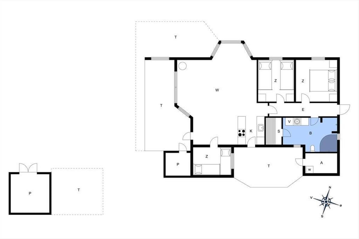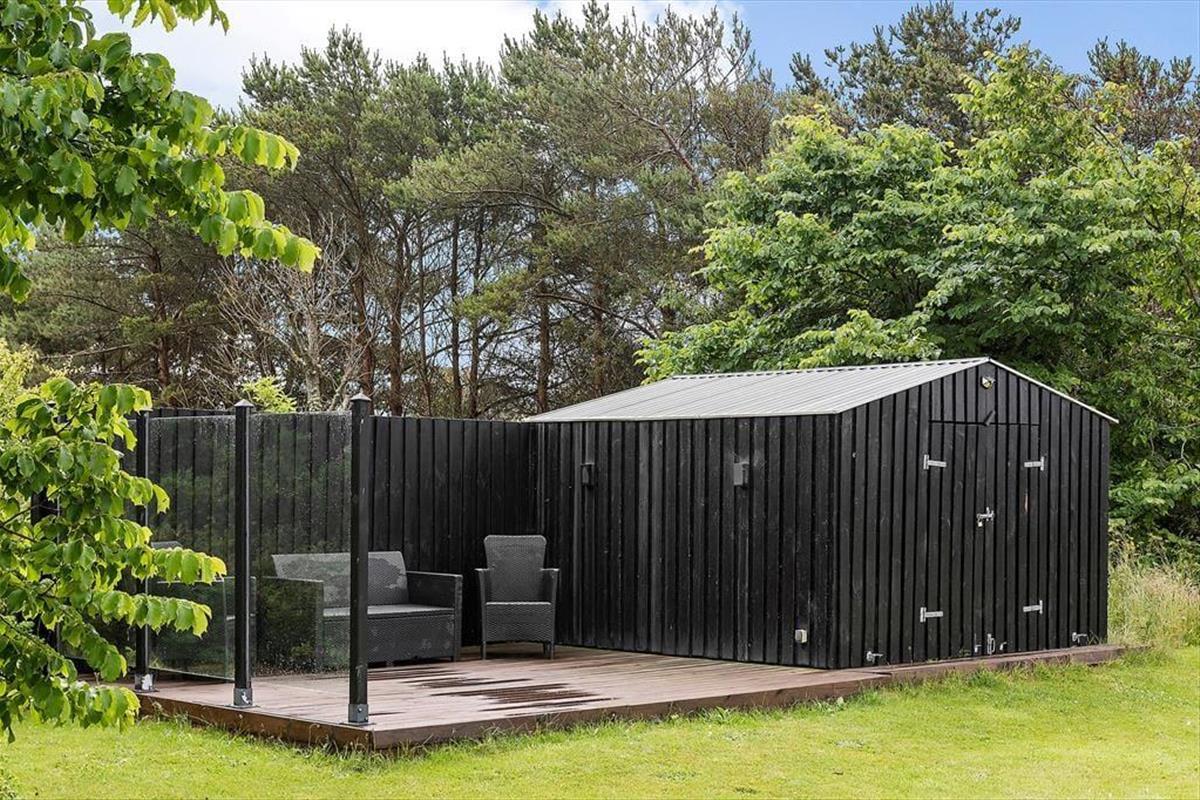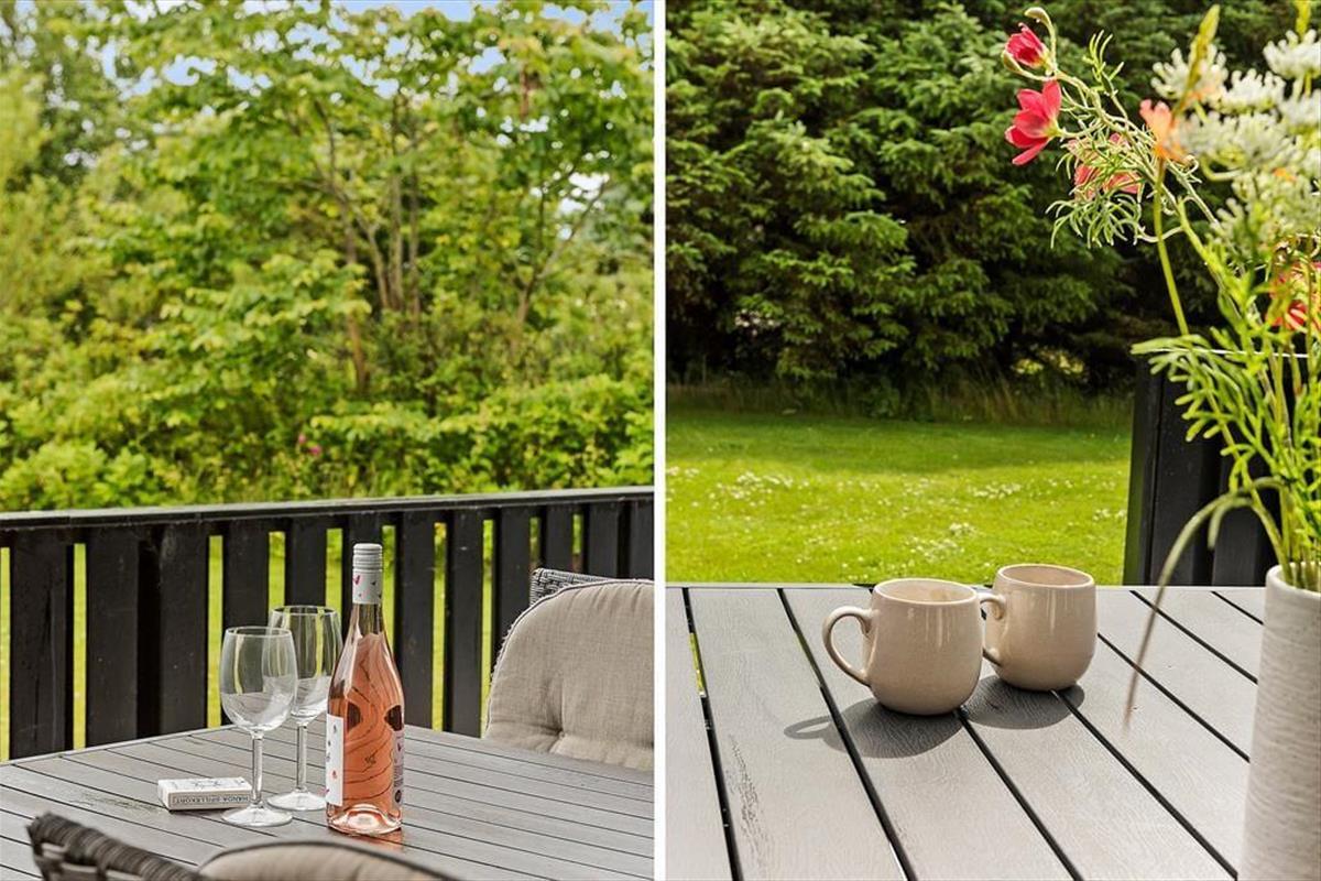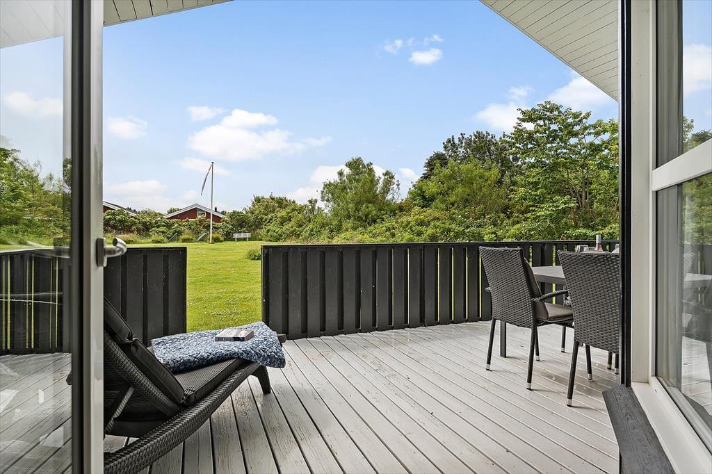 Das Ferienhaus liegt auf einem großen Gartengrundstück mit viel Platz zum Spielen und anderen Aktivitäten. Das Grundstück ist umgeben von einer guten Randbepflanzung, die somit für einen hervorragenden Wind- und Sichtschutz garantiert. Vom Wohnzimmer gelangen Sie durch eine Tür auf die große Terrasse, von der in den Garten geblickt wird, und neben der Küche befindet sich eine schöne Ostterrasse.