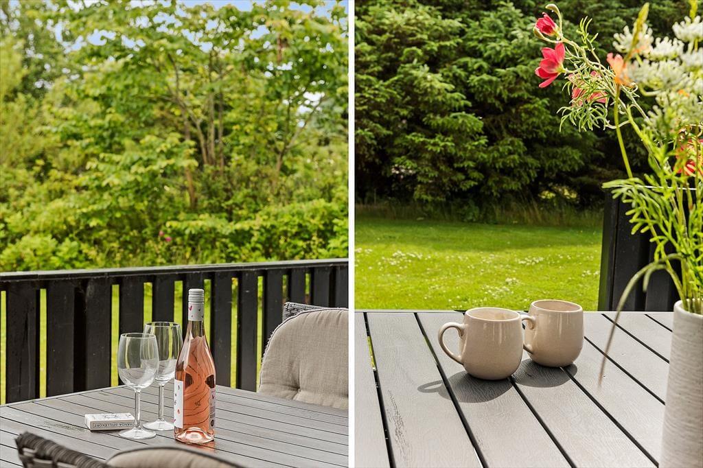 Das Ferienhaus ist geschmackvoll und in hellen Farbtönen eingerichtet, sodass ein einladendes Ambiente entsteht. Gute Lichtverhältnisse aufgrund der großen Wohnzimmerfenster. Das Badezimmer verfügt über einen Whirlpool und eine Sauna. Von der Küche wird die geschlossene Südterrasse betreten, auf der Sie windgeschützt die Morgensonne genießen können. Vom Wohnzimmer haben Sie Zugang zu einer teils überdachten Terrasse. Von hier haben Sie einen wunderschönen Blick in den Garten mit einem Schaukelgerüst für die kleinsten Familienmitglieder. Sollte es draußen zu kalt sein, ziehen Sie sich ins Haus zurück und zünden ein Feuer im Kamin an, das die gemütliche Stimmung komplettiert.
