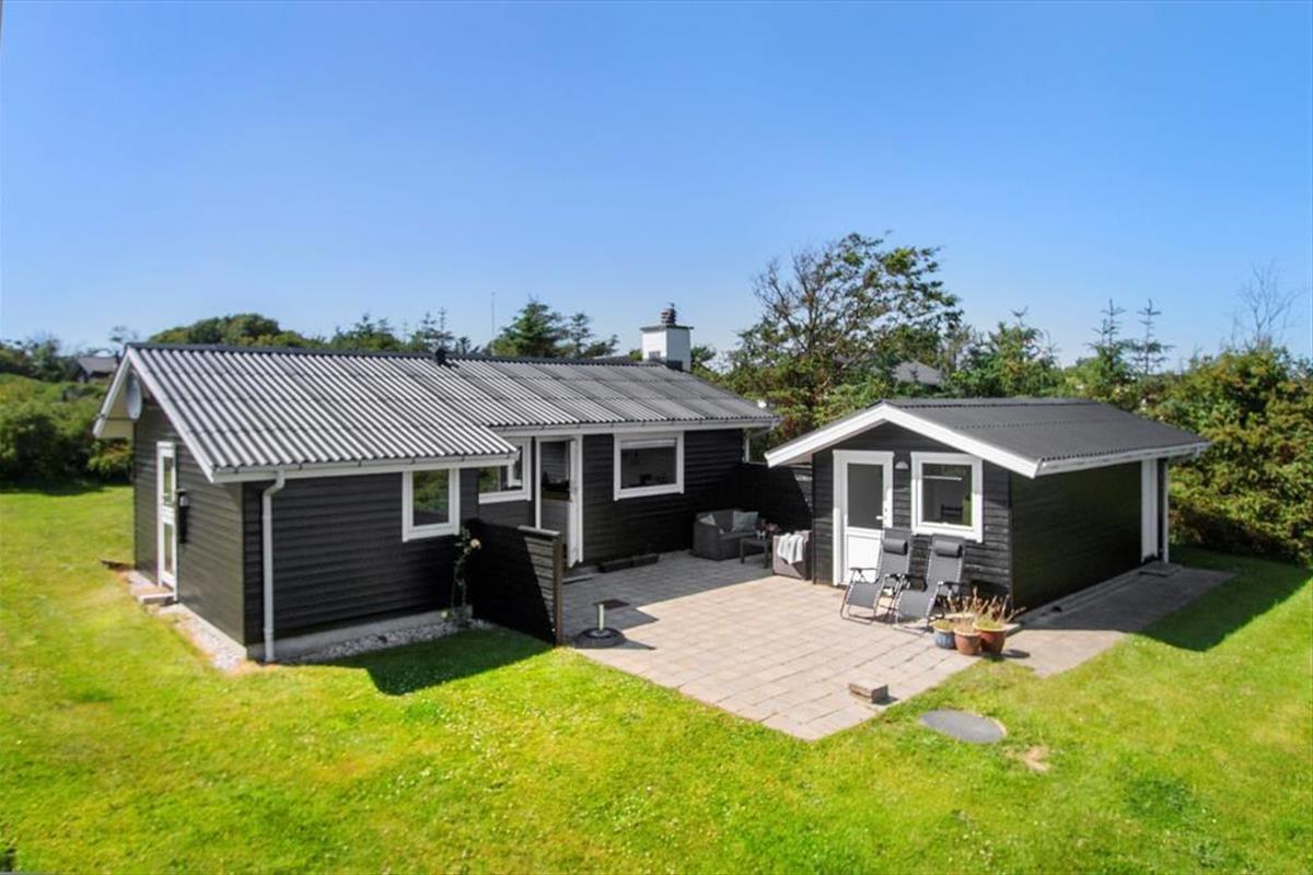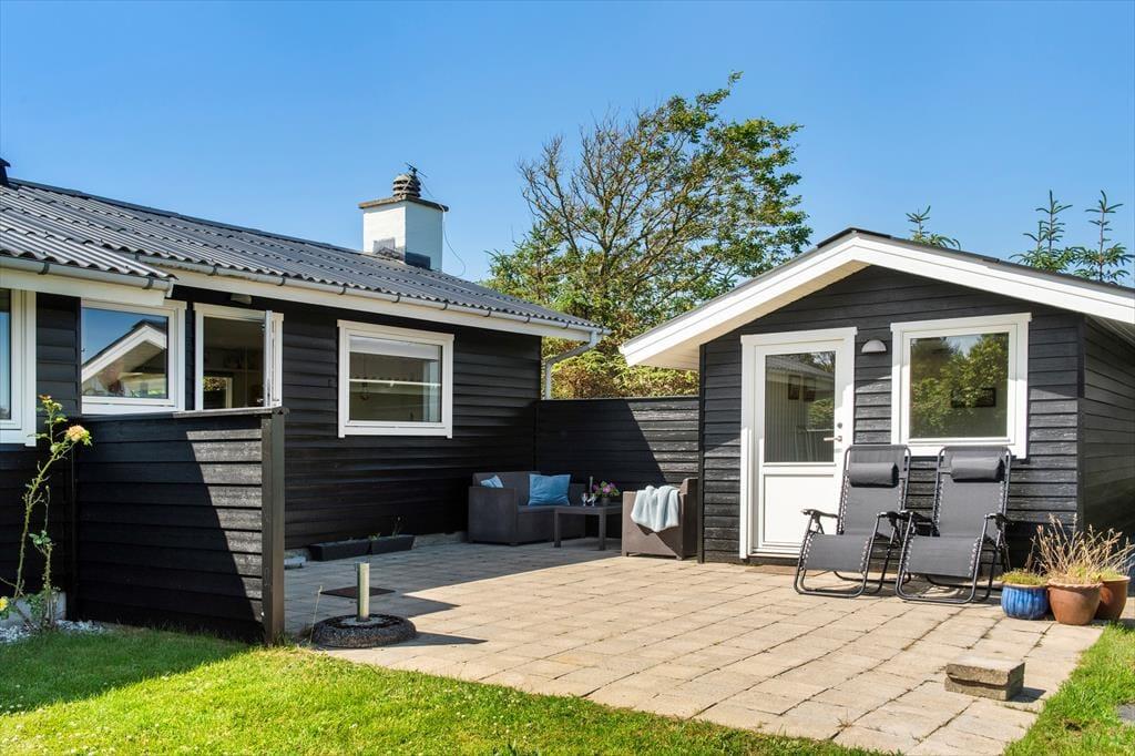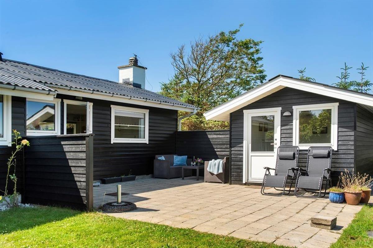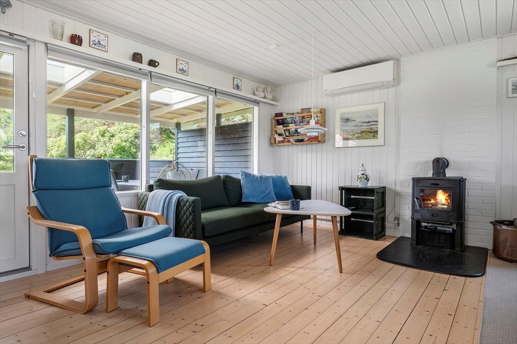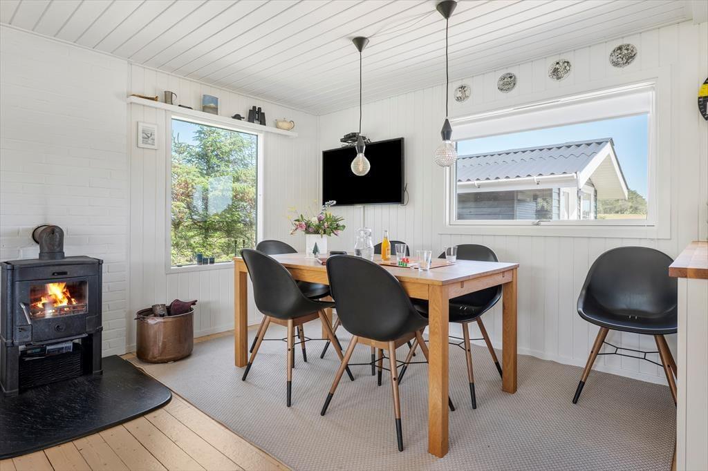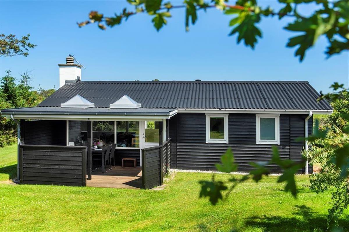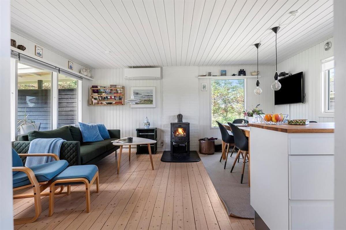 Von außen erinnert dieses Ferienhaus mit seiner dunklen Holzfassade und den weißen Sprossenfenstern an die ganz klassischen dänischen Ferienhäuser vergangener Tage. Als klassisch kann auch der Innenbereich bezeichnet werden, der mit seinen weiß gestrichenen Holzwänden und dem Kaminofen im Wohnzimmer viel Gemütlichkeit ausstrahlt. Zahlreiche moderne Annehmlichkeiten werten dieses Haus jedoch maßgeblich auf. So erwarten Sie beispielsweise eine tolle Küche und ein durch moderne Möbel geprägter Wohnraum. Zu den herrlichen kleinen Details dieses Hauses zählt die attraktive Aussicht, die Sie beim Zubereiten der Mahlzeiten durch das Küchenfenster an der Spüle genießen können. Beim Blick über die grüne, üppige Landschaft erledigt sich der Abwasch nahezu von ganz allein. Zur Wohnfläche zählen des Weiteren ein gutes Badezimmer und zwei Schlafräume. Bei Bedarf können Sie selbstverständlich auch das zusätzlich im Nebengebäude untergebrachte Doppelbett nutzen.