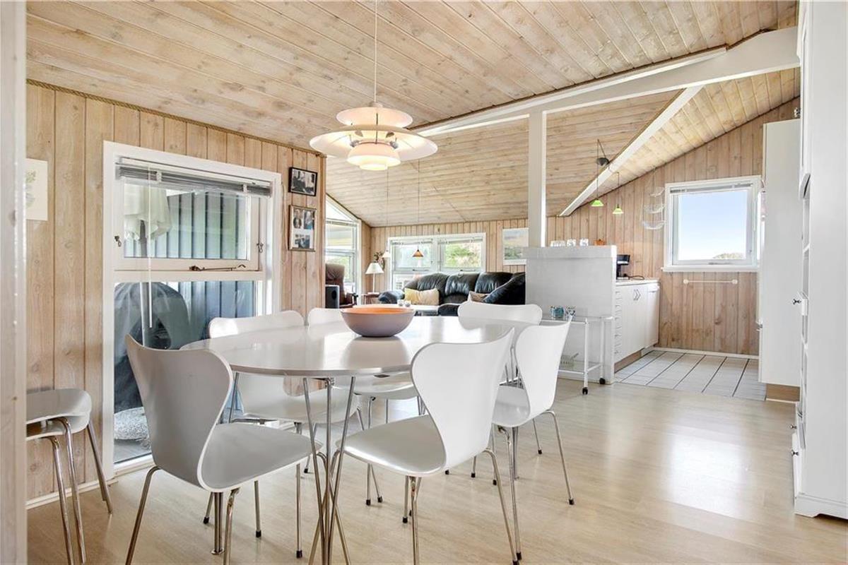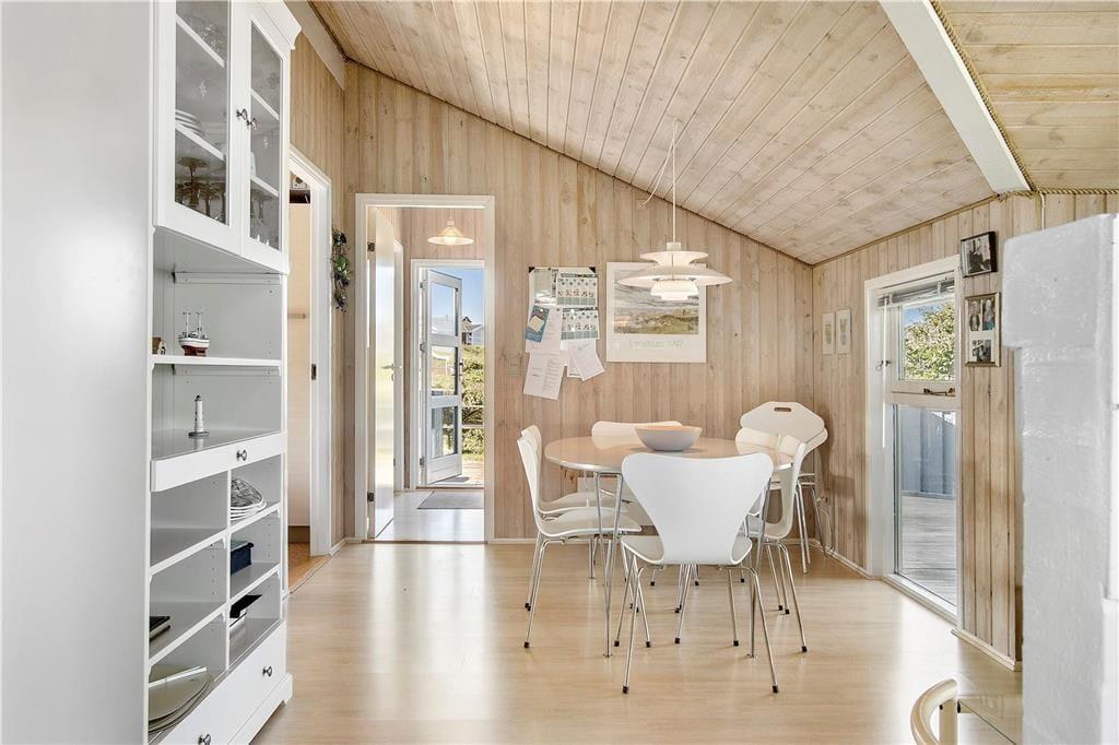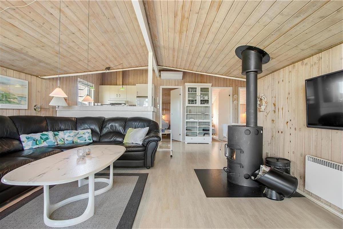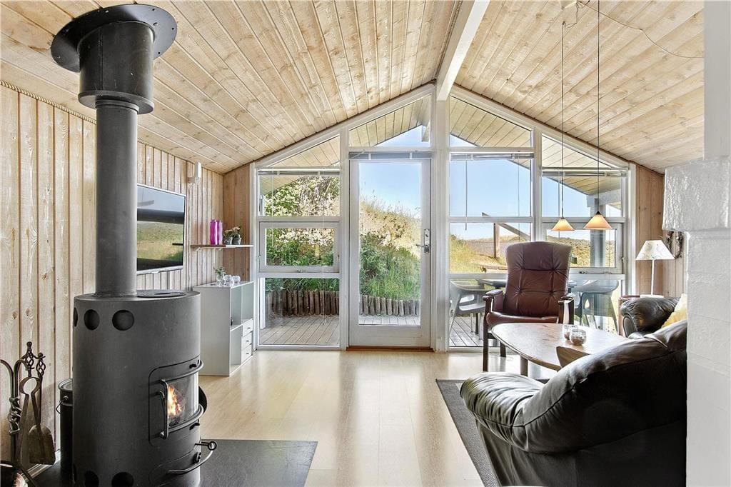 Wenn die Anreise durch die schöne Umgebung mit duftenden Heckenrosen, wogendem Strandhafer und sanften Dünen bei Ihnen noch nicht die richtige Urlaubsstimmung geweckt haben sollte, dann wird sich diese spätestens beim Betreten dieses schönen Ferienhauses einstellen. Der Wohnbereich empfängt Sie mit einer wunderschönen Atmosphäre. Helle Holzverkleidungen an den Wänden, hohe Decken, ein Kaminofen und viele andere reizende Details sorgen für das klassische, typisch dänische Ferienhausambiente. Durch die Fenster blicken Sie zudem hinaus in die schöne Natur. Die Wohnfläche umfasst drei gute Schlafräume mit je einem Doppelbett und ein ansprechendes Badezimmer, das über eine Duschnische und eine Waschmaschine verfügt. Der Wohnraum und die Küche bilden eine harmonische offene Einheit, sodass Sie selbst bei der Zubereitung der Mahlzeiten wunderbar ins Familiengeschehen im Wohnraum integriert beleiben.