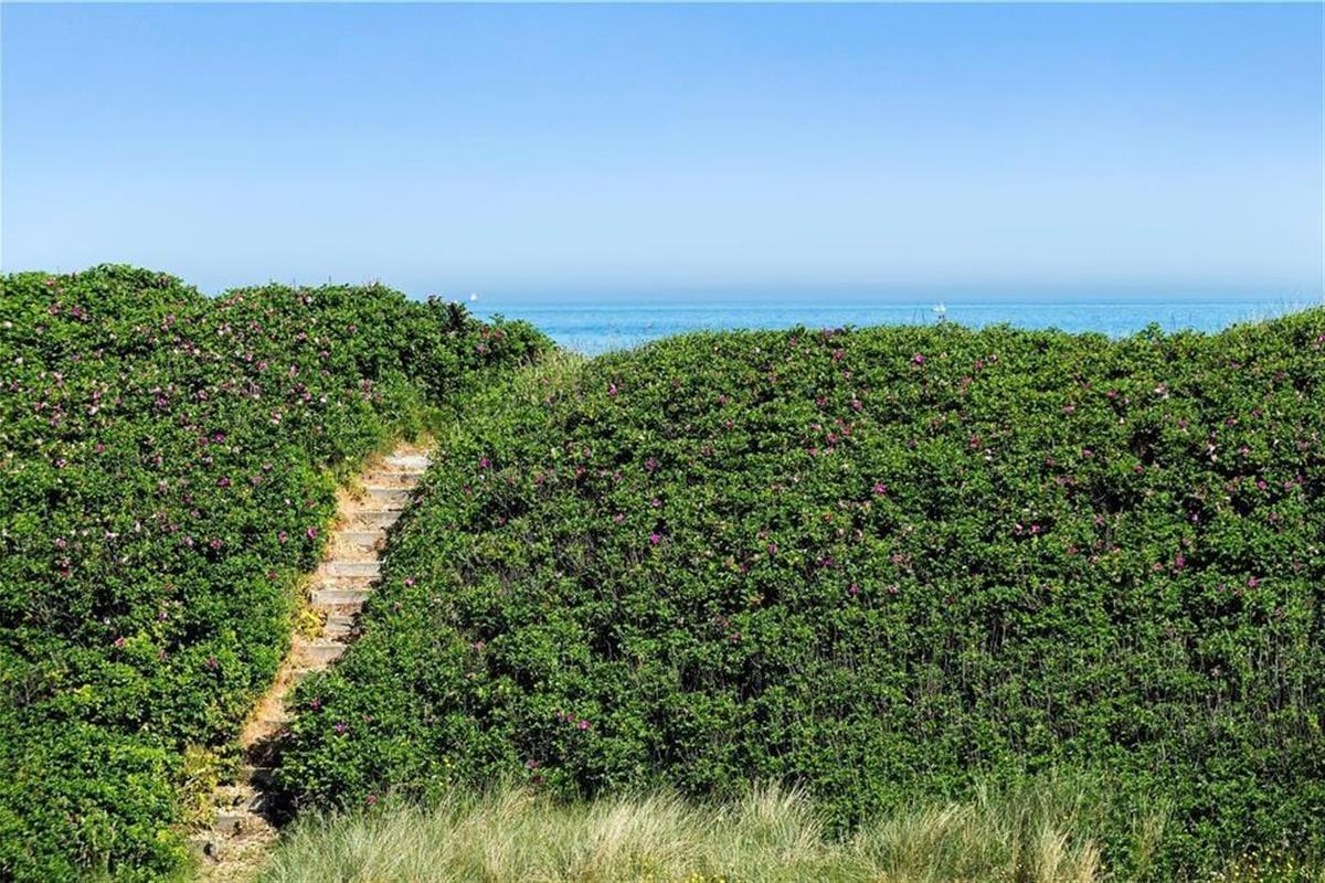 Auf dem hügeligen Naturgrundstück ist es ein Leichtes, ein sonniges Plätzchen zu finden. Rund um das Haus locken gleich mehrere Terrassenbereiche, zwischen denen Sie sich je nach Stand der Sonne entscheiden können. Hinzu gesellt sich ein überdachtes Areal, auf dem Sie im kühlen Schatten das ein oder andere Nickerchen halten können. Weitere schöne Sitzgelegenheiten finden sich in Form einer Picknickgarnitur auf der Grasfläche oder der kleinen Bank, die ganz oben auf dem Grundstück liegt und über eine Treppe erreichbar ist. Auf dieser Bank können Sie sich in aller Ruhe niederlassen, den Duft der Heckenrosen und des Meeres genießen und sich prächtig entspannen und erholen.
