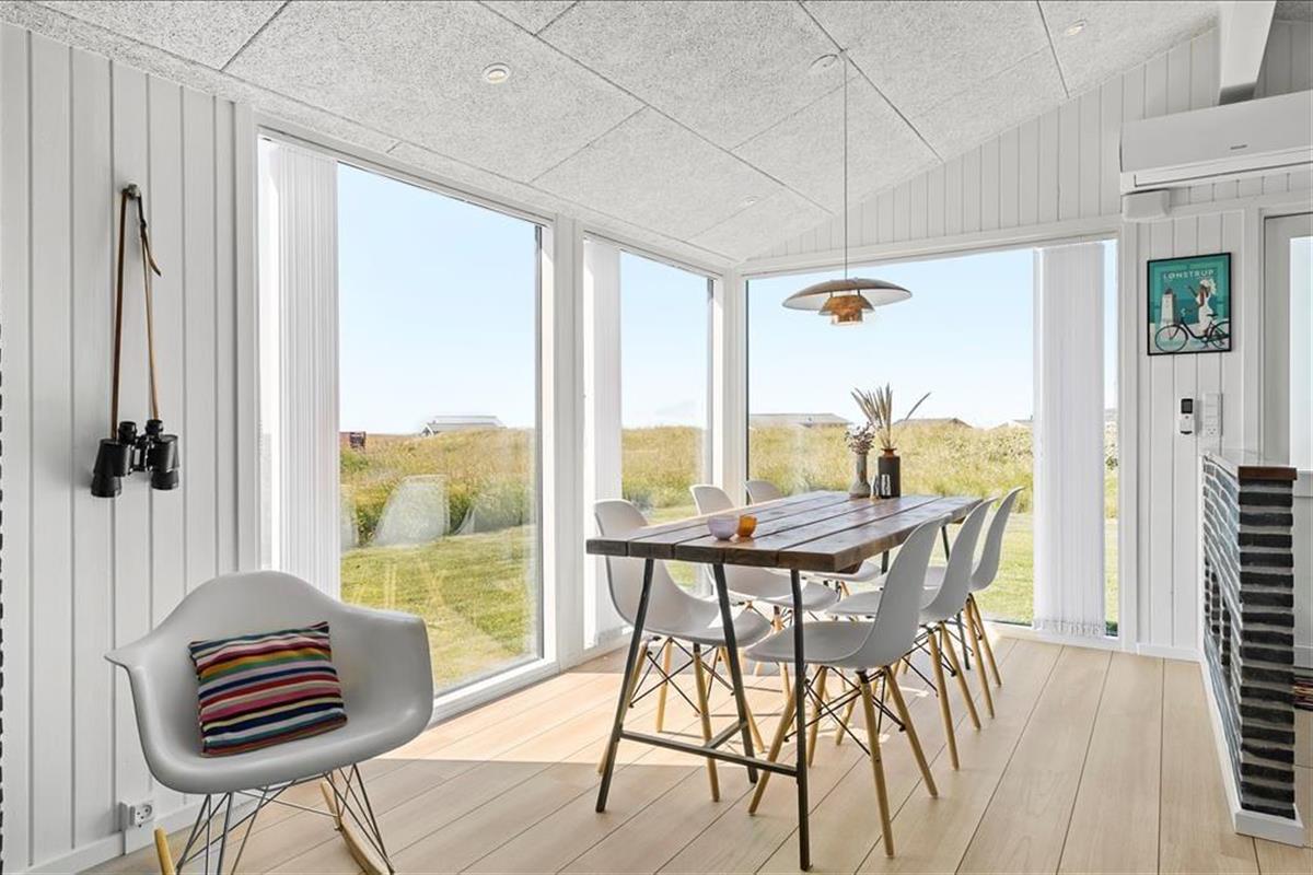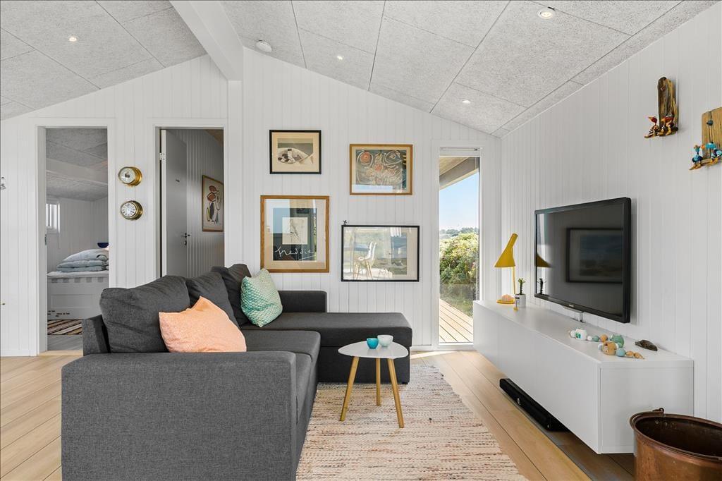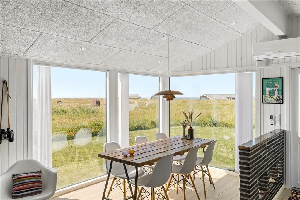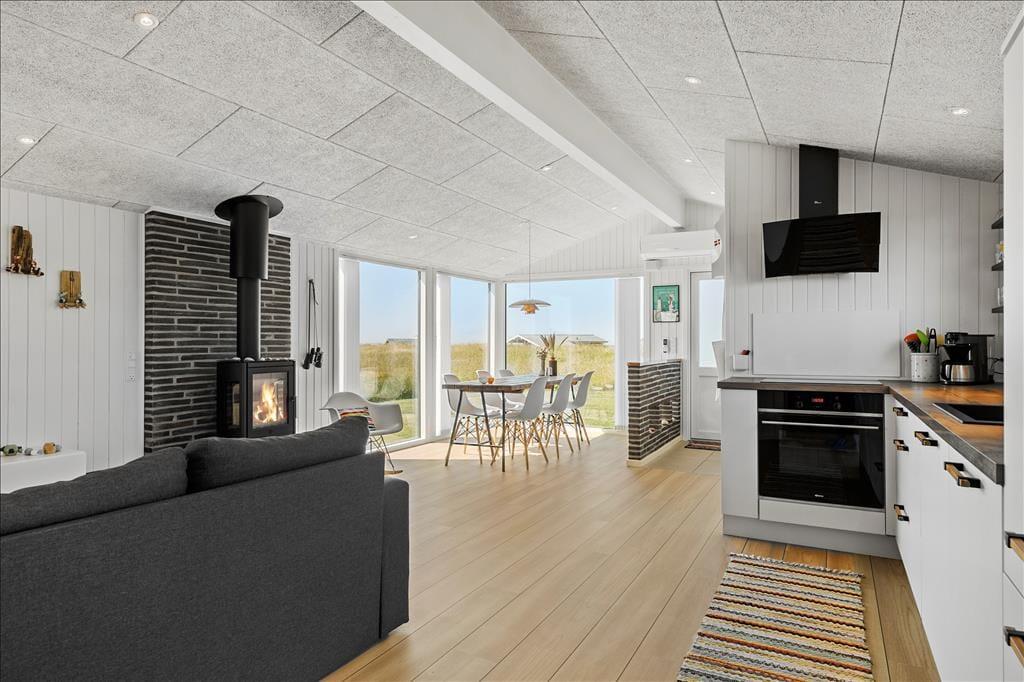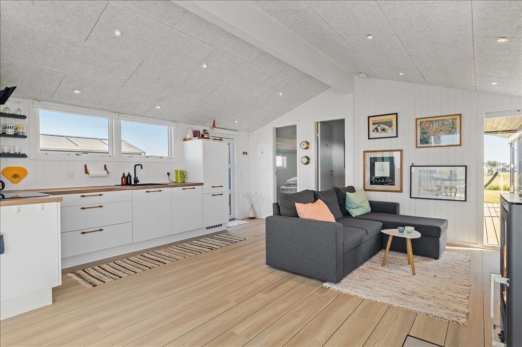 Im Zuge der Renovierung im Jahr 2019 wurde offensichtlich kräftig angepackt. Die Einrichtung ist ausgesprochen schön und geschmackvoll - jedoch in gedämpfter Art und Weise, sodass die Räume auch jetzt, nach der Renovierung, noch der absolute Inbegriff von Gemütlichkeit und echtem Ferienhauscharme sind. Alle Räumlichkeiten präsentieren sich Ihnen schön und ansprechend. Die Ästhetik des Badezimmers und der beiden Schlafräume ist nicht weniger beeindruckend als die des großen Aufenthaltsraumes. Der Aufenthaltsraum, der die Küche und den Wohnraum in sich vereint, besticht mit einem Tageslichteinfall aus drei Himmelsrichtungen und einer imposanten Aussicht: Die großen Panoramafenster beim Esstisch sind direkt zum Meer und zur Küstenlinie ausgerichtet, die lediglich 150 Meter vom Haus entfernt liegen. Wenn Sie es sich nach einem guten Essen in der Sofaabteilung gemütlich machen, genießen Sie durch das schmale, nach Süden ausgerichtete Fenster einen schönen Blick auf den berühmten Leuchtturm Rubjerg Knude Fyr.