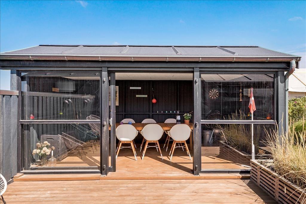 An schönen Sommertagen wird es Sie unwiderstehlich hinaus auf die herrliche Holzterrasse ziehen. Diese schmiegt sich an mehrere Seiten des Hauses und lässt Ihnen die freie Wahl zwischen offenen, überdachten und schön abgeschirmten Bereichen. Ein Teil der Terrasse ist komplett geschlossen und nimmt damit beinahe die Funktion eines Wintergartens ein, in dem es sich perfekt während der hellen Sommerabende und sonnigen Frühjahrstage aushalten lässt.