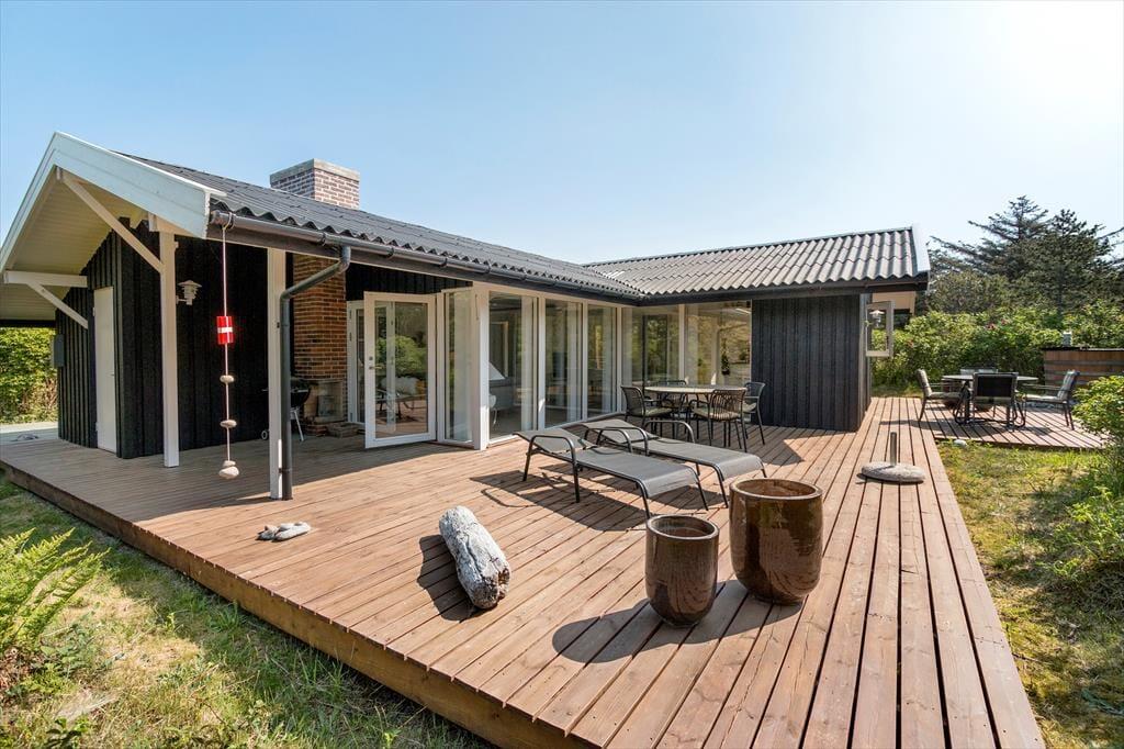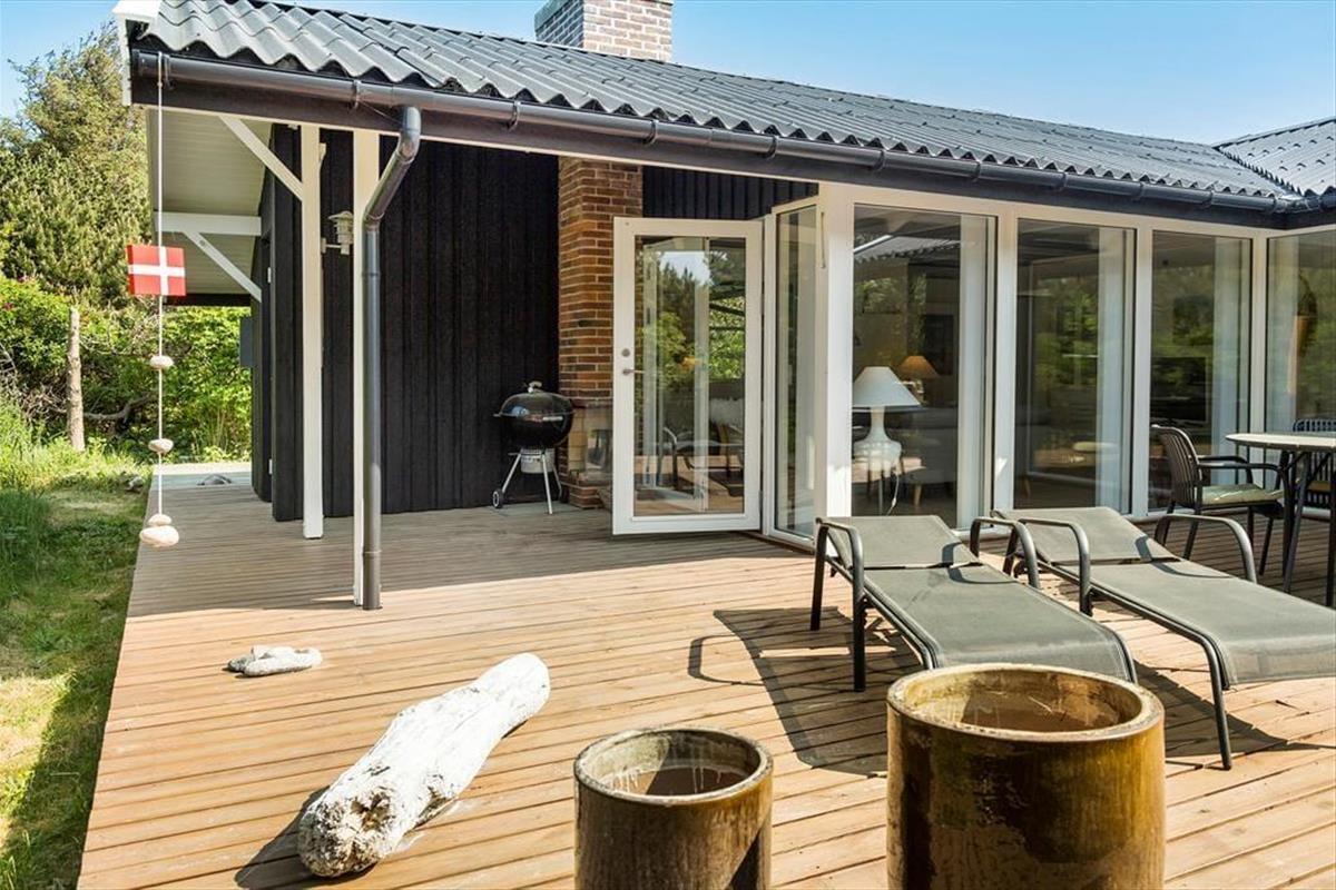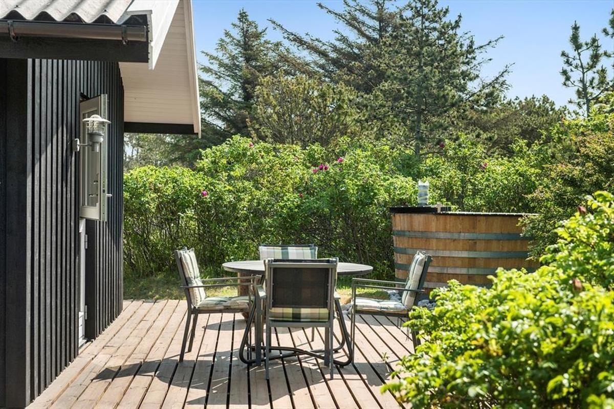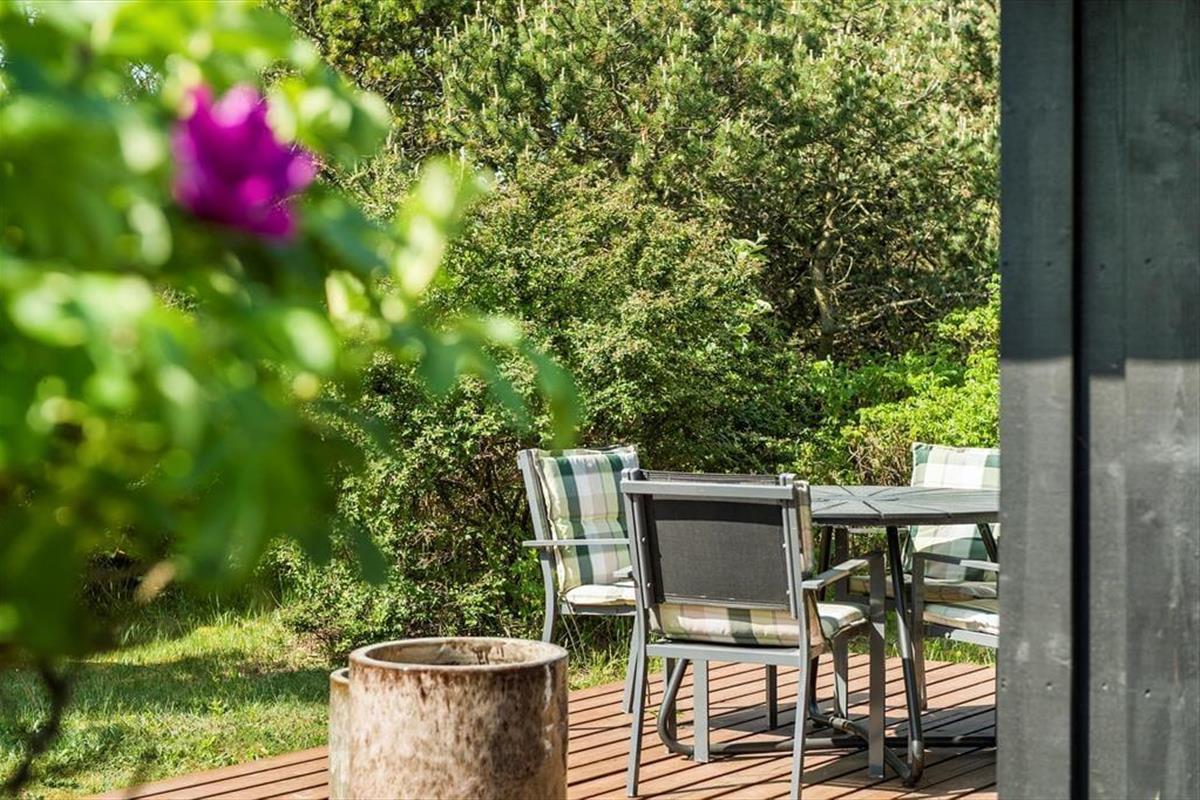 Ein schönes Terrassenareal umgibt drei Seiten des Mietobjektes. Heckenrosen, Krüppelkiefern und anderer natürlicher Bewuchs schirmen die Terrasse gut vor Wind ab. Gute Gartenmöbel und Liegestühle sind vorhanden. Ein überdachter Terrassenbereich und die Feuerstelle laden zu stimmungsvollen Abenden ein.