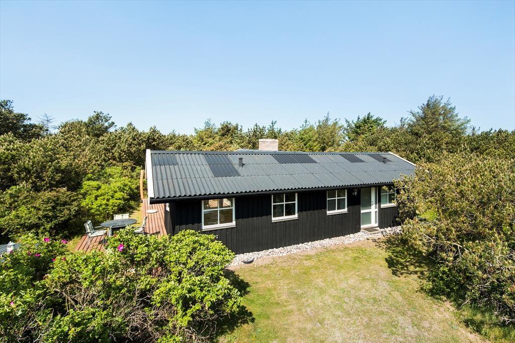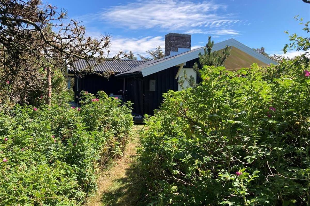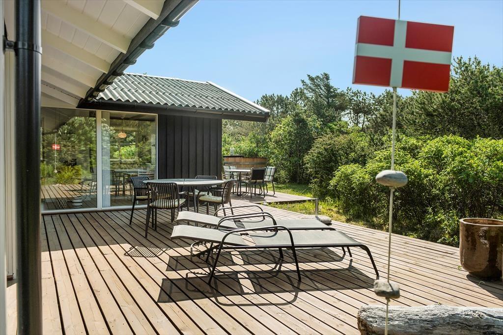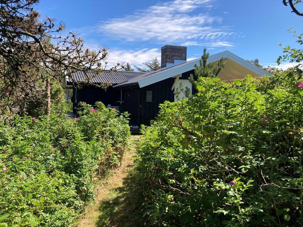Ein schönes Terrassenareal umgibt drei Seiten des Mietobjektes. Heckenrosen, Krüppelkiefern und anderer natürlicher Bewuchs schirmen die Terrasse gut vor Wind ab. Gute Gartenmöbel und Liegestühle sind vorhanden. Ein überdachter Terrassenbereich und die Feuerstelle laden zu stimmungsvollen Abenden ein.