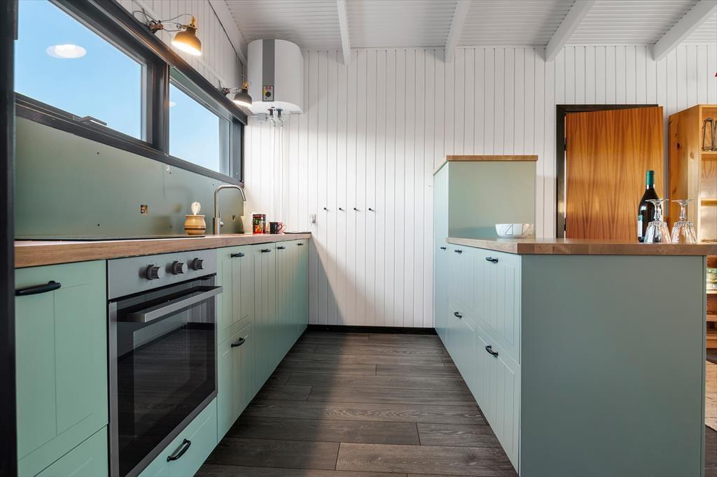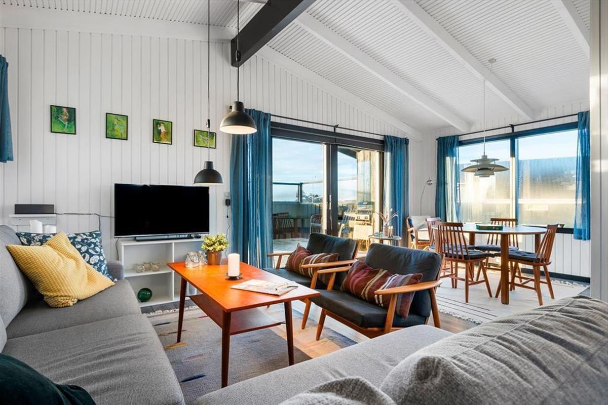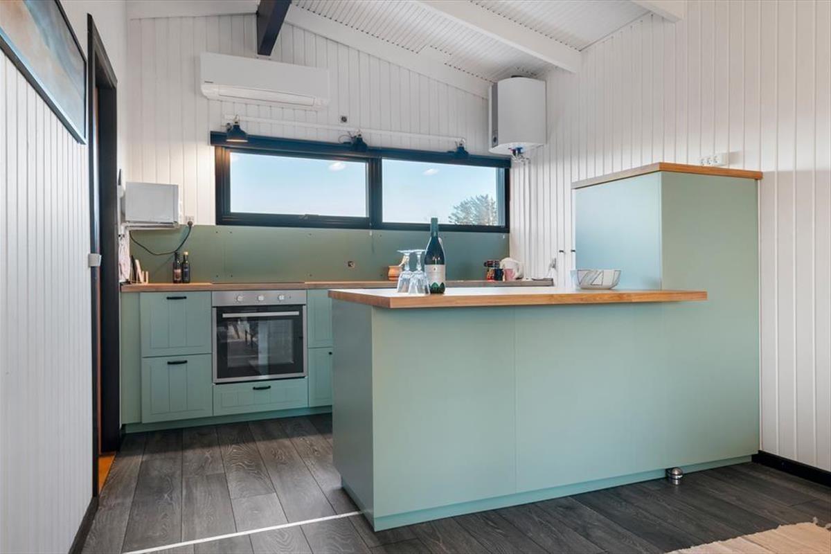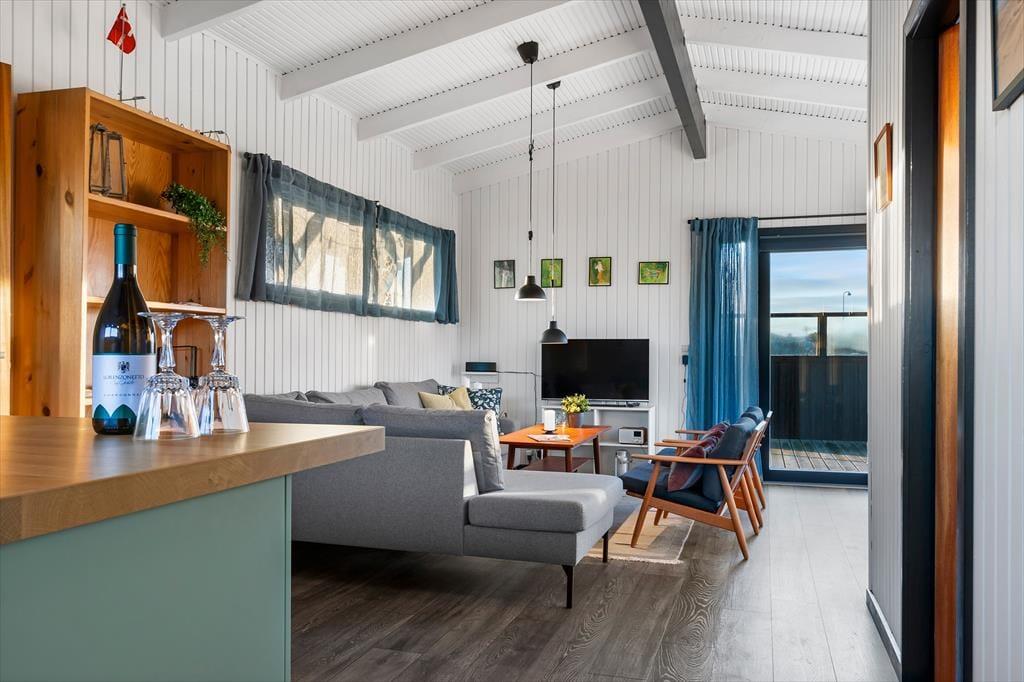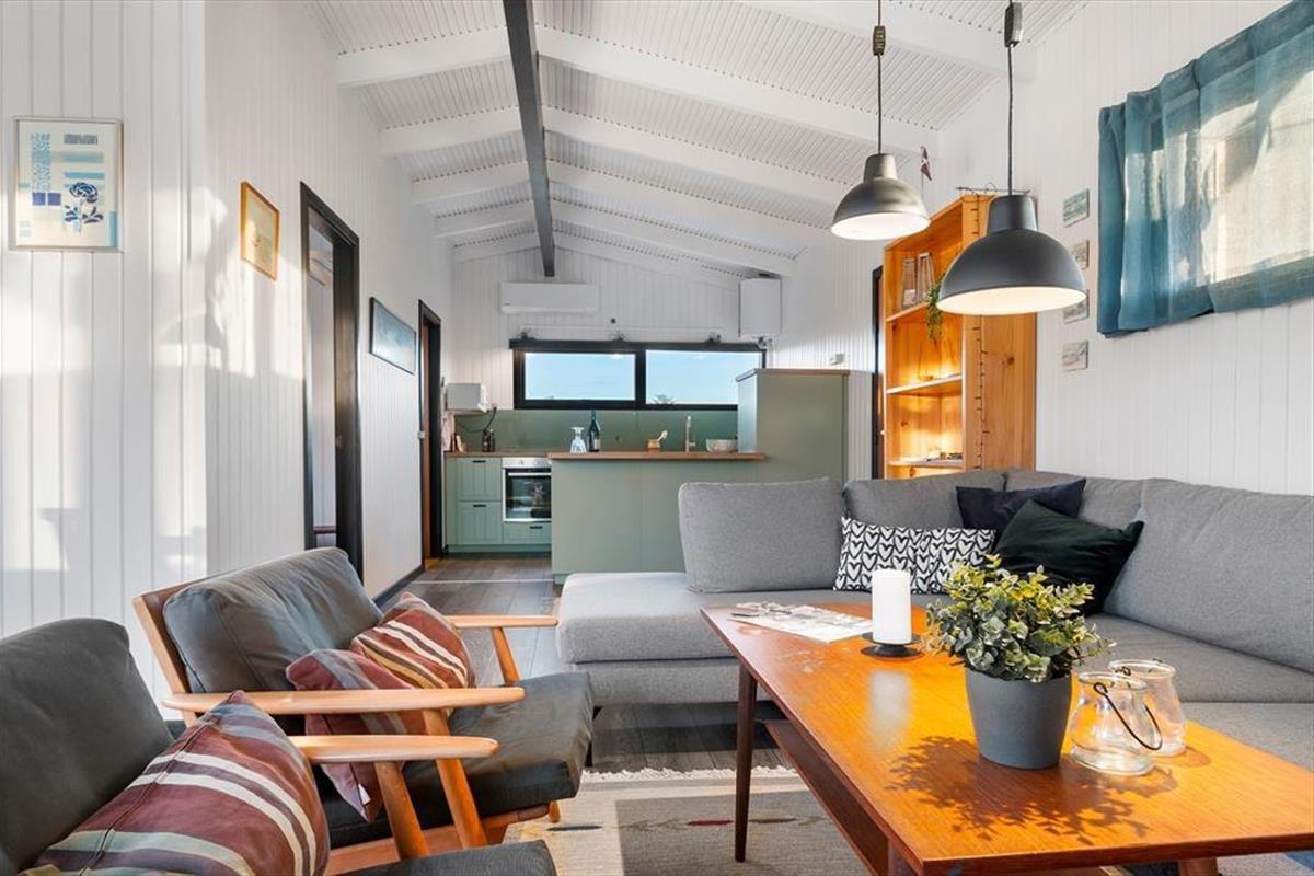 Das Haus bietet eine helle und einladende Atmosphäre und wurde mit großem Respekt für den ursprünglichen Ferienhausstil renoviert. Der offene Wohnbereich, der mit der Küche verbunden ist, schafft den idealen Rahmen für gemütliches Beisammensein. Es gibt sowohl einen Essbereich als auch eine Sofaecke, und das hohe Deckenprofil zusammen mit den großen Fensterpartien sorgt für Licht und Luft. Die Küche ist älteren Datums, jedoch voll funktional und harmoniert optisch perfekt mit dem restlichen Interieur. Eine Bar mit Hockern lädt dazu ein, ein Glas Wein zu genießen, während das Essen auf dem Herd köchelt. Das Haus verfügt zudem über zwei Schlafzimmer und ein Badezimmer.