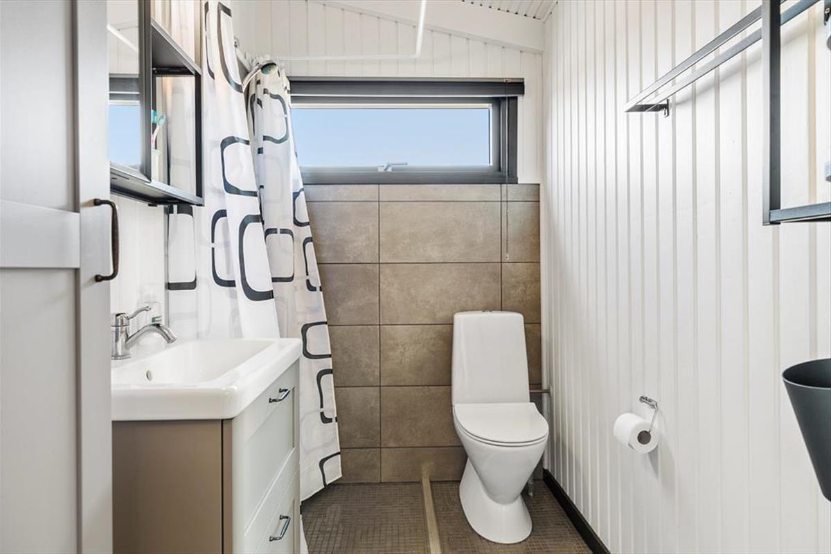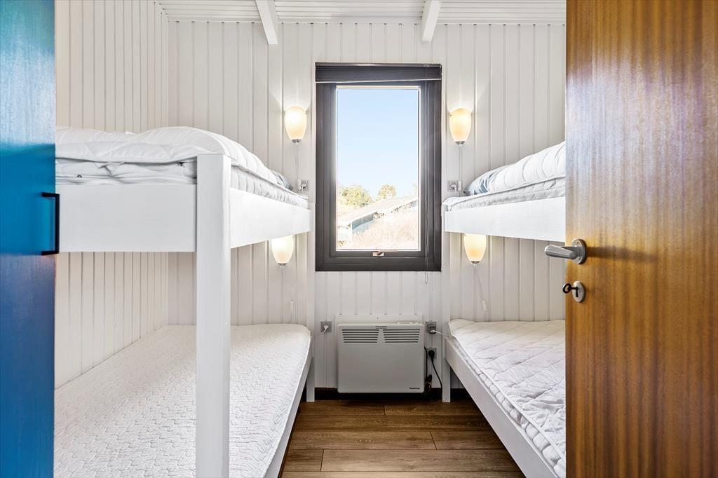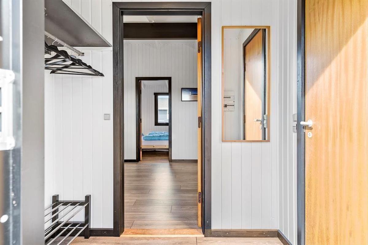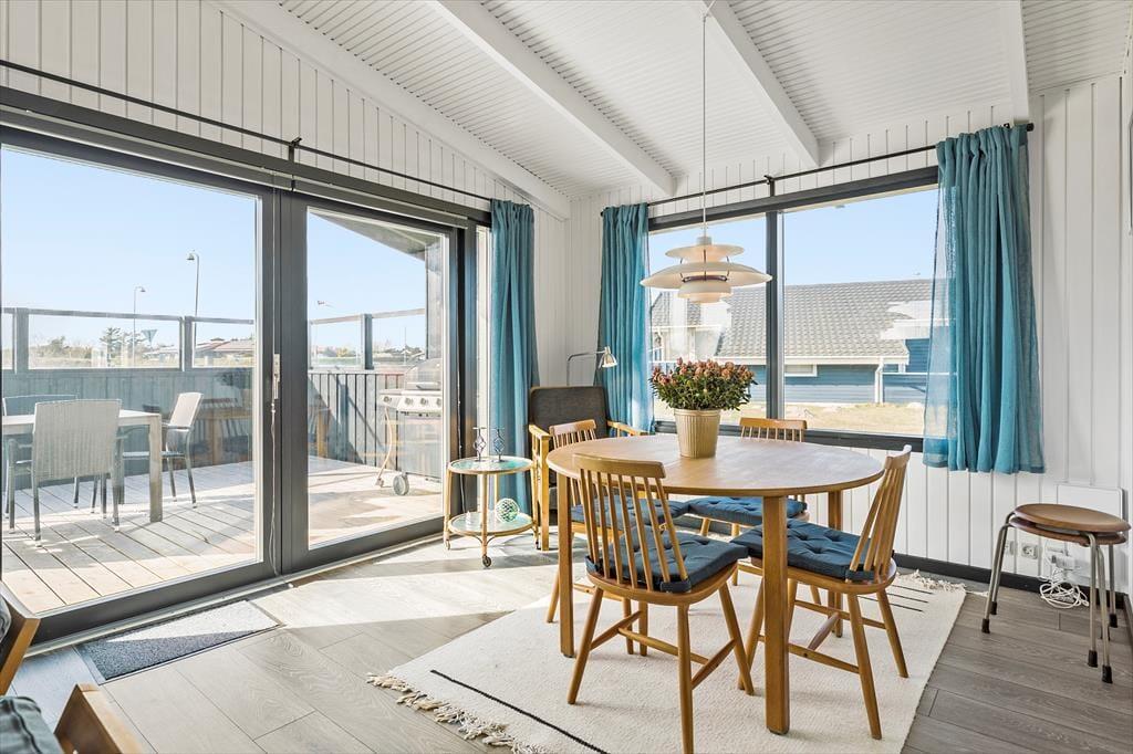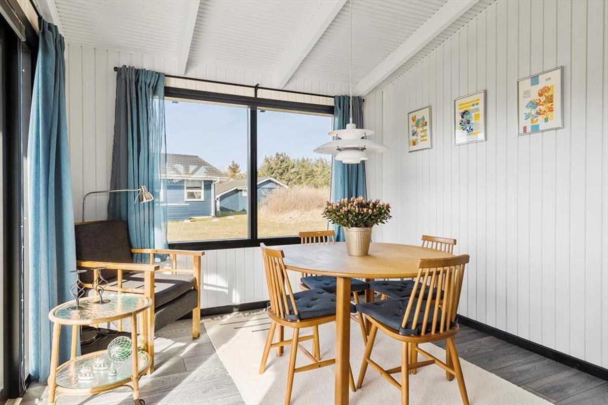 Das Haus bietet eine helle und einladende Atmosphäre und wurde mit großem Respekt für den ursprünglichen Ferienhausstil renoviert. Der offene Wohnbereich, der mit der Küche verbunden ist, schafft den idealen Rahmen für gemütliches Beisammensein. Es gibt sowohl einen Essbereich als auch eine Sofaecke, und das hohe Deckenprofil zusammen mit den großen Fensterpartien sorgt für Licht und Luft. Die Küche ist älteren Datums, jedoch voll funktional und harmoniert optisch perfekt mit dem restlichen Interieur. Eine Bar mit Hockern lädt dazu ein, ein Glas Wein zu genießen, während das Essen auf dem Herd köchelt. Das Haus verfügt zudem über zwei Schlafzimmer und ein Badezimmer.