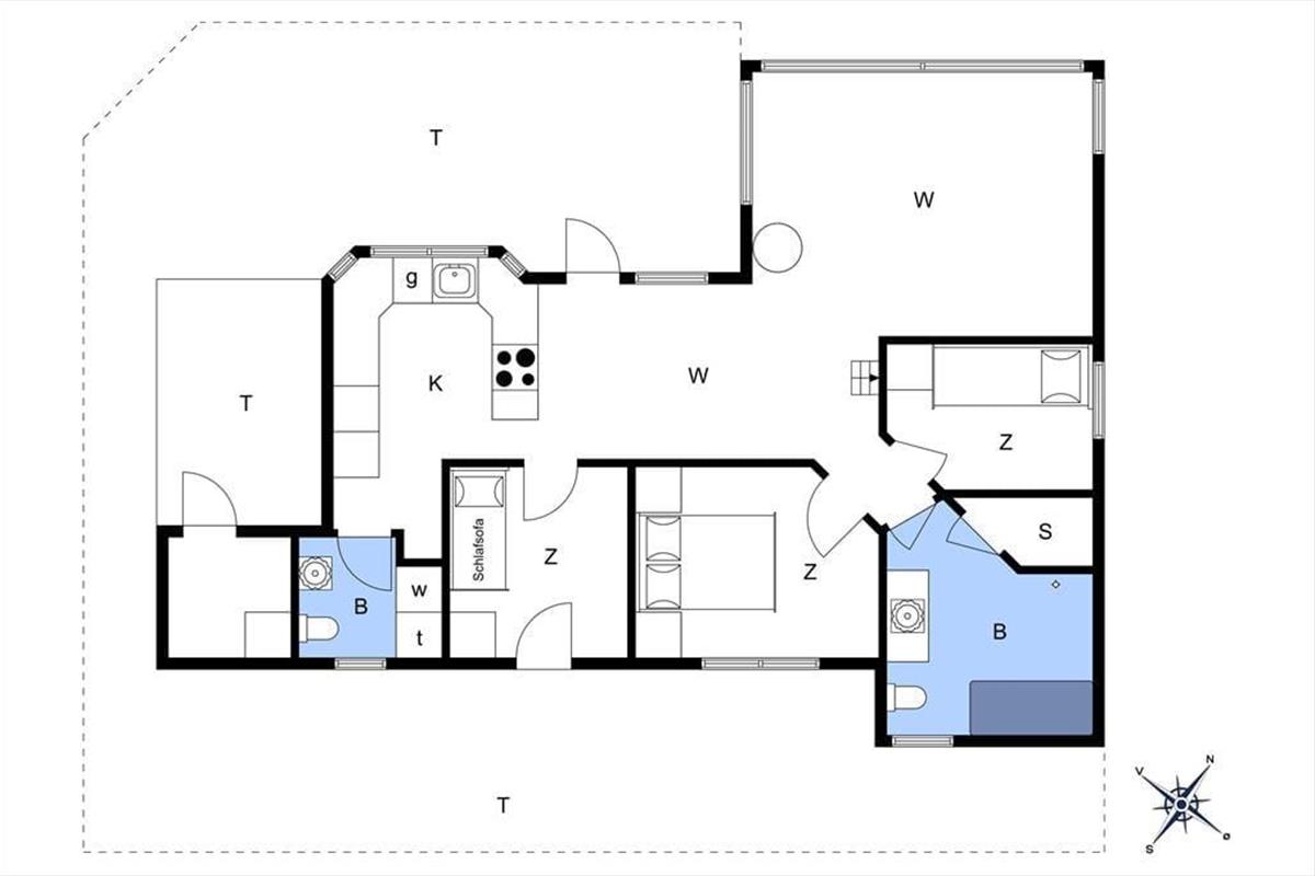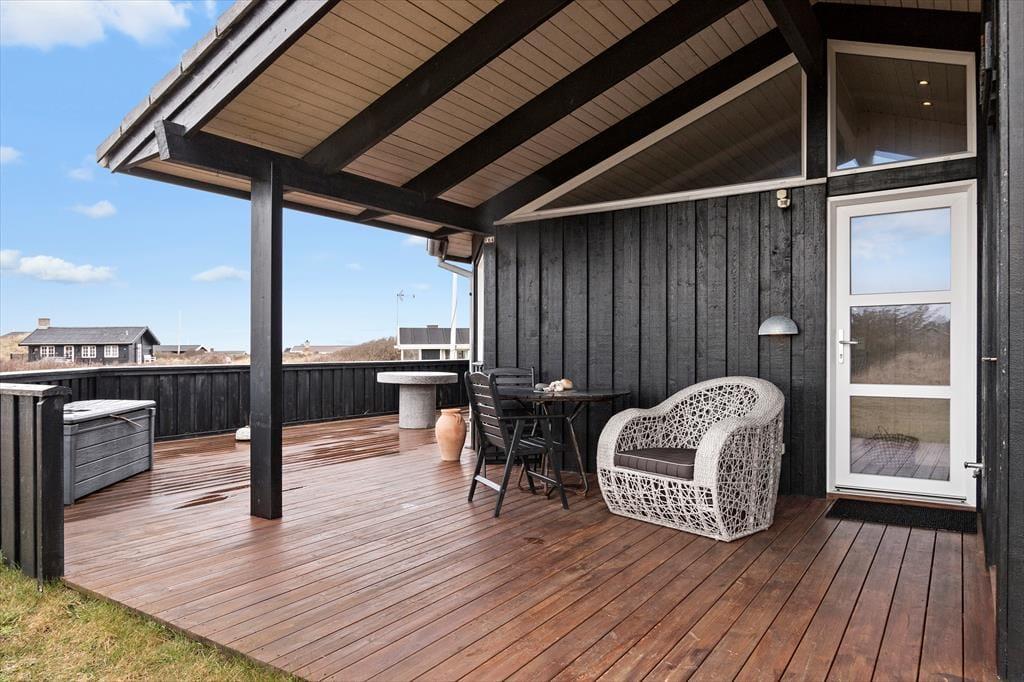 Eine schöne Holzterrasse umgibt drei Seiten des Mietobjektes. Sie werden den gesamten Tag über keine Probleme haben, ein sonniges Plätzchen zu finden. Falls Sie sich auch am Abend gern im Freien aufhalten, ziehen Sie sich einfach unter die Terrassenüberdachung zurück. Die Umgebung ist friedvoll und schön. Sie genießen viel frische, salzige Seeluft.