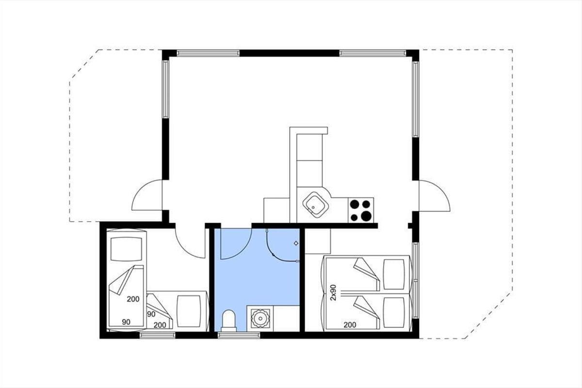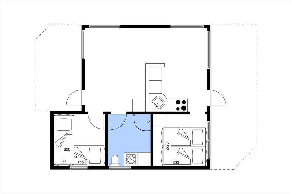 Innen erwartet Sie eine einfache, ältere Einrichtung mit Holzverkleidung und klassischer dänischer Ferienhausstimmung. Große Fenster lassen Licht und Natur ins Haus. Es gibt ein Wohnzimmer in offener Verbindung mit der Küche sowie ein Badezimmer mit Dusche – ideal für ein Paar, das einen entspannten Urlaub inmitten der Natur verbringen möchte.