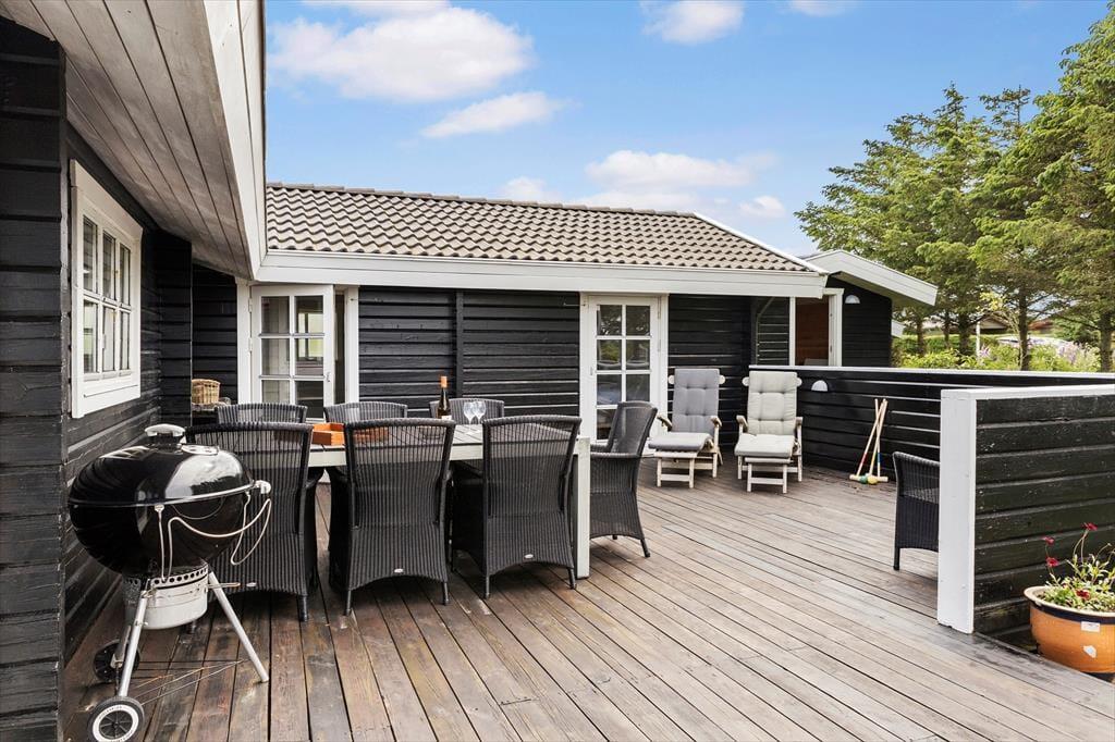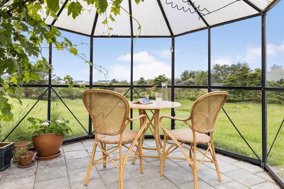 Vom Haus aus gibt es mehrere Ausgänge zur großen, nach Südwesten ausgerichteten Terrasse, auf der Sie den ganzen Tag über und bis zum Sonnenuntergang sowohl Sonne als auch Schatten finden können. Und eine schöne Südost-Terrasse, auf der Sie Ihren Morgenkaffee genießen können. An einem windigen Tag können Sie es sich im Gartenpavillon mit Blick auf die Landschaft gemütlich machen. In dem Raum am Ende der Garage gibt es Gartenspiele für Spaß und Spiele auf dem Rasen. Bitte beachten Sie, dass ein Teil des Grundstücks abschüssig ist. Natürlich ist das Haus mit einem Grill ausgestattet, so dass Sie viele Ihrer Mahlzeiten auch im Freien zubereiten können. Es ist möglich, die Terrasse für kleinere Hunde zu verschließen.