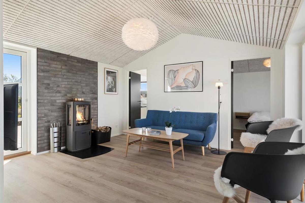 Dank der großen Fenster könnt ihr den Meerblick und das Sonnenlicht genießen, während ihr euch im Wohnbereich entspannt. In der offenen Küche wird jeder Feinschmecker gerne kochen - nicht zuletzt, weil sie zum Wohnzimmer hin offen ist. So könnt ihr die Zweisamkeit mit der Familie genießen und die Urlaubserlebnisse des Tages besprechen, während ihr mit den Zutaten aus der Region zaubert. Das Sofa ist strategisch günstig in der Nähe des Holzofens platziert, sodass ihr an kühlen Tagen, wenn der Urlaubsspaß hauptsächlich drinnen stattfindet, freie Sicht auf die Flammen habt. Die hohe Qualität der Innenausstattung zeigt sich auch im Badezimmer. Die beiden Schlafzimmer bieten bequeme Betten für fünf Personen. In einem der Schlafzimmer stehen drei Betten nebeneinander, so dass es ein idealer Schlafplatz ist, wenn z. B. ein Kind dabei ist, das in der Nähe seiner Eltern sein möchte.