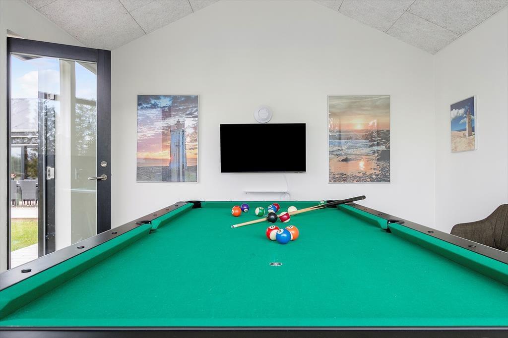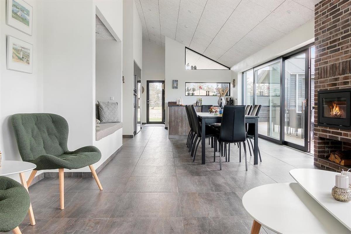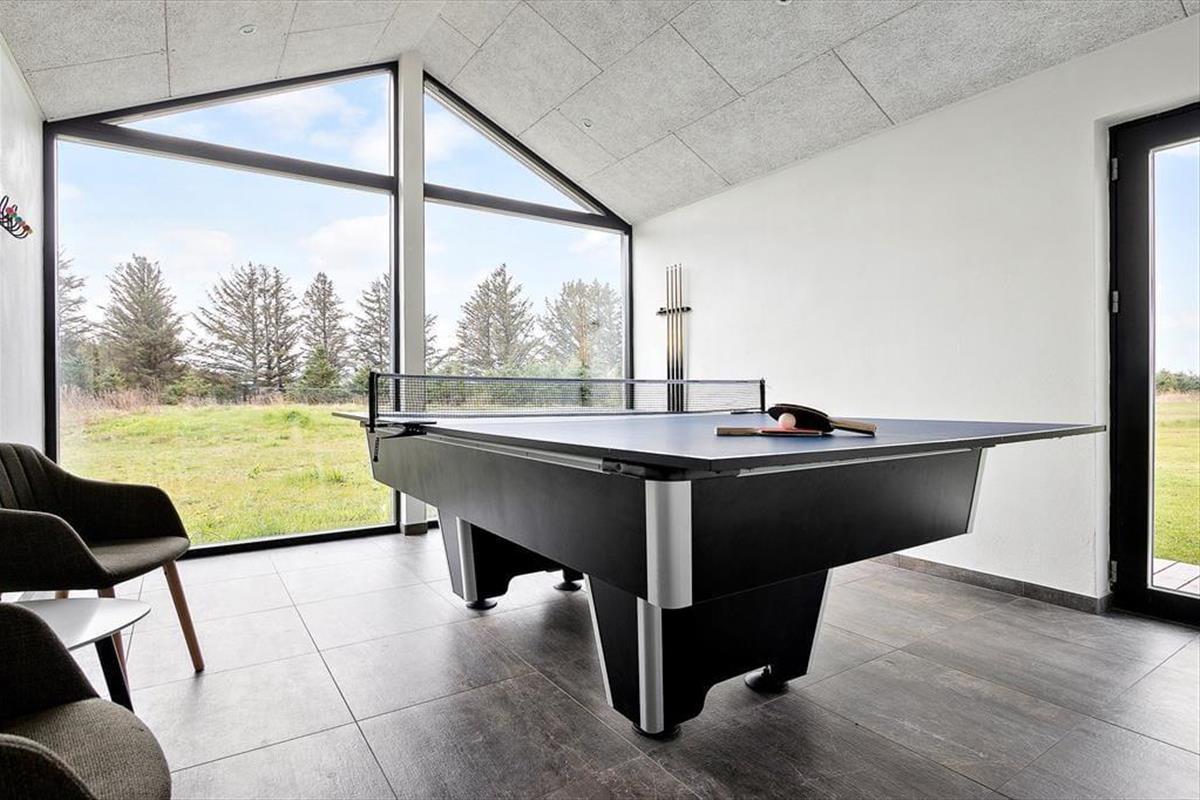 Das im Jahr 2023 erbaute Haus wirkt sehr repräsentativ und bietet mit seiner stilvollen Architektur einen eleganten und exklusiven Rahmen für deinen Urlaub. Im Inneren wirst du von großen, lichtdurchfluteten Räumen und einer wunderbaren Atmosphäre im ganzen Haus begrüßt - die Liebe zum Detail ist unübertroffen. Im Wohnbereich gibt es hohe Decken, die zusammen mit den großen Fenstern zu einem Gefühl von Licht und Luft beitragen. Die gut ausgestattete Küche ist zum Wohnbereich hin offen, wo die Mahlzeiten an einem langen Tisch serviert werden können. Es gibt auch einen Holzofen und eine Sofaecke für gemütliche Momente nach dem Essen. Das Haus verfügt über einen Aktivitätsraum, in dem du dich mit den anderen beim Billard und Tischtennis messen kannst.