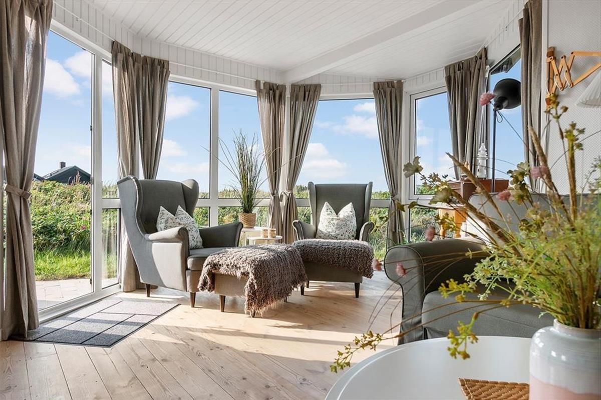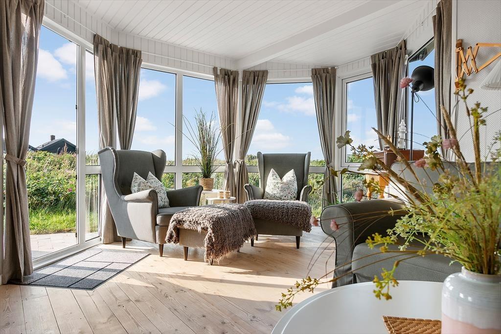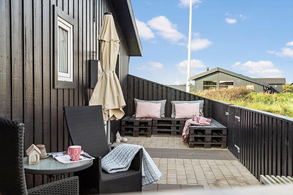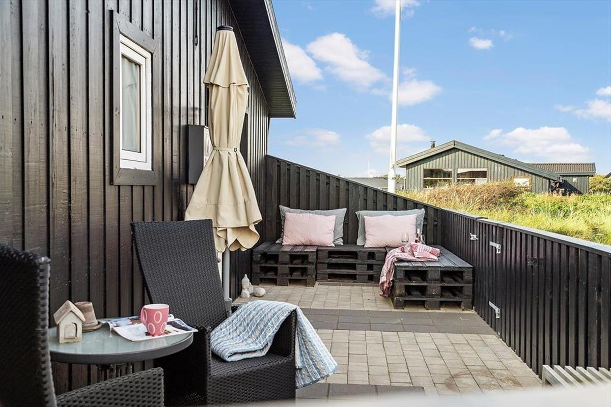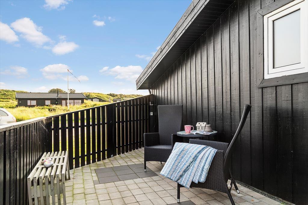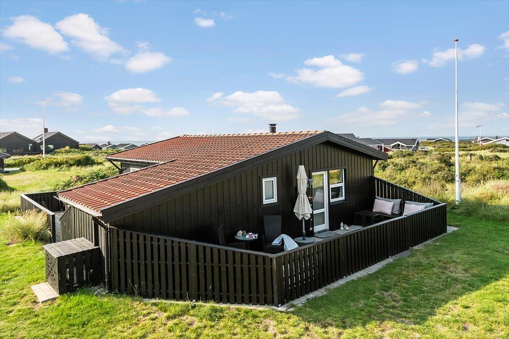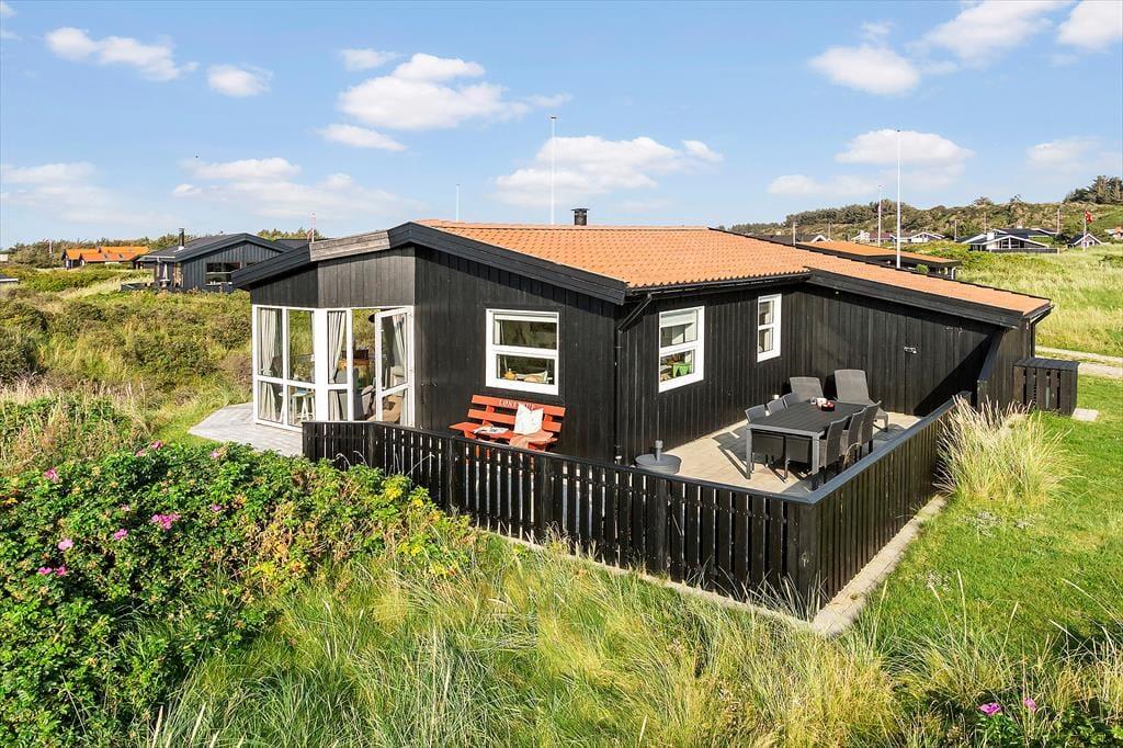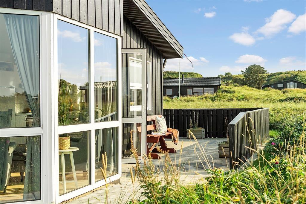 Draußen können Sie sich genau dort hinsetzen, wo die Sonnenverhältnisse am besten sind, denn es gibt mehrere schöne Terrassenbereiche zur Auswahl, die direkt an das Ferienhaus angrenzen. Das Meer wartet nur 250 Meter entfernt, und wenn Sie zur anderen Seite schauen, können Sie den Anblick der schönen Binnendünen genießen, während die Hagebuttenbüsche auf dem Naturgrundstück je nach Jahreszeit mit rosa Blüten oder roten Beeren geschmückt sind. Auf der Terrasse stehen Ihnen neben Gartenmöbeln und Liegestühlen auch ein Sonnenschirm und ein Grill zur Verfügung, und zur Straße hin haben Sie Platz, um Ihr Auto auf der grasbewachsenen Fläche zu parken.