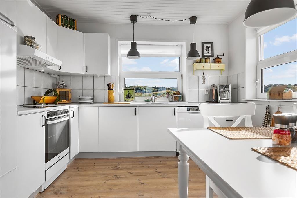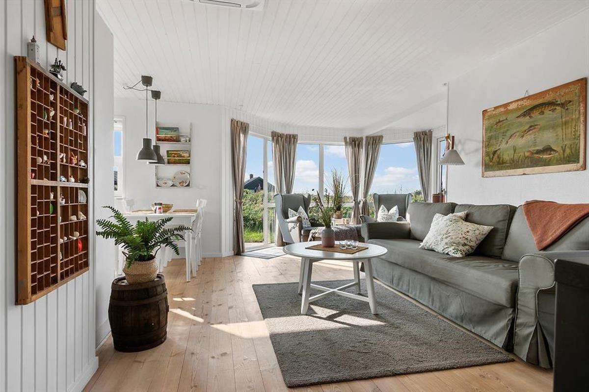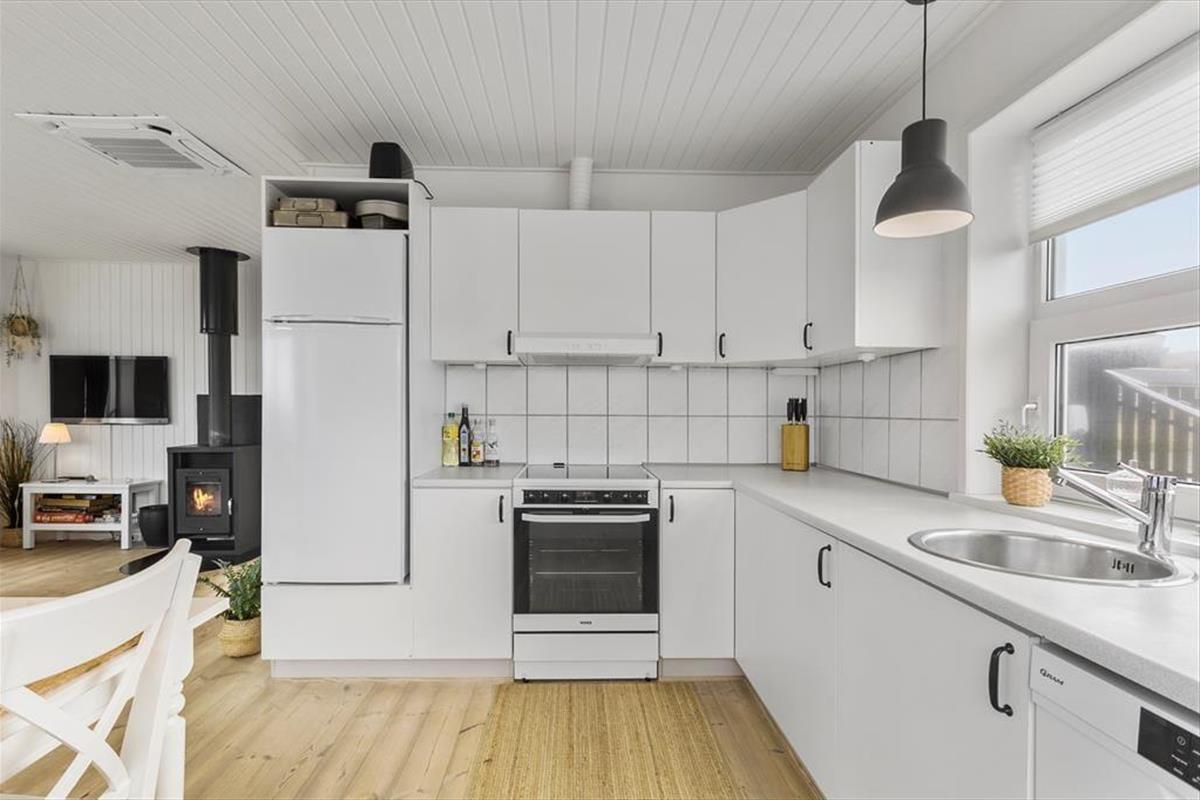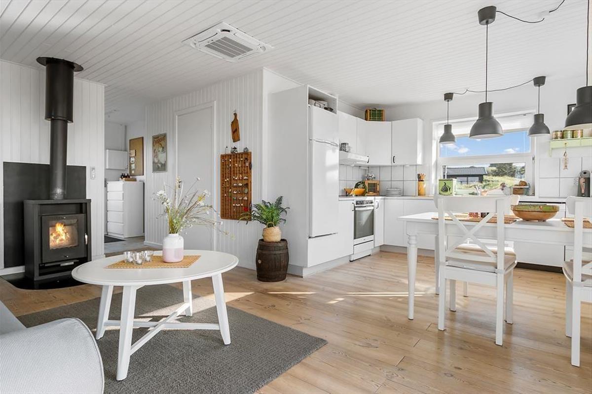 Das Ferienhaus hat ein helles und gemütliches Inneres, das gut zu den schönen natürlichen Umgebungen passt. Der Erker im Wohnzimmer bietet Ihnen einen freien Blick auf das Meer, die Hagebuttenbüsche und den weiten Himmel, selbst wenn Sie ruhig in einem bequemen Sessel sitzen möchten – und Sie können sogar den Kaminofen anmachen, um die Wärme und die gemütliche Atmosphäre zu steigern. Eine gut ausgestattete Küche ist in das Wohnzimmer integriert, sodass Sie nicht viele Schritte gehen müssen, um mehr Kaffee zu kochen oder mit der Zubereitung des Mittagessens zu beginnen. Und wenn Sie und Ihre Lieben von den Tagesausflügen zurückkehren und es sich bis zur Schlafenszeit gemütlich gemacht haben, können Sie im Badezimmer Zähne putzen, Gute Nacht sagen und sich in den zwei bequemen Schlafzimmern zur Ruhe legen.