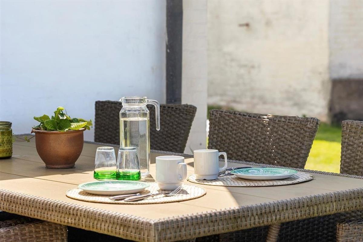 Die Wohnung ist von einem schönen Garten umgeben, der Ruhe und Erholung unter freiem Himmel bietet. Hier ist reichlich Platz zum Spielen für Kinder, und die bequemen Gartenmöbel laden Erwachsene dazu ein, mit einem Buch oder einem kühlen Glas Wein zu entspannen. Von der Terrasse aus genießt du einen herrlichen Blick in die Natur – mit dem satten Grün und Vogelgesang im Hintergrund fühlst du dich unweigerlich weit weg vom Alltag. Wenn die Sonne hoch am Himmel steht, ist ein Mittagessen im Freien genau das Richtige, und wenn der Abend hereinbricht, könnt ihr den Grill anwerfen und den Duft von Sommergerichten in der warmen Abendluft genießen. Ob Sonne oder Schatten, Aktivität oder Ruhe – Garten und Terrasse bieten den perfekten Rahmen für entspannte Ferientage.