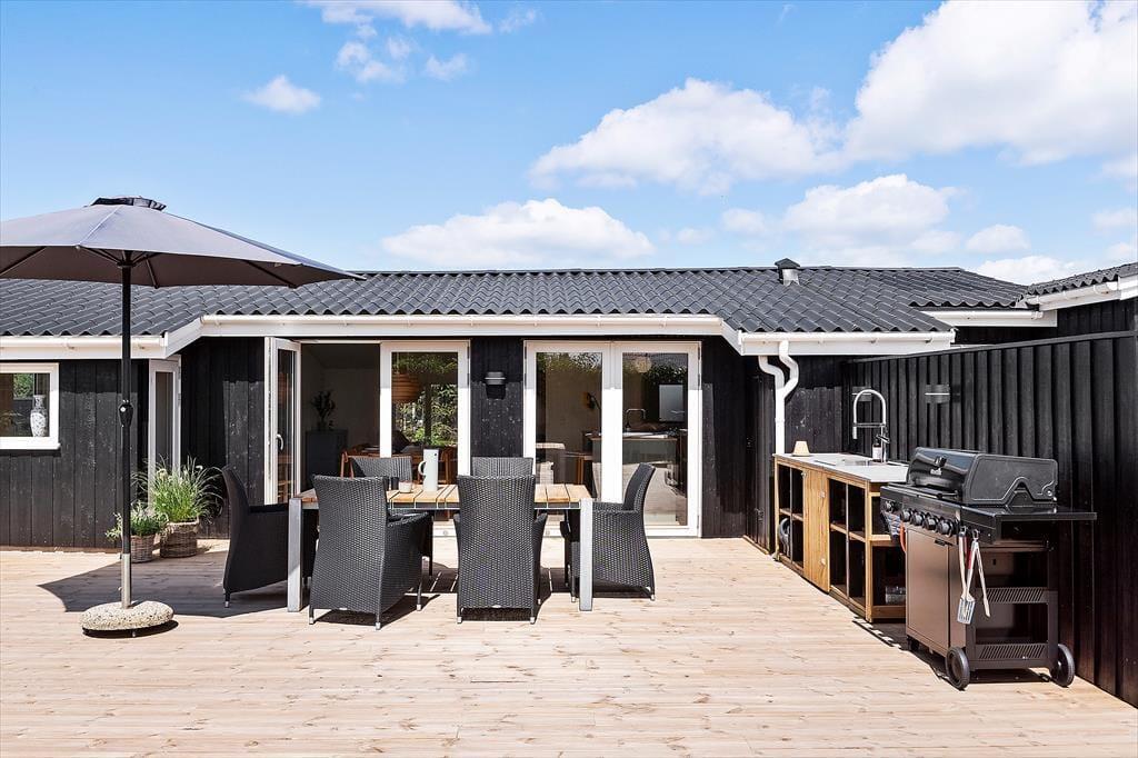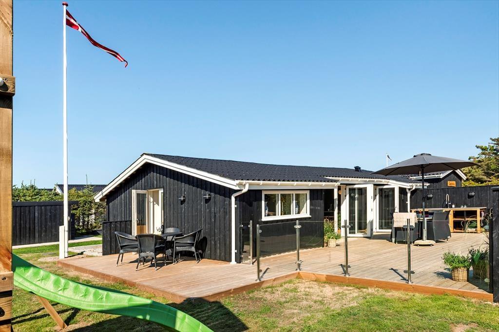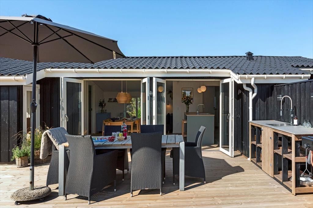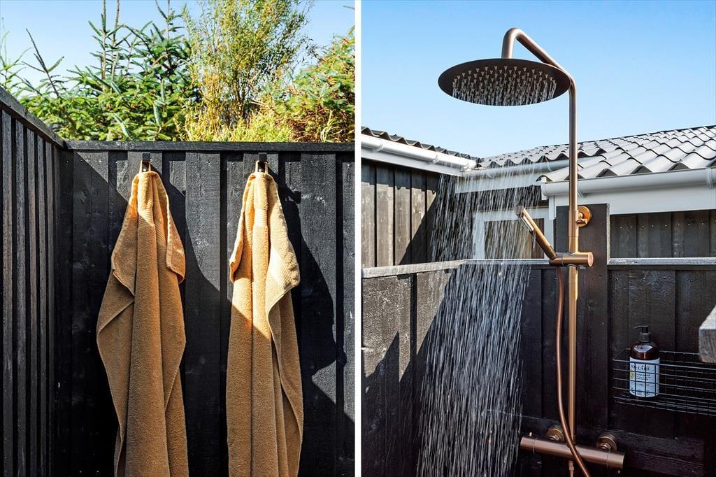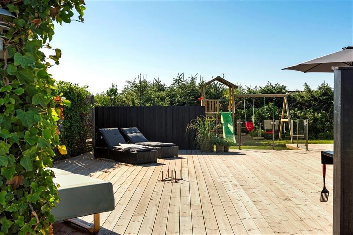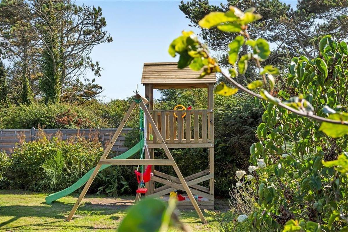 Draußen entfaltet sich das Urlaubsleben erst so richtig. Die große Terrasse ist mit guten Gartenmöbeln ausgestattet, sodass Sie die Sonne von morgens bis abends genießen können – vielleicht mit einer Tasse Kaffee in der Hand oder einem Glas Wein, während die Abendsonne den Himmel färbt. Die Außenküche des Ferienhauses lädt zum Kochen unter freiem Himmel ein, und die Außendusche ist ideal, um nach einem Strandbesuch das Salz und den Sand abzuspülen. Im Garten finden Sie sowohl eine Boulebahn als auch einen Spielturm mit Schaukeln und Rutsche, sodass sich sowohl Kinder als auch Erwachsene auf ihre Weise vergnügen können. Mit anderen Worten: Dies ist ein Ferienhaus, in dem sich alle Generationen treffen können und in dem die Tage leicht in Spiel, Entspannung und gemeinsame Mahlzeiten unter freiem Himmel vergehen.