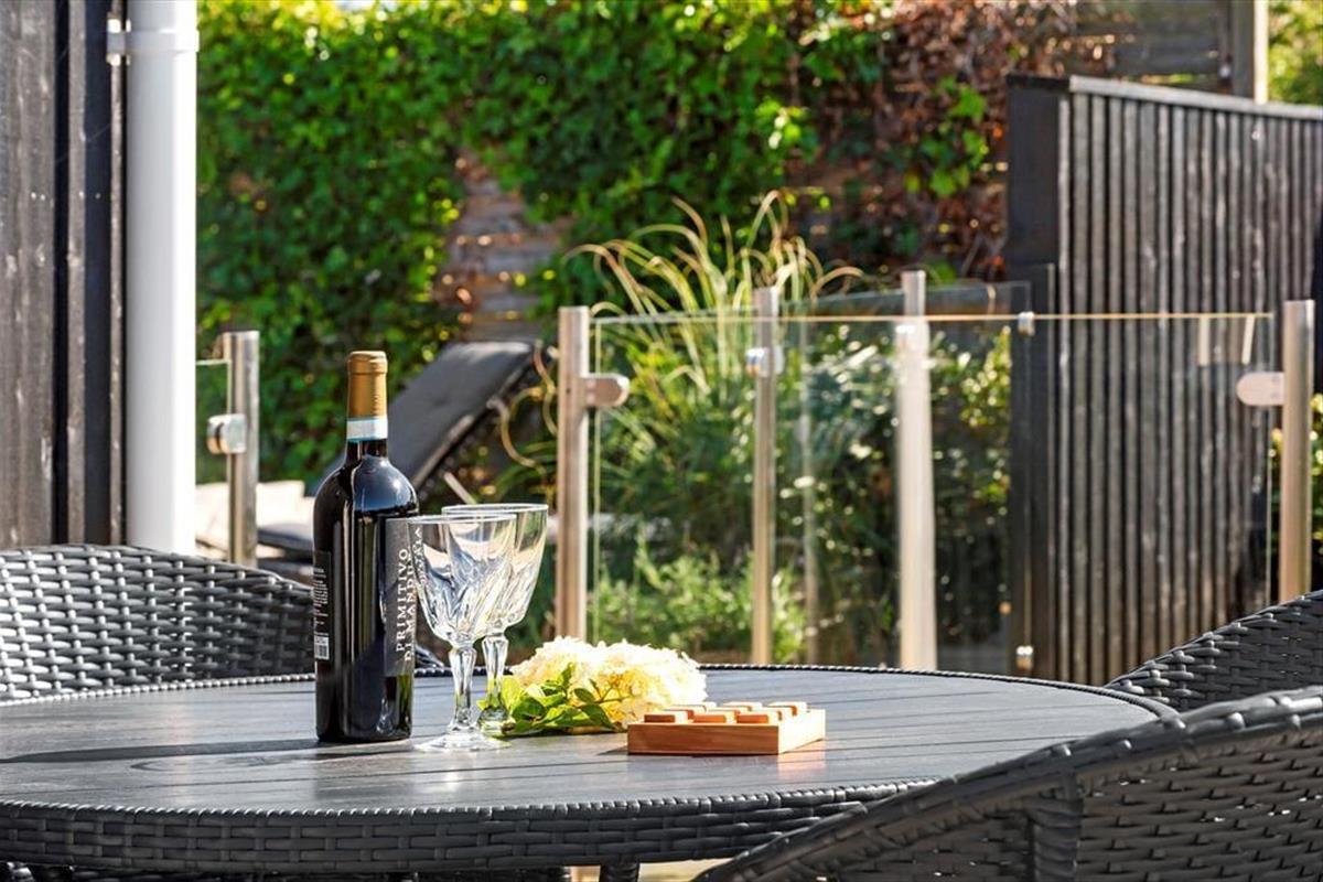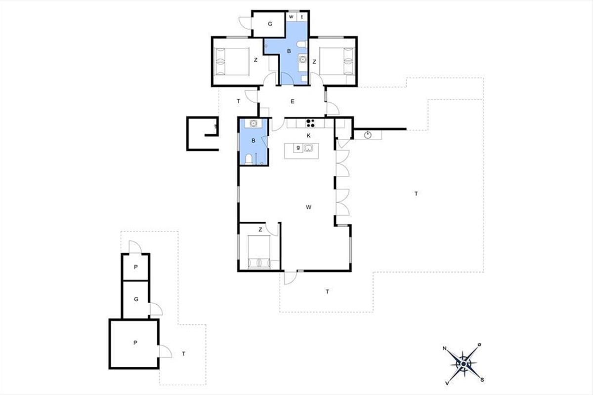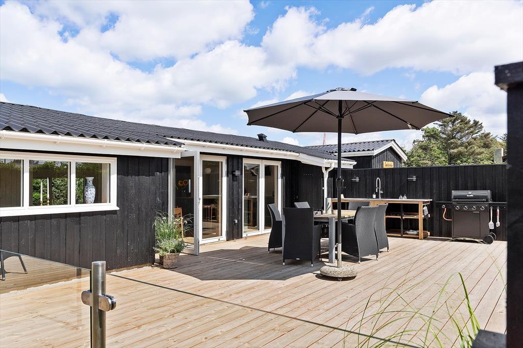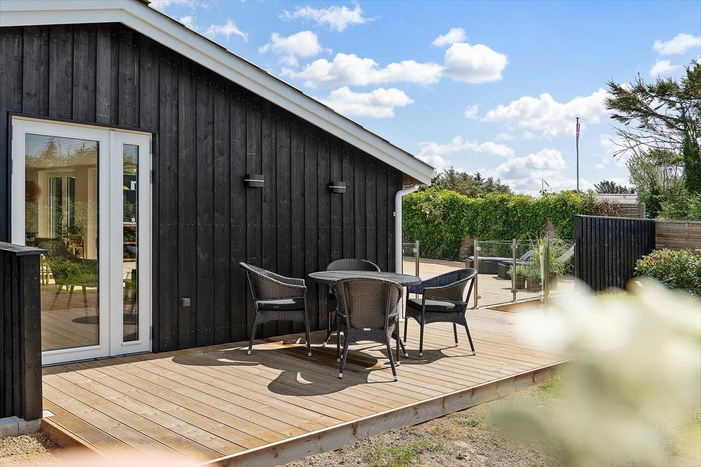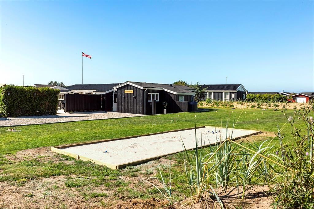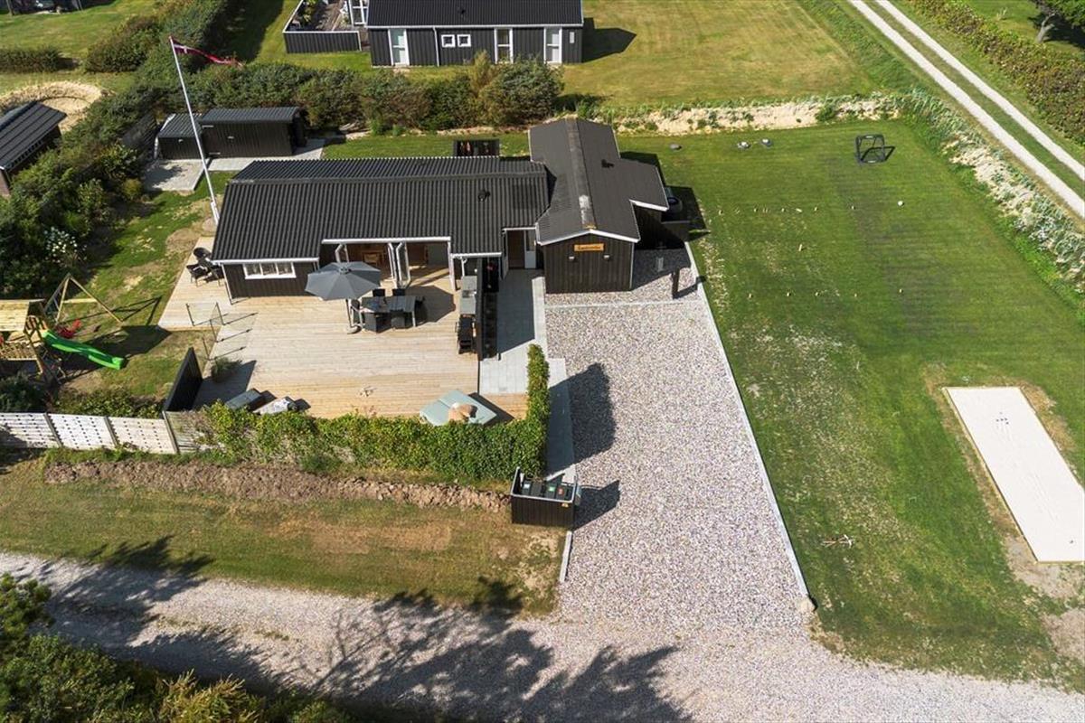 Draußen entfaltet sich das Urlaubsleben erst so richtig. Die große Terrasse ist mit guten Gartenmöbeln ausgestattet, sodass Sie die Sonne von morgens bis abends genießen können – vielleicht mit einer Tasse Kaffee in der Hand oder einem Glas Wein, während die Abendsonne den Himmel färbt. Die Außenküche des Ferienhauses lädt zum Kochen unter freiem Himmel ein, und die Außendusche ist ideal, um nach einem Strandbesuch das Salz und den Sand abzuspülen. Im Garten finden Sie sowohl eine Boulebahn als auch einen Spielturm mit Schaukeln und Rutsche, sodass sich sowohl Kinder als auch Erwachsene auf ihre Weise vergnügen können. Mit anderen Worten: Dies ist ein Ferienhaus, in dem sich alle Generationen treffen können und in dem die Tage leicht in Spiel, Entspannung und gemeinsame Mahlzeiten unter freiem Himmel vergehen.