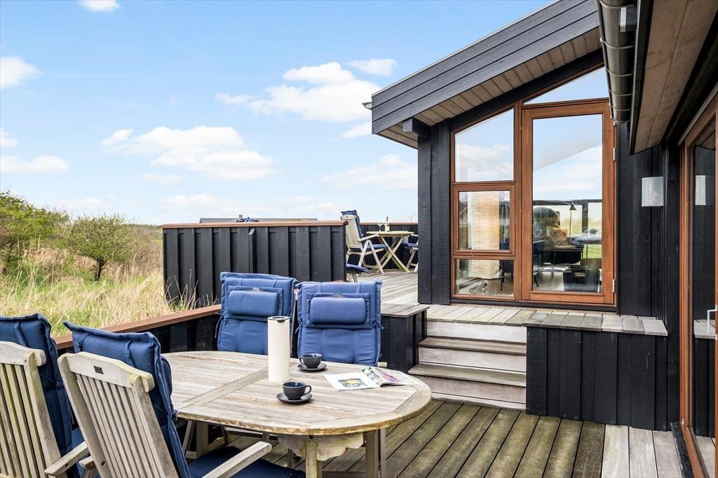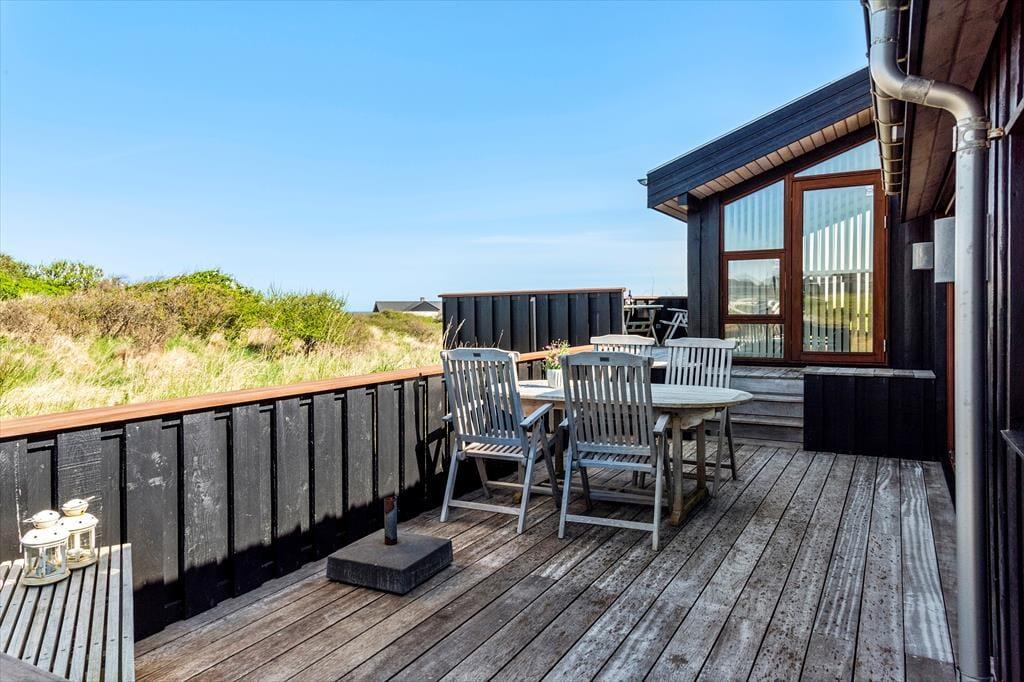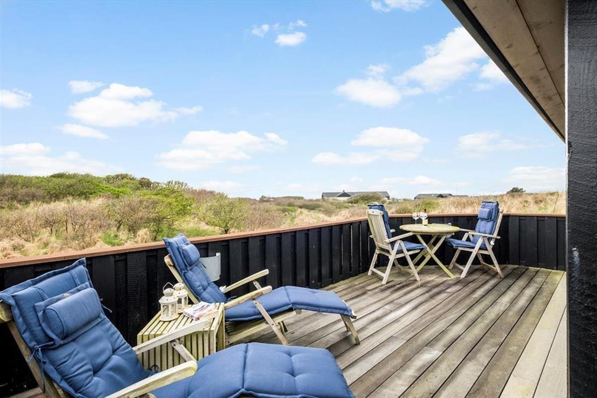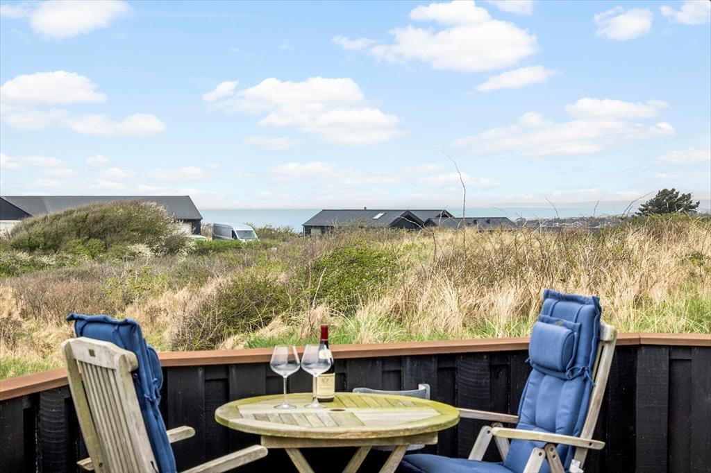 Draußen erwartet Sie ein wunderschön angelegter Terrassenbereich, der sich wie eine natürliche Verlängerung des Hauses anfühlt. Mehrere Terrassen auf unterschiedlichen Ebenen ermöglichen es Ihnen, den perfekten Platz zu finden – je nachdem, ob Sie die Morgensonne oder die goldene Abendsonne bevorzugen. Der Ausblick ist dabei kaum zu übertreffen: Von der erhöhten Lage aus genießen Sie einen weiten Blick über die Dünenlandschaft und das tiefblaue Meer, das sich je nach Wetter und Licht ständig verändert. Die Terrassen laden zu entspannten Ferientagen mit einem guten Buch, Grillabenden und anregenden Gesprächen ein. An ruhigen Tagen hören Sie die Vögel in den Dünen und spüren die sanfte Brise auf der Haut – Urlaubsmomente, die lange in Erinnerung bleiben.