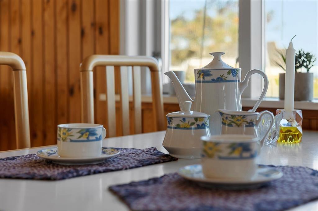 Drinnen empfängt Sie eine rustikale und gemütliche Einrichtung, bei der der klassische Ferienhaus-Look sofort Urlaubsstimmung verbreitet. Das Wohnzimmer ist der natürliche Treffpunkt des Hauses, hier können Sie entspannt auf dem Sofa sitzen, während Ihr Blick automatisch zum blauen Meer am Horizont schweift. Vom Esstisch aus genießen Sie dasselbe Panorama, was die Mahlzeiten noch besonderer macht. Die Einrichtung ist einfach und heimelig, sodass Sie sich als zwei Personen schnell wohlfühlen – perfekt für Ruhe und Nähe in schöner Umgebung. Und wenn Sie Lust haben, Ihre Hunde mitzunehmen, sind auch diese hier herzlich willkommen.