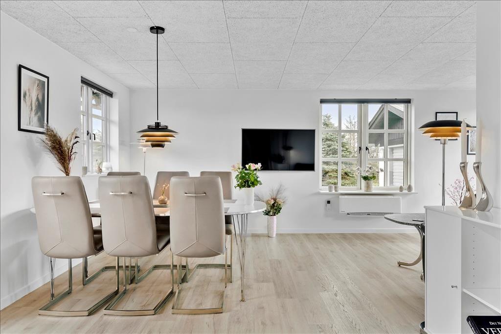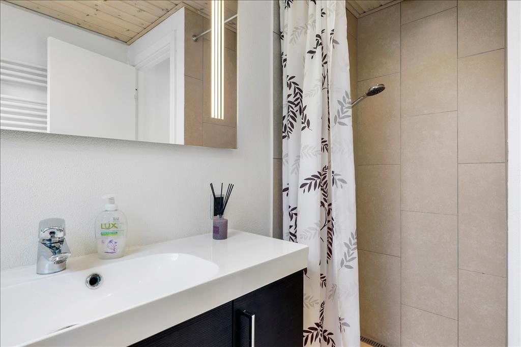 Die Atmosphäre ist ruhig und entspannt auf dem kleinen Skonnertvej, obwohl Sie nahe dem Zentrum von Lønstrup wohnen. Vom Ferienhaus aus sind es nur wenige hundert Meter bis zur Hauptstraße des Küstenortes und zu den zahlreichen Kunstgalerien, Geschäften, Cafés und Restaurants. Ihr Spaziergang kann Sie auch an den Strand führen, wo Sie zwischen den Buhnen schwimmen, im Sand spielen oder die Aussicht auf die Nordsee von der Spitze der Klippen aus genießen können. Wenn Sie einen kleinen Ausflug machen möchten, fahren Sie nach Süden zum malerischen Leuchtturm von Rubjerg Knude. Und nördlich von Lønstrup finden Sie das Skallerup Seaside Resort mit Aktivitäten für die ganze Familie.