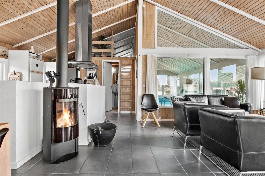 Wenn du das Ferienhaus betrittst, wirst du dich sofort zu Hause fühlen. Die Einrichtung ist sowohl geschmackvoll als auch gemütlich, und die warmen Farbtöne der Räume schaffen eine einladende Atmosphäre. Vom Wohnzimmer aus kannst du beobachten, was im gut eingerichteten Poolbereich passiert, sodass die Kinder unbesorgt spielen können, während du dich entspannst. Der Kaminofen im Wohnzimmer sorgt an kühleren Tagen für zusätzliche Gemütlichkeit, und du kannst zur Ruhe kommen, während du den Flammen zuschaust. Das Haus ist sowohl auf Komfort als auch auf Funktionalität ausgelegt, sodass du problemlos Zeit mit der Familie verbringen kannst, egal ob du in der offenen Küche kochst oder eine ruhige Stunde im Wohnzimmer genießt.