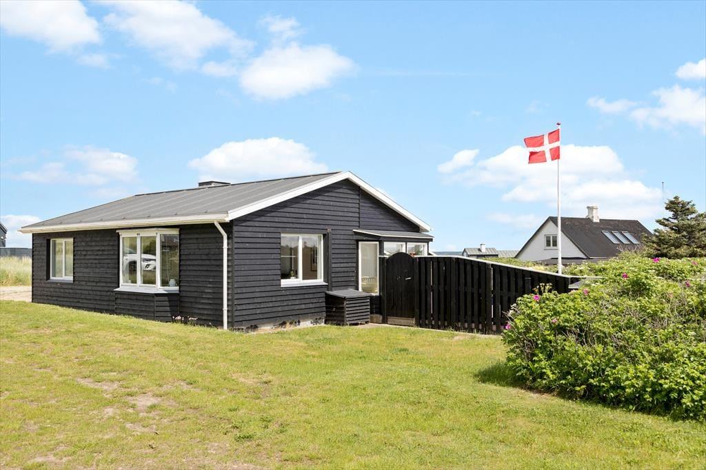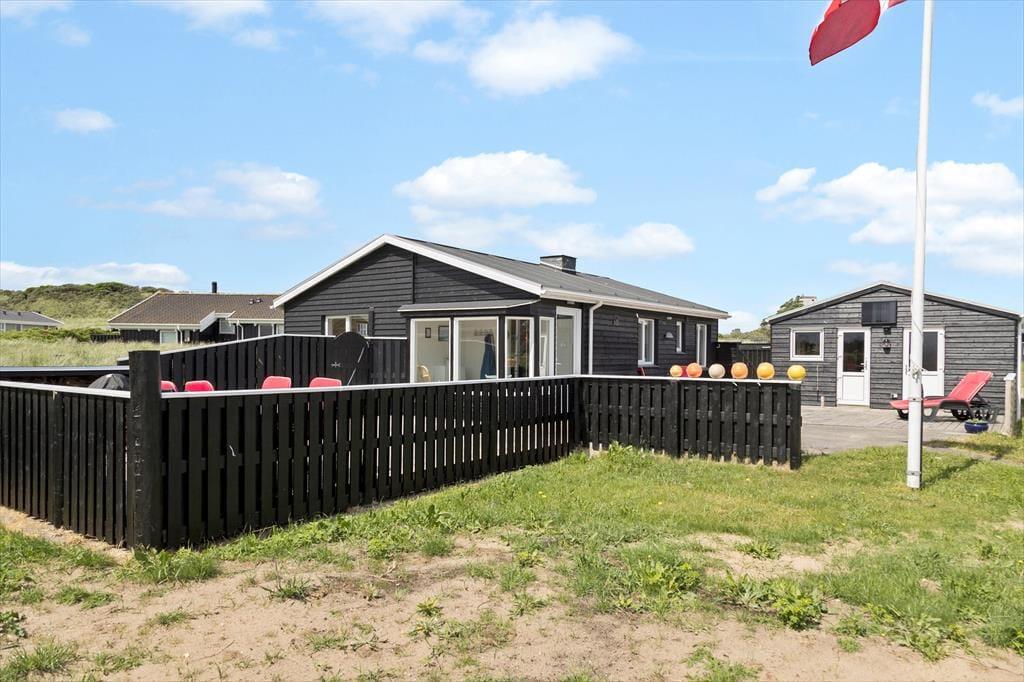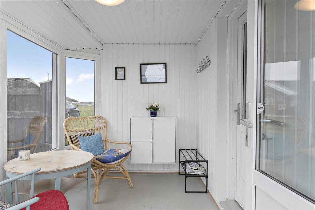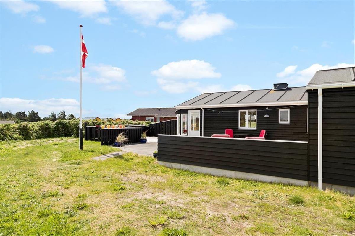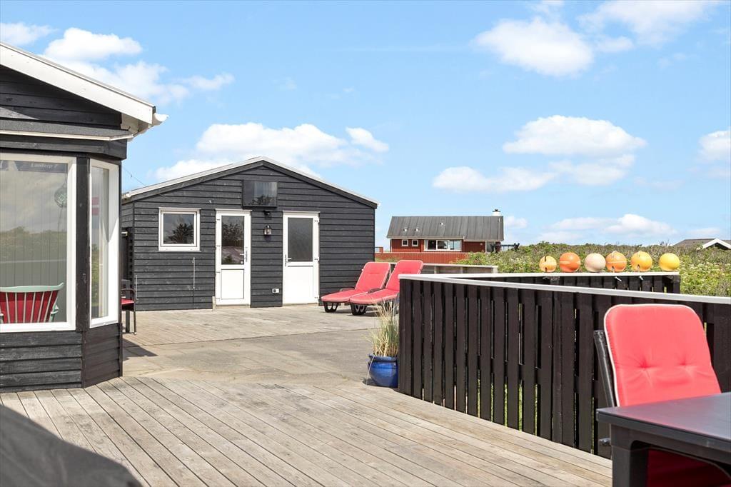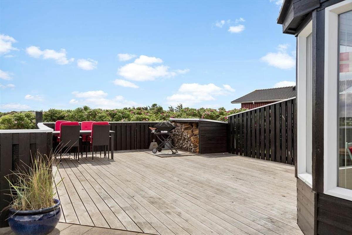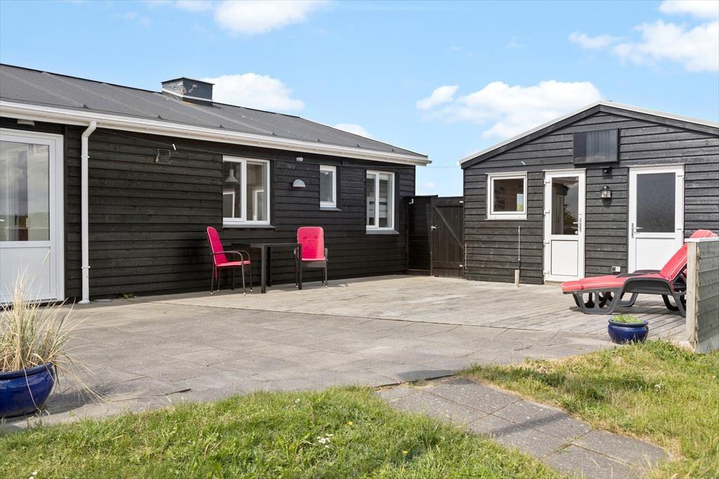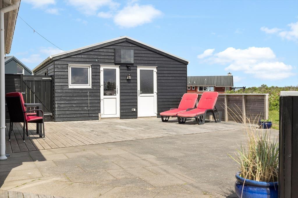 Das Ferienhaus und das Nebengebäude sind durch die große Terrasse verbunden, die gut vor Wind und den Blicken der auf dem Weg Løntorp vorbei spazierenden Passanten geschützt liegt. Die Sonnenverhältnisse sind super, und mit Liegestühlen, bequemen Gartenmöbeln und einem Grill könnt ihr euch auf entspannte Stunden, leckere Mahlzeiten unter freiem Himmel freuen. Das Haus ist von einer Rasenfläche umgeben, gesäumt von dichten Hagebuttenbüschen. Der schöne Blick auf die Steilküste von Lønstrup und die Nordsee verstärkt die Ferienidylle an dieser ruhigen Adresse.
