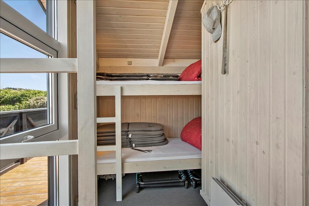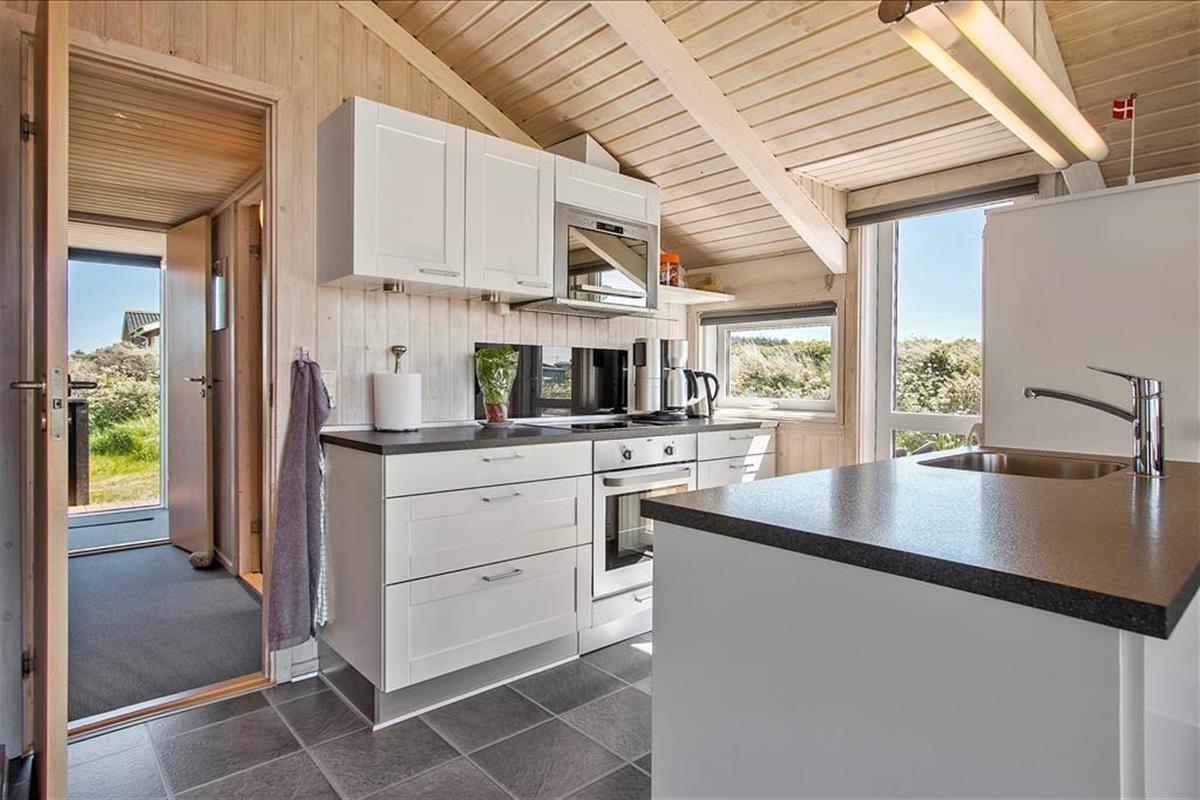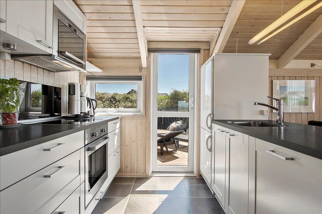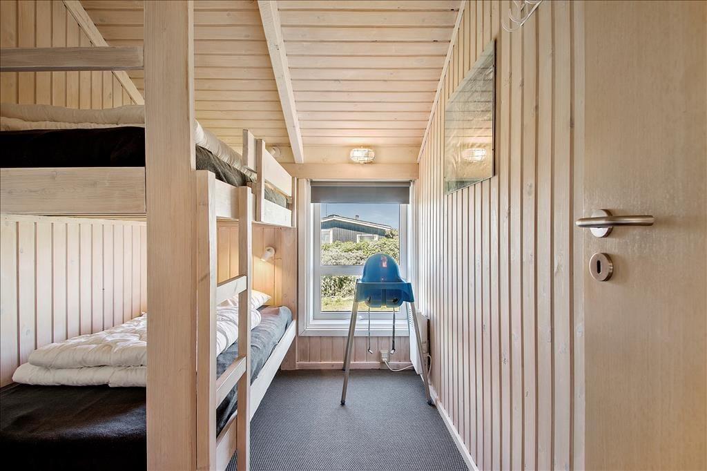 Es ist ein klassisches Holzferienhaus, das 2021 renoviert wurde und hell und einladend ist. Dies gilt für alle Räume - nicht nur für das Wohnzimmer, sondern auch für das Badezimmer und die beiden Schlafzimmer. Das eine Schlafzimmer ist mit einem Doppelbett ausgestattet, das andere mit einem Etagenbett. Außerdem sind zwei zusätzliche Etagenbetten (180 cm) in den Flur eingebaut. Die meisten der gemütlichen Momente werden Sie wahrscheinlich im Wohnbereich verbringen, in dem das Wohnzimmer und die Küche offen miteinander verbunden sind. Egal, ob Sie kochen, am Esstisch sitzen oder sich auf dem Sofa entspannen, Sie können den Meerblick genießen, der besonders während des Sonnenunterganges beeindruckend ist.