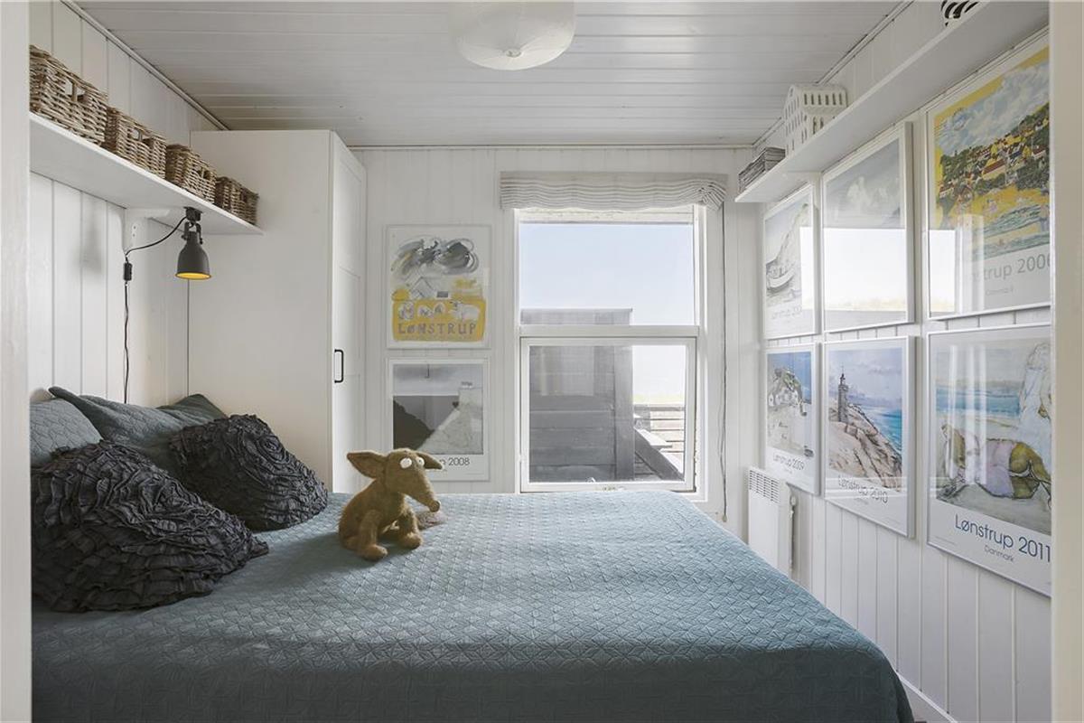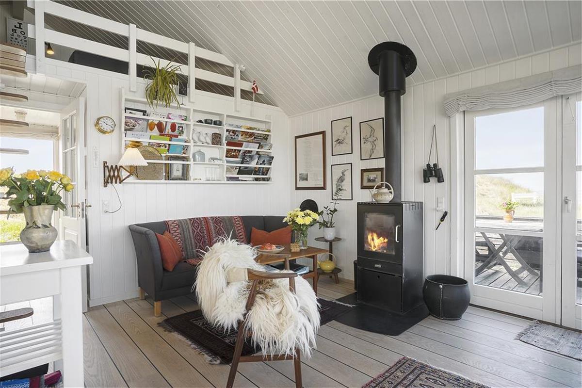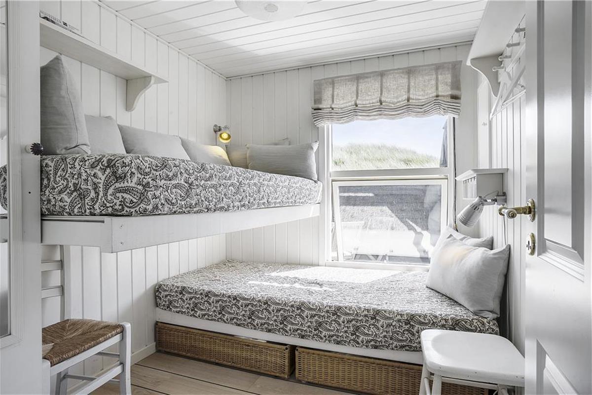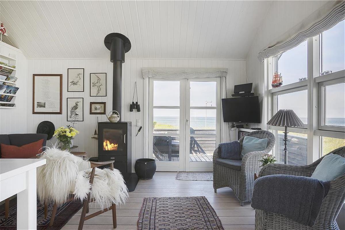Bei diesem Ferienhaus sind die Küche und der Wohnraum harmonisch miteinander kombiniert. Der Raum besticht aufgrund der großen Panoramafenster mit einem herrlichen Lichteinfall und mit der wohl denkbar schönsten Aussicht. Der helle und moderne Wohnraum sorgt mit seiner Einrichtung für ein entspanntes Wohngefühl im Stil der Westküste. Der Kamin sorgt an kühleren Tage für angenehme Wärme und ein Maximum an echter dänischer Ferienhausgemütlichkeit. Ihnen stehen zwei Schlafräume zur Verfügung, von denen einer mit einem Doppelbett eingerichtet ist. Im zweiten Schlafraum steht ein Einzelbett mit darüberliegendem Hochbett für Sie bereit. Zwei weitere Schlafplätze befinden sich in Form zweier Einzelbetten oben auf dem offenen Schlafboden im Wohnbereich. Das helle Badezimmer ist mit einer Waschmaschine und einem Wäschetrockner ausgestattet.