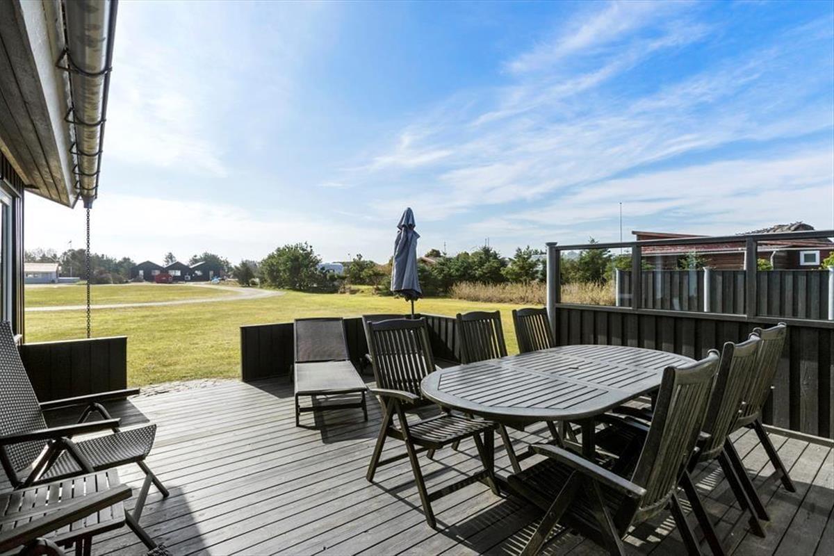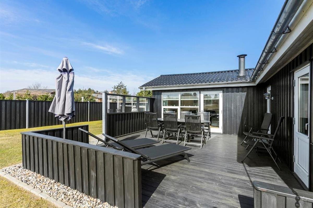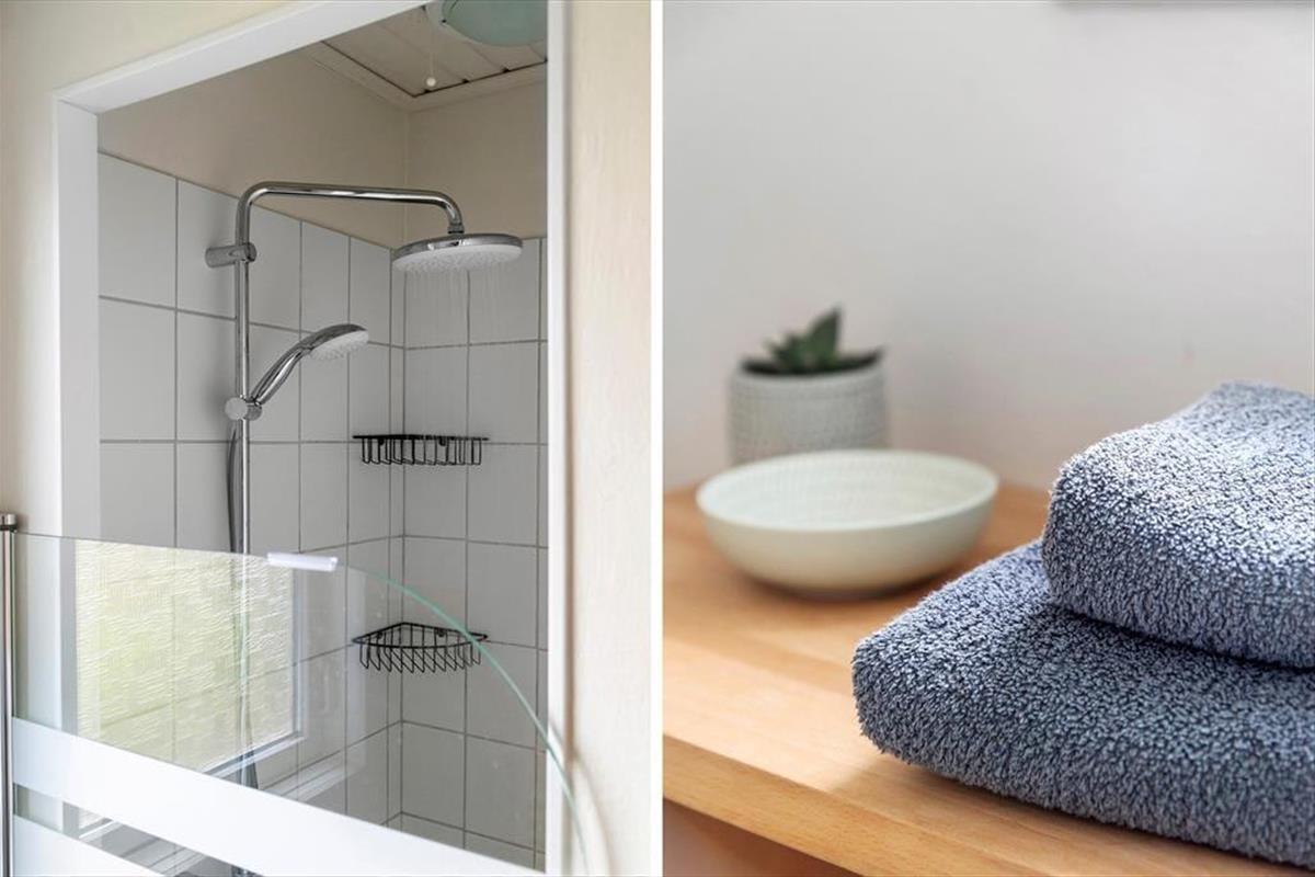 Wenn Sie mit Ihrer Familie oder mit Freunden, die Gartenspiele und Spiele im Freien lieben, hier sind, können Sie sich darüber freuen, dass das Ferienhausgrundstück über eine große und ebene Rasenfläche verfügt. Hier können Sie sich frei ausbreiten – und wenn Sie mehr Platz benötigen, gibt es in der Nähe des Hauses einen grünen Gemeinschaftsbereich mit Fußballtoren. Wenn Sie lieber in Ruhe bei Ihrem Morgenkaffee sitzen oder ein gutes Mittagessen in der Sonne genießen möchten, können Sie sich auf einer der schönen Terrassen niederlassen, die sich rund um das Haus erstrecken. Auf der ansonsten offenen Ostterrasse befindet sich in Verlängerung der Küche ein kleiner überdachter Bereich, während die nach Südwesten ausgerichtete Terrasse teilweise abgeschirmt ist, so dass gute Chancen auf Unterschlupf bestehen.
