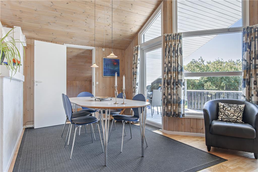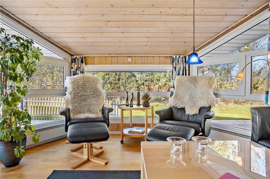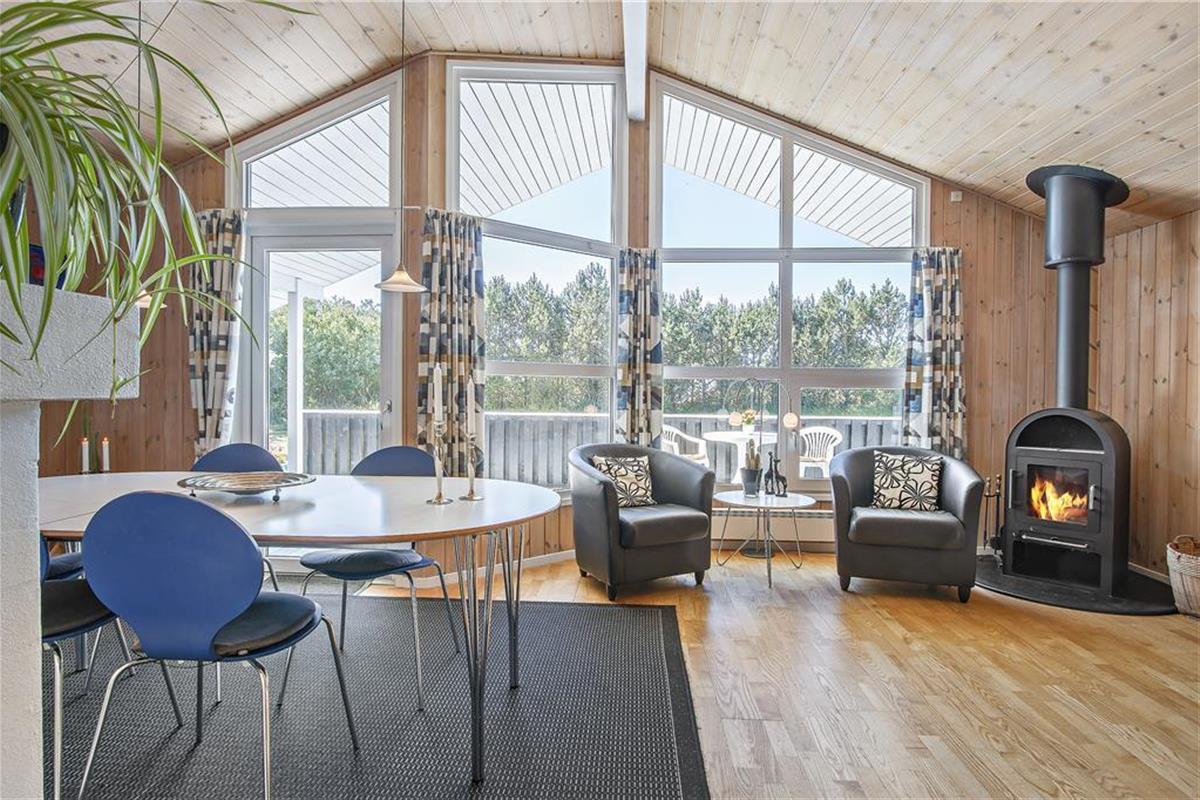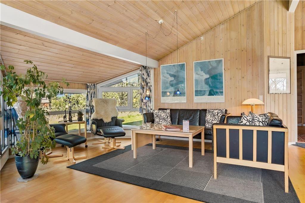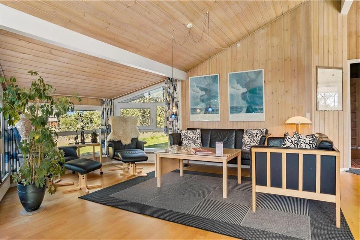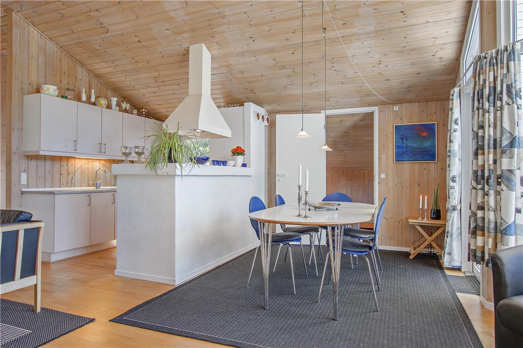 Der gesamte Innenbereich besticht mit seiner guten Möblierung und der geschmackvoll aufeinander abgestimmten Farbwahl. Die offene Küche schließt direkt an den Ess- und den Wohnbereich. Der Kamin in einer Ecke des Wohnraums sorgt an kühleren Tagen für behagliche Wärme und ein Maximum an typisch dänischer Ferienhausgemütlichkeit. Das Mietobjekt beinhaltet zwei Schlafräume mit jeweils zwei Einzelbetten und einen Schlafraum mit einem Doppelbett. Zwei ansprechende Bäder verhindern unangenehme Warteschlangen am Morgen. Das größere der beiden Bäder sorgt nach einem erlebnisreichen Urlaubstag mit seinem schönen Eckwhirlpool und der Sauna für erholsame Momente voller Entspannung.