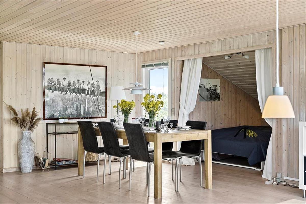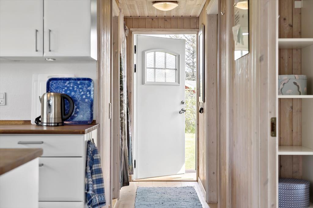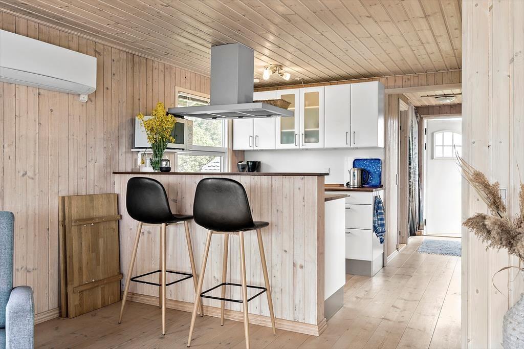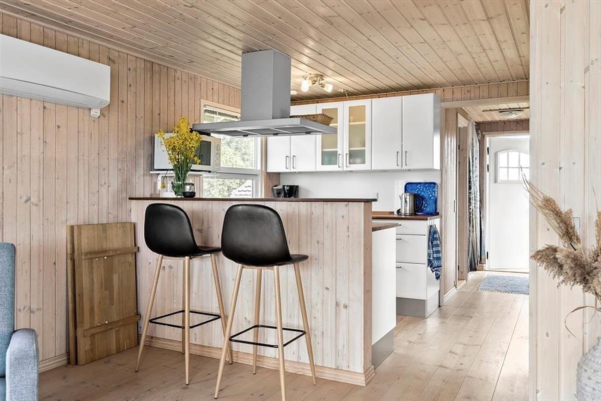 Wenn Sie das Sommerhaus betreten, werden Sie von einer hellen und einladenden Atmosphäre empfangen, die es zu einer Freude macht, hier Zeit zu verbringen. Die großen Fenster sorgen für hervorragendes Licht und öffnen den Blick auf den ruhigen Garten. Die Einrichtung ist hell und charmant, mit einer Mischung aus klassischen und modernen Details, und Sie werden sich schnell wie zu Hause fühlen. Das Wohnzimmer und die Küche sind offen miteinander verbunden, was viel Platz für sowohl gemeinsames Beisammensein als auch Entspannung bietet. Wenn Sie sich auf der Couch niederlassen, können Sie sich leicht vorstellen, wie Sie bei einem guten Buch oder einem Glas Wein gemütliche Momente verbringen, während die Sonne langsam über das Gebiet untergeht.Das Sommerhaus hat eine gute Raumaufteilung, die sowohl für Familien als auch für Gruppen von Freunden geeignet ist, und die beiden Schlafzimmer sorgen für eine erholsame Nachtruhe. Ein zusätzlicher Schlafplatz befindet sich in der gemütlichen Schlafnische im Wohnzimmer, die perfekt für diejenigen ist, die gerne nahe bei der Gemeinschaft bleiben möchten. Die anderen Räume sind einfach und funktional gestaltet, was die entspannende Urlaubsatmosphäre unterstützt.