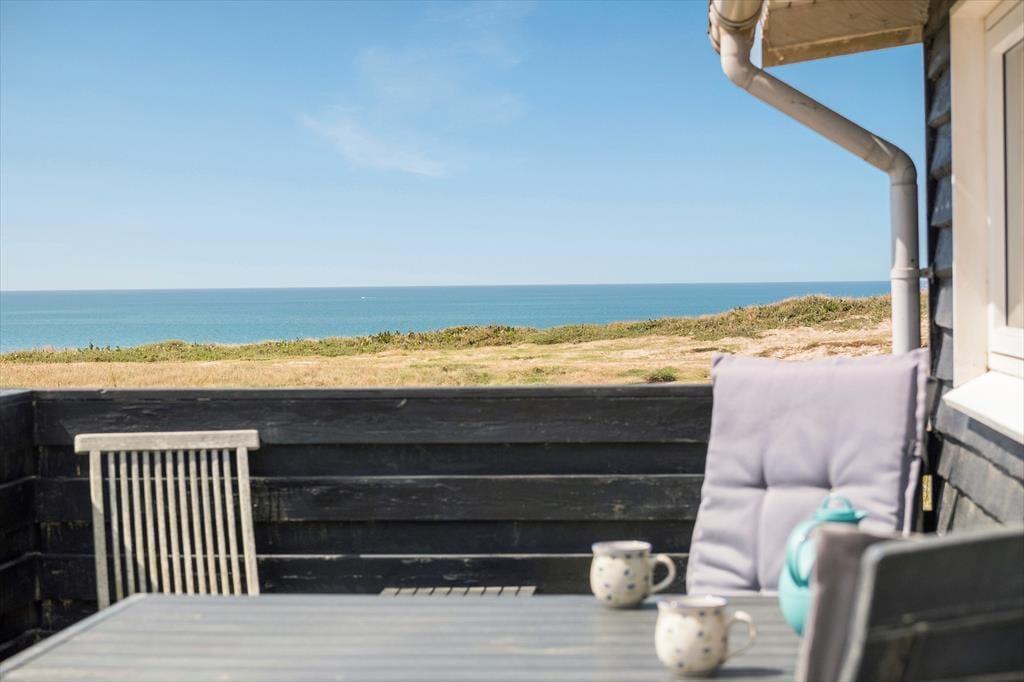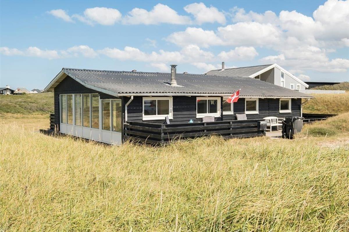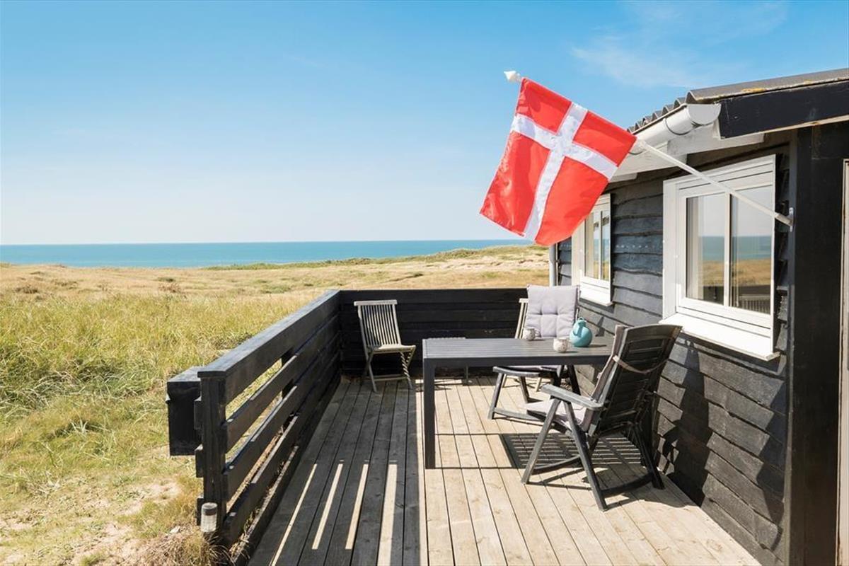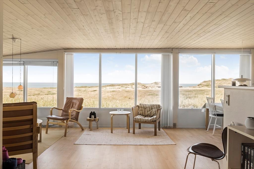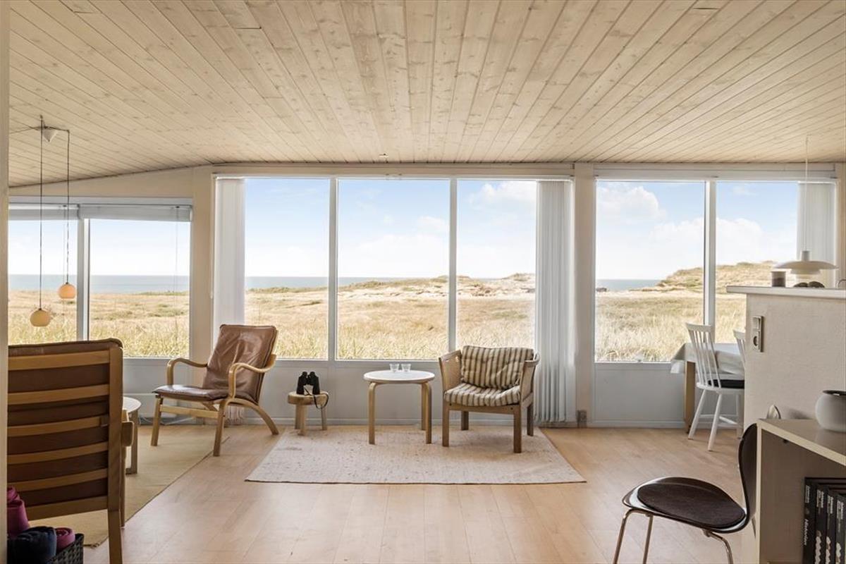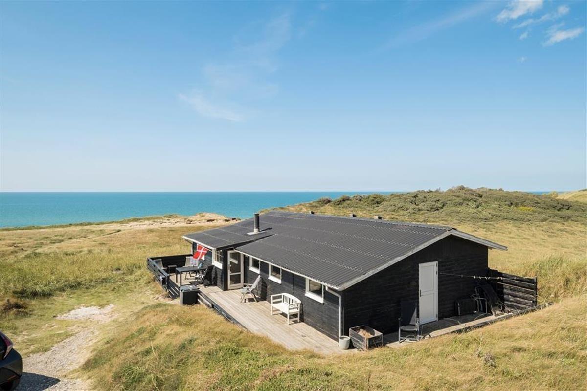Helles und geräumiges Holzferienhaus mit herrlicher Panoramaaussicht über die Nordsee. Das Mietobjekt befindet sich auf dem Wipfel einer Düne, mitten auf einem großen Naturgrundstück nahe dem Ortskern von Lønstrup.