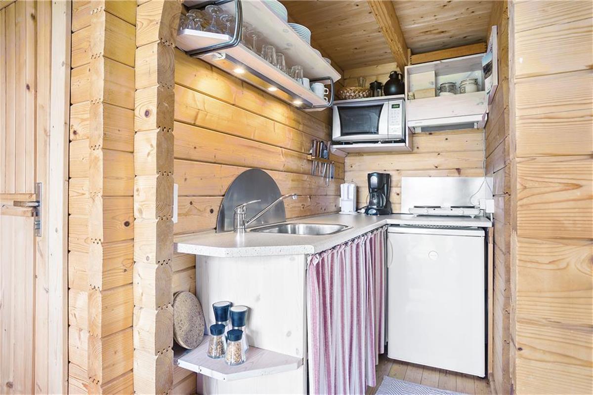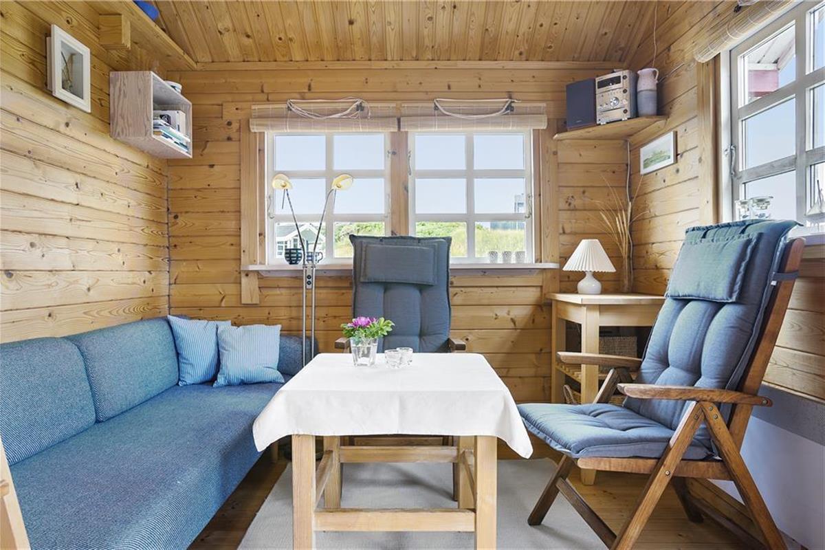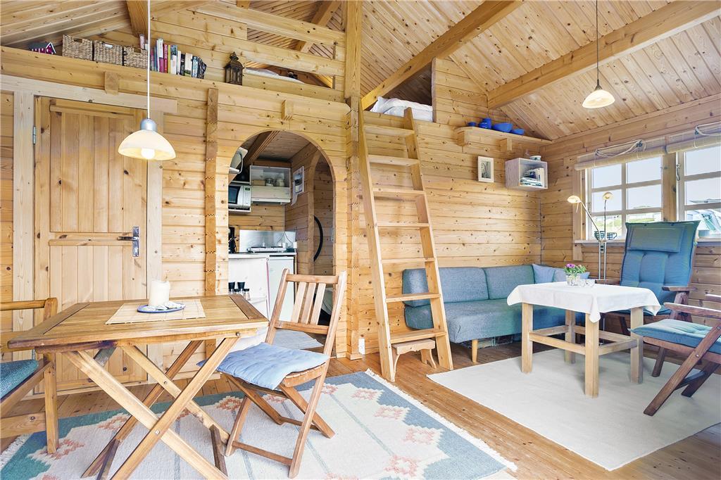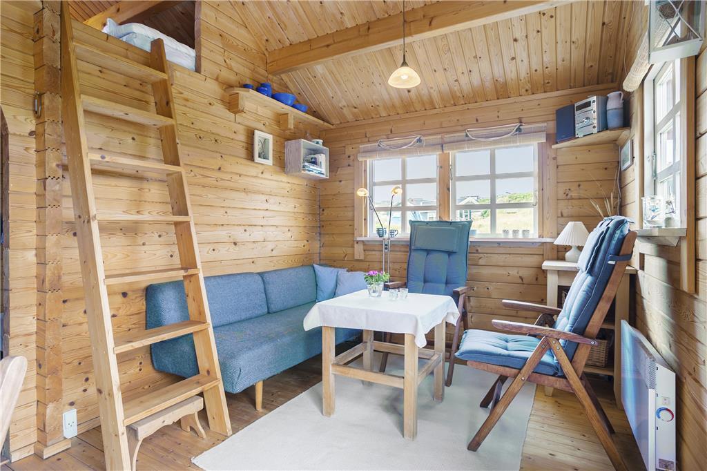 Als erstes wird das Wohnzimmer betreten, das mit einem Sofa und minimalistischen Möbeln im Hinblick auf das kleine Platzangebot eingerichtet ist. Generell kann alles als sehr gemütlich und charmant beschrieben werden. Die kleine, aber funktionale Küche ist direkt mit dem Wohnzimmer verbunden, sodass während des Kochens das Geschehen im Wohnzimmer und auf der Terrasse beobachtet werden kann. Auf dem Dachboden befinden sich zwei Matratzen und von hier überblicken Sie das Wohnzimmer, Terrasse und die wundervolle Dünenlandschaft, die das Haus umgeben. Das Schlafzimmer im Erdgeschoss ist ausgestattet mit einem Schlafsofa für zwei Personen. Auch das Sofa im Wohnzimmer kann als Schlafplatz genutzt werden, falls der Schlafboden Ihnen nicht gefallen sollte. Es ist ein kleines Badezimmer mit Dusche im Ferienhaus vorhanden.