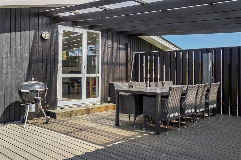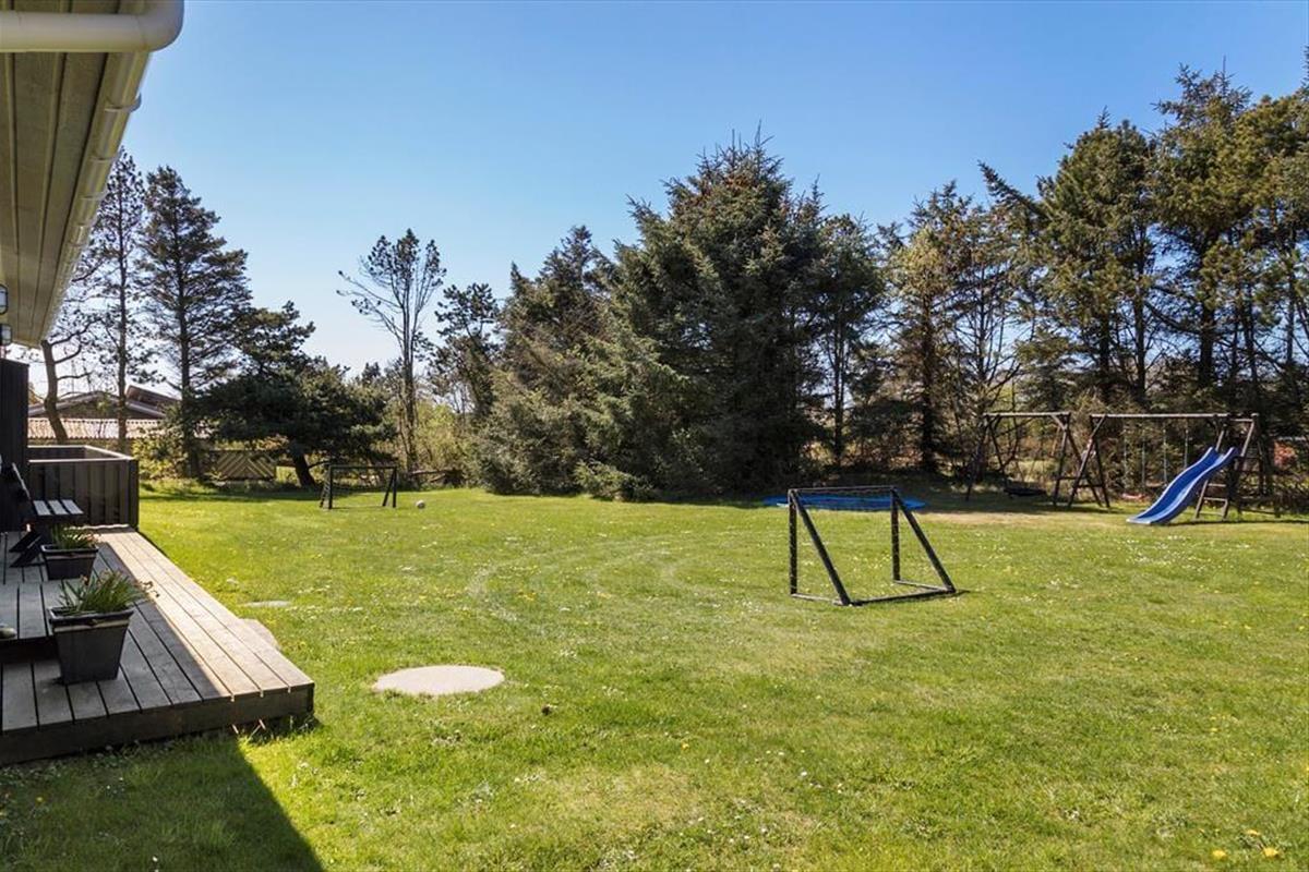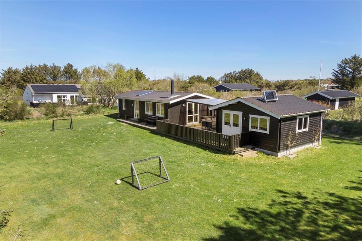 Rund um das Haus erstrecken sich gleich mehrere Terrassen. Somit können Sie je nach Tageszeit, Stand der Sonne und persönlicher Vorliebe frei entscheiden, wo Sie sich gerade niederlassen möchten. An die Nordostseite des Ferienhauses schmiegt sich eine große Holzterrasse, auf der Sie von den Morgenstunden bis ungefähr 14 Uhr von der Sonne verwöhnt werden. Danach können Sie auf Wunsch auf die Westterrasse umziehen, die nicht nur groß, sondern auch teilweise überdacht ist. Erwähnen möchten wir auch, das die Westterrasse komplett geschlossen ist - ein Umstand, den sicherlich insbesondere Eltern von abenteuerlustigen Kleinkindern und Hundebesitzer sehr zu schätzen wissen. Die jüngsten Urlaubsgäste dürfen sich zudem auf die Grasfläche des großen Grundstücks freuen, die nicht nur zum Umhertollen und zu Ballspielen aller Art animiert, sondern auch mit einem Trampolin, einer Schaukel und einem Fußballtor viel Spaß und Abwechslung garantiert.