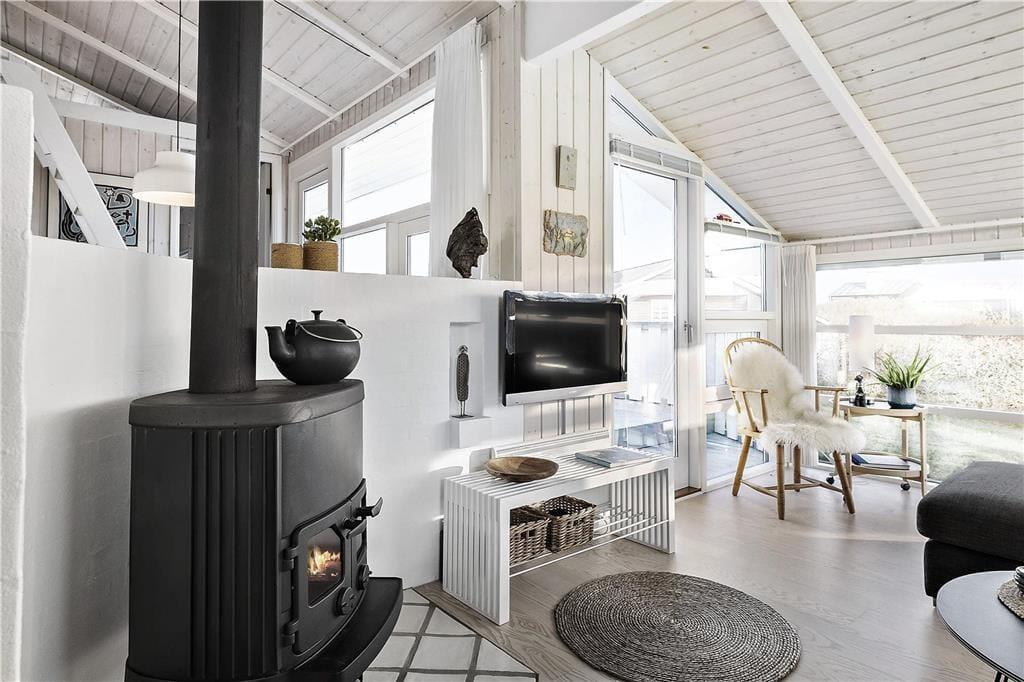 Drinnen empfängt Sie eine helle und einladende Atmosphäre. Die stilvolle Einrichtung mit natürlichen Materialien schafft ein harmonisches Ambiente, in dem Sie sich sofort wohlfühlen. Küche und Wohnzimmer sind offen miteinander verbunden – so können Sie gemeinsam kochen, erzählen und entspannen, ohne dass jemand etwas verpasst. Der Holzofen sorgt an kühlen Abenden für wohlige Wärme und schafft eine herrlich hyggelige Stimmung. Große Fenster lassen viel Licht herein und geben den Blick frei auf die umgebende Natur und – in der Ferne – auf das Meer, das im Sonnenlicht glitzert oder sich dramatisch gegen den Horizont wirft. Dieses Ferienhaus ist ideal für Paare und Familien, die eine komfortable und gemütliche Unterkunft in Meeresnähe suchen.