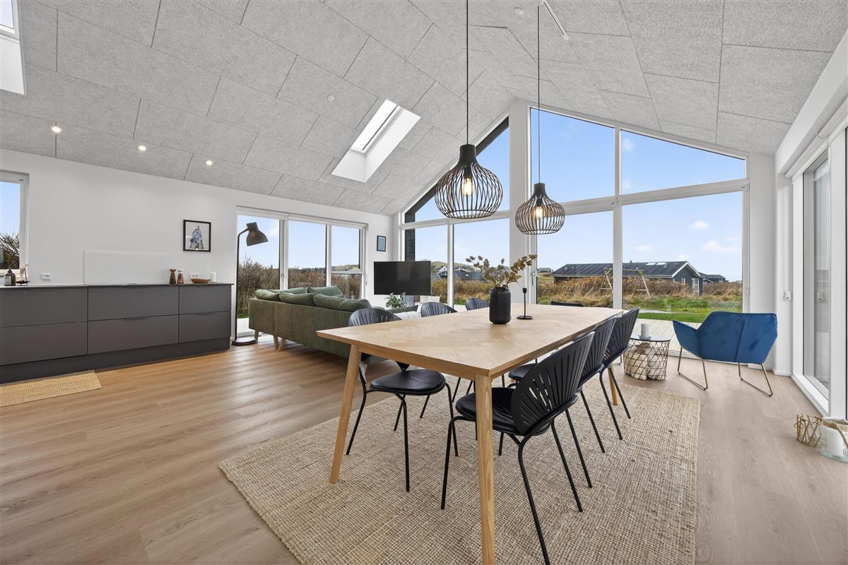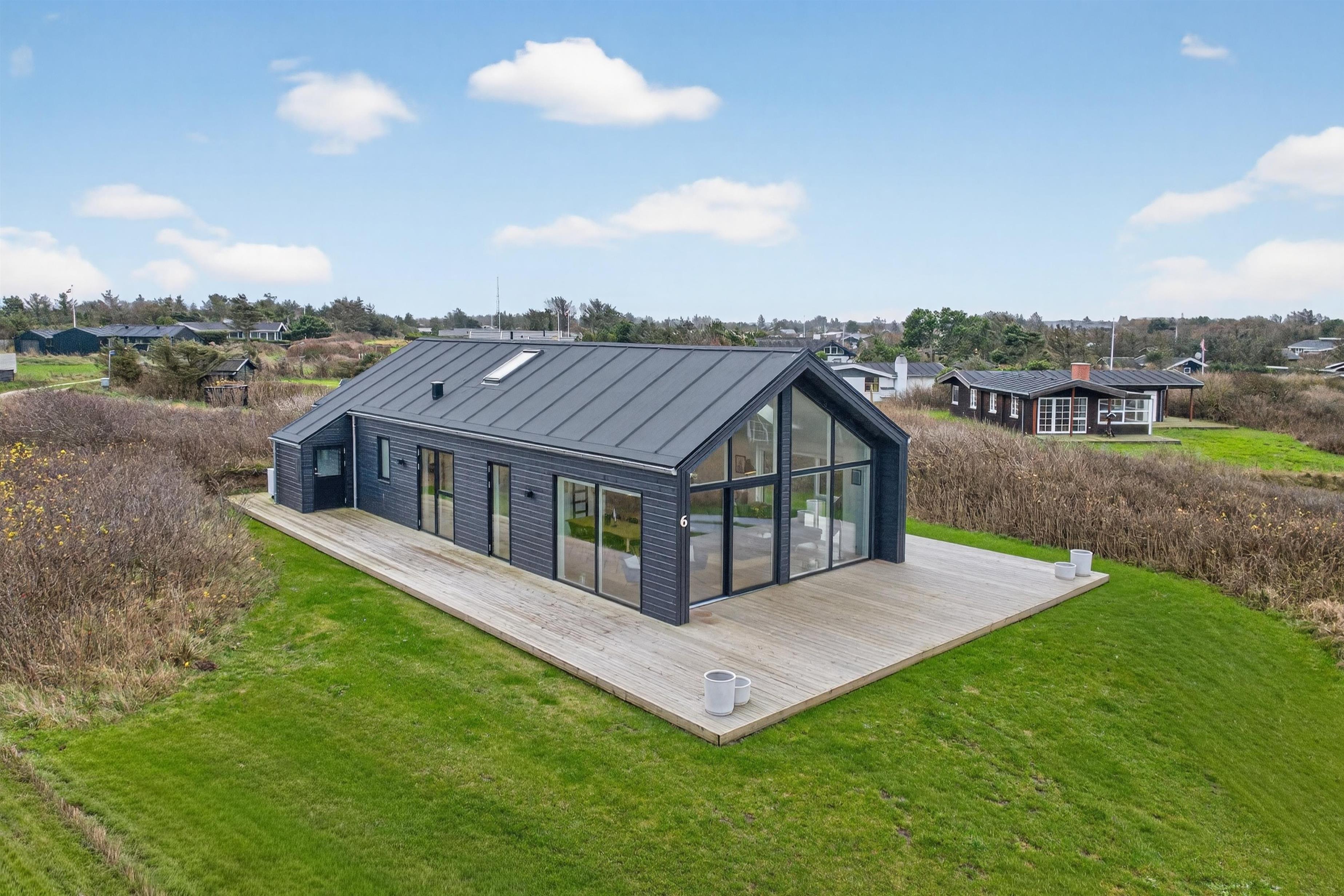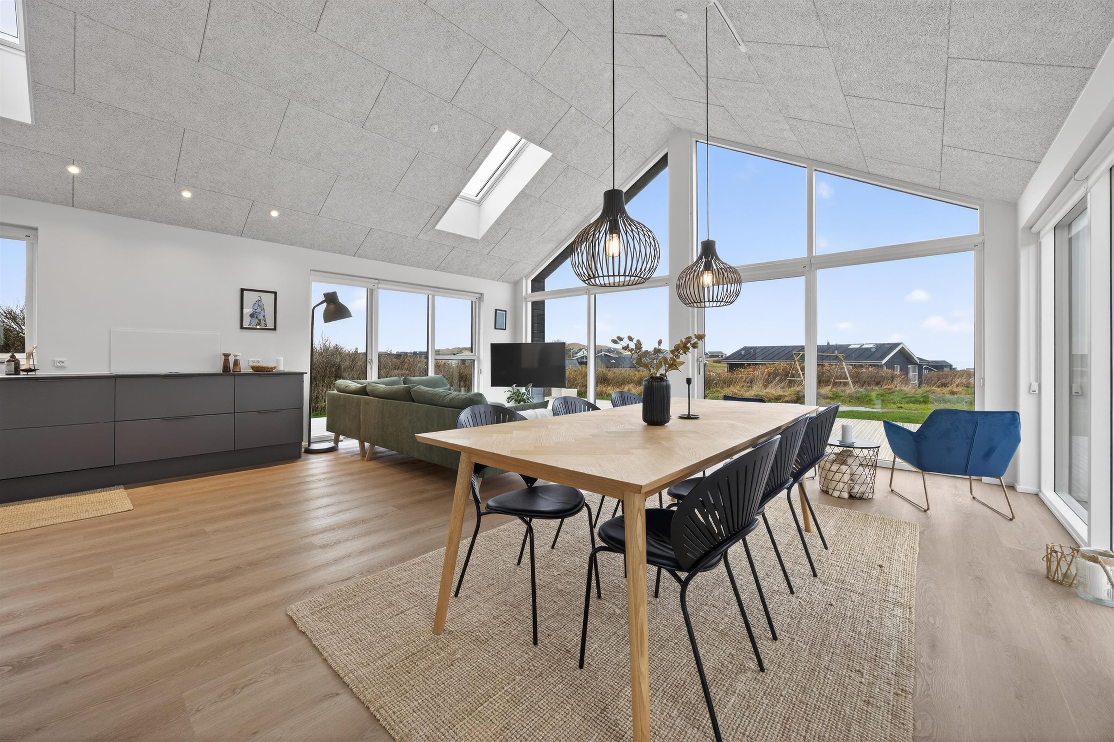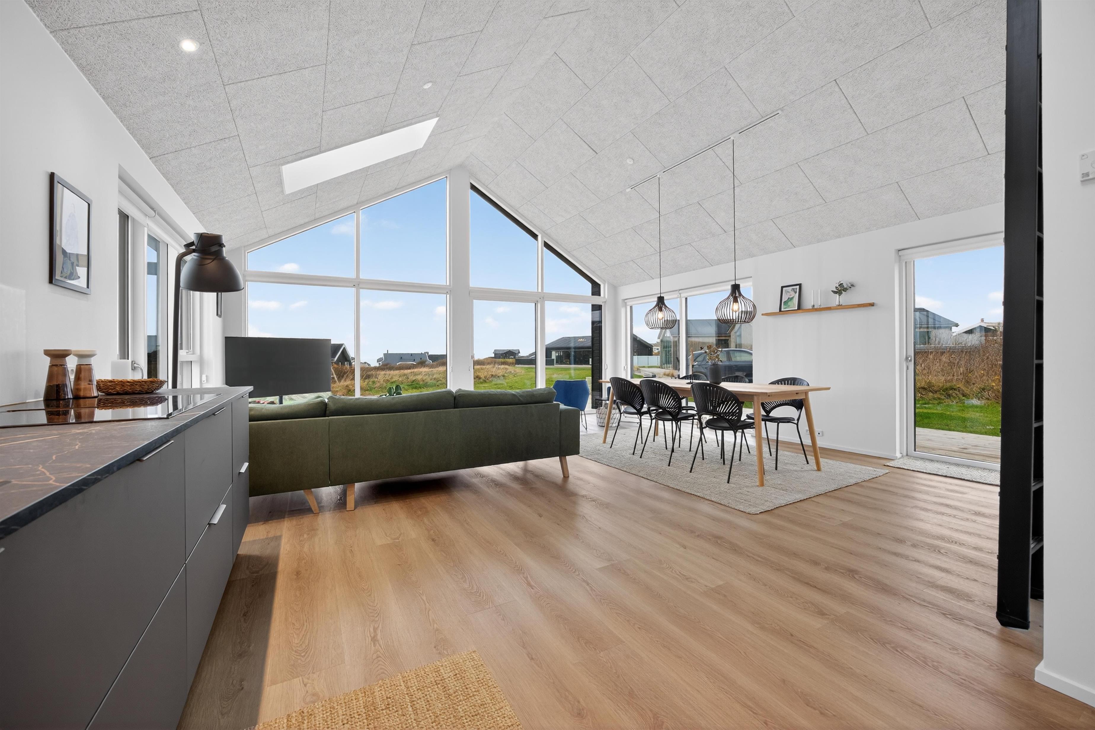 Welcome to a new and modern holiday home where quality and comfort go hand in hand. From the moment you enter, you will notice the spacious layout and the impressive ceiling height, which together create an airy and inviting atmosphere. From here, you step into a beautifully designed living area featuring large panoramic windows that bring the horizon of the sea directly into the room.