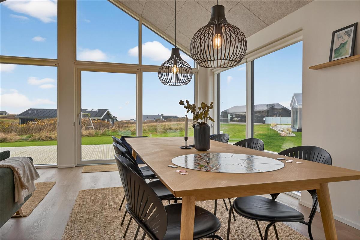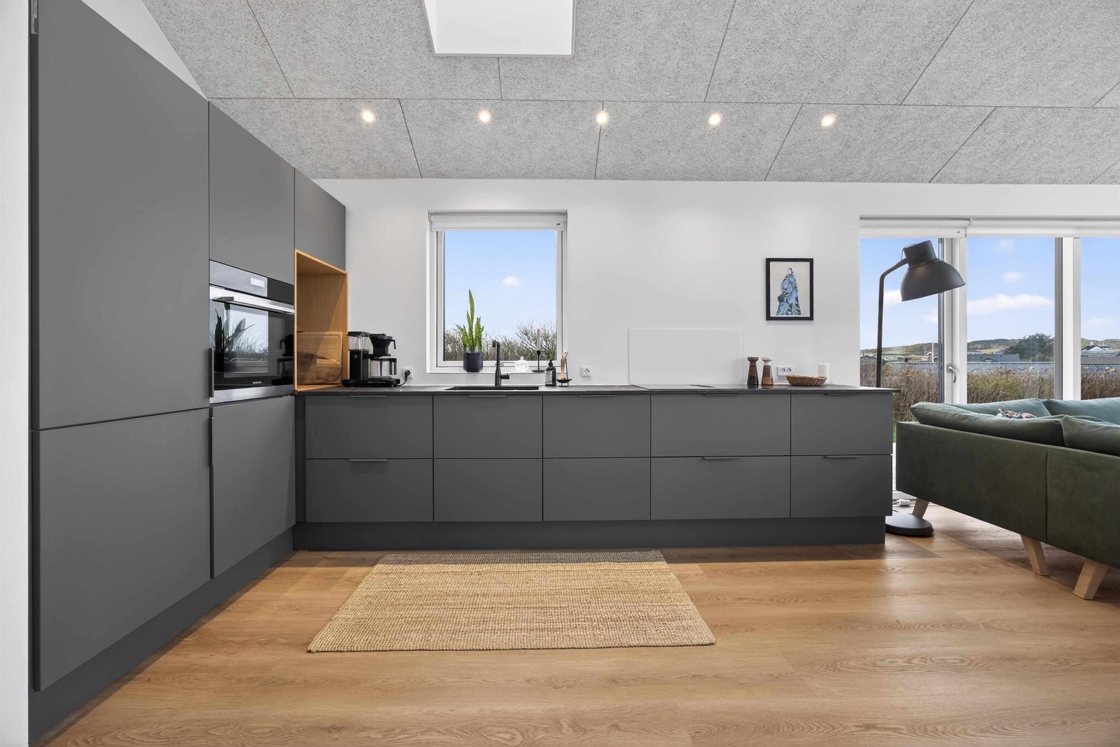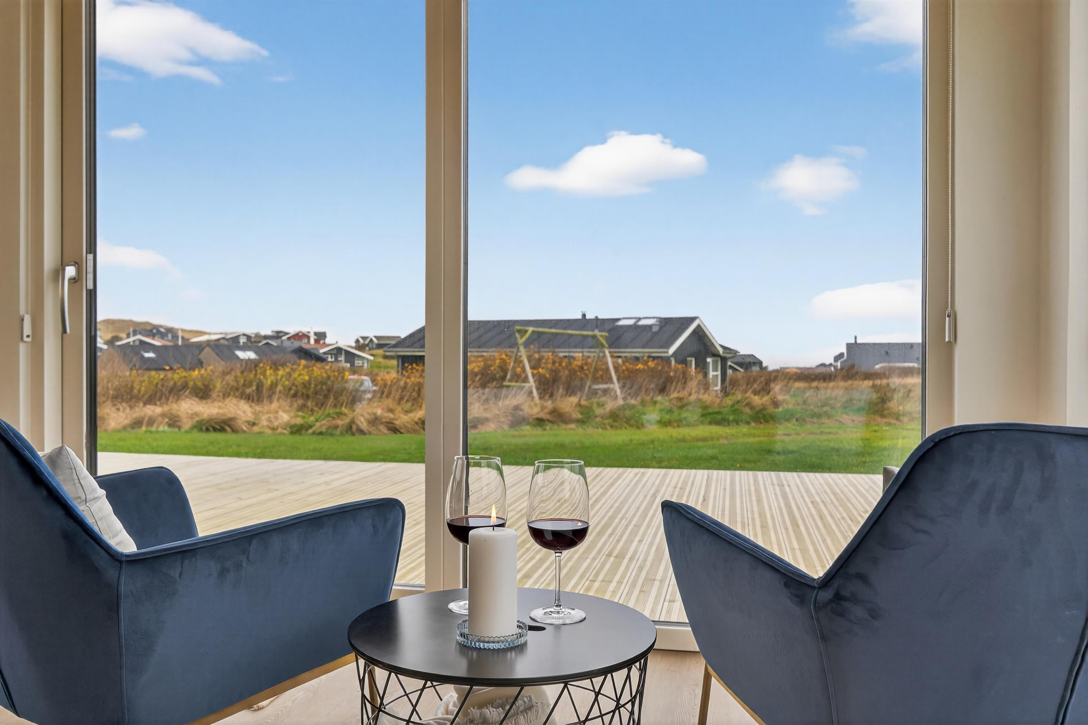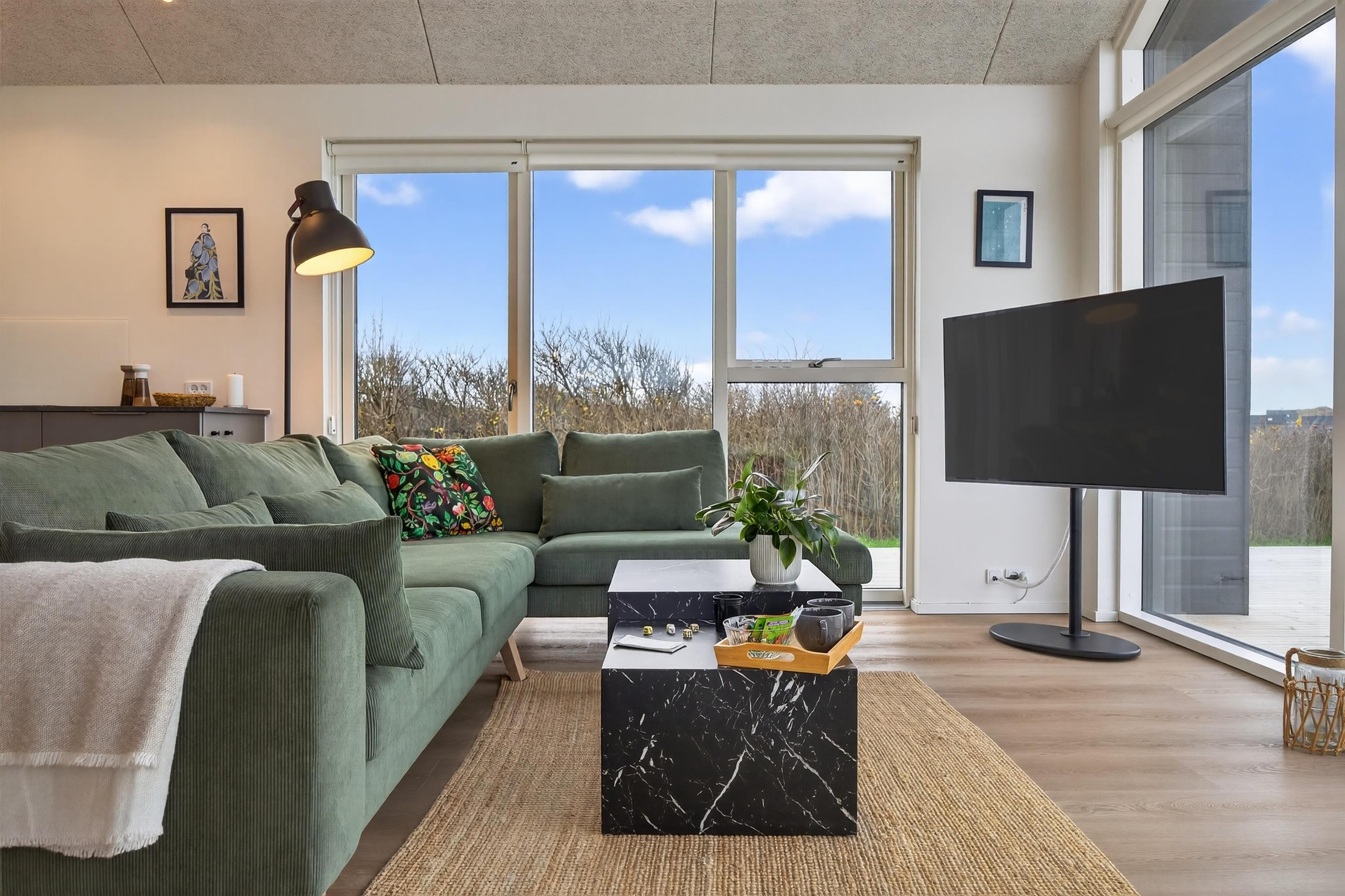 Welcome to a new and modern holiday home where quality and comfort go hand in hand. From the moment you enter, you will notice the spacious layout and the impressive ceiling height, which together create an airy and inviting atmosphere. From here, you step into a beautifully designed living area featuring large panoramic windows that bring the horizon of the sea directly into the room.