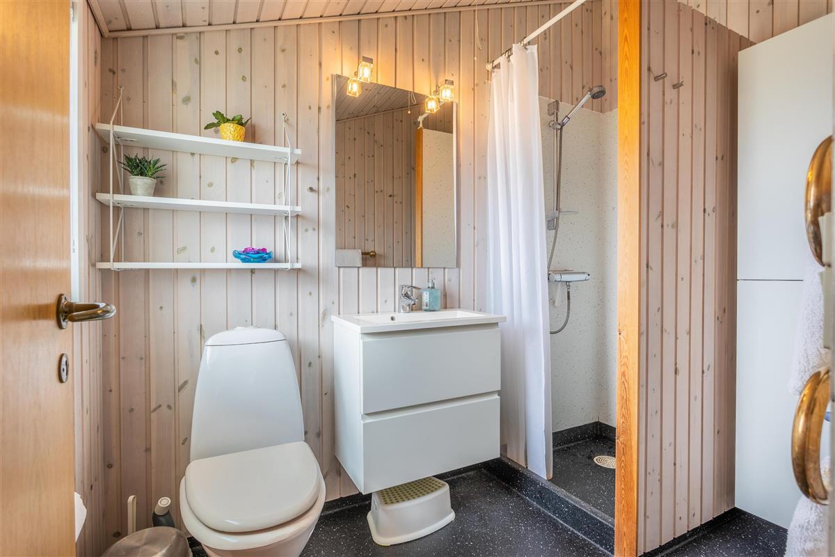 Upon entering the cozy kitchen, you are immediately greeted by a stunning sea view. The kitchen is in open connection with the dining area, where large windows offer an uninterrupted view of the water. From the dining space, a few steps lead down to the inviting living room, where you can warm up by the crackling wood stove on chilly evenings. The house also includes two bedrooms, one of which has bunk beds and serves as a passage to both the bathroom and the master bedroom.