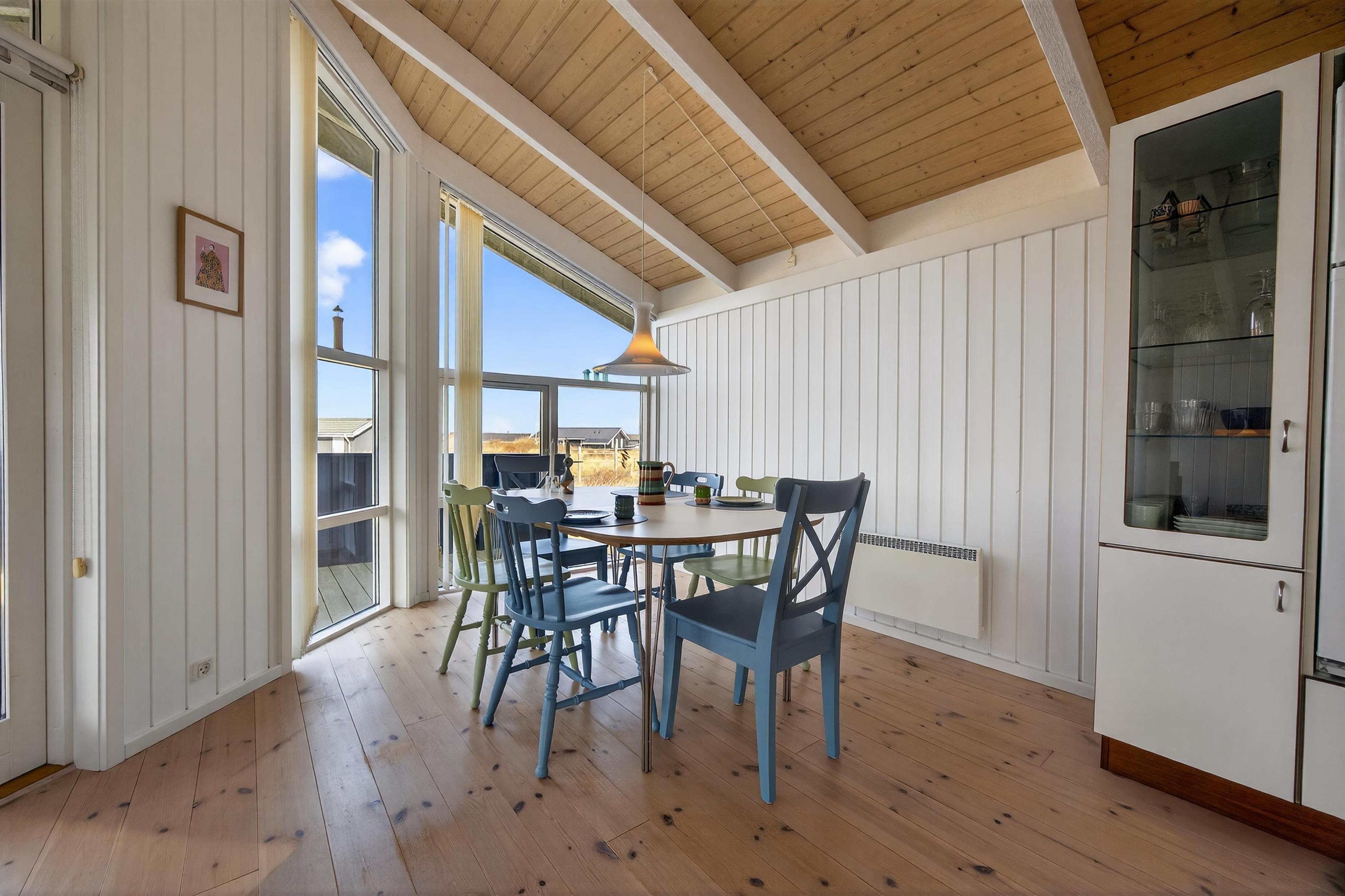 The heart of the house is the large living area with vaulted ceilings and large windows that let in plenty of light and bring the surrounding nature inside. From here you can enjoy a wonderful view across the dunes and the small holiday homes, with the picturesque North Sea in the background. On clear evenings, you can experience some of the most beautiful sunsets on the West Coast directly from the living room.