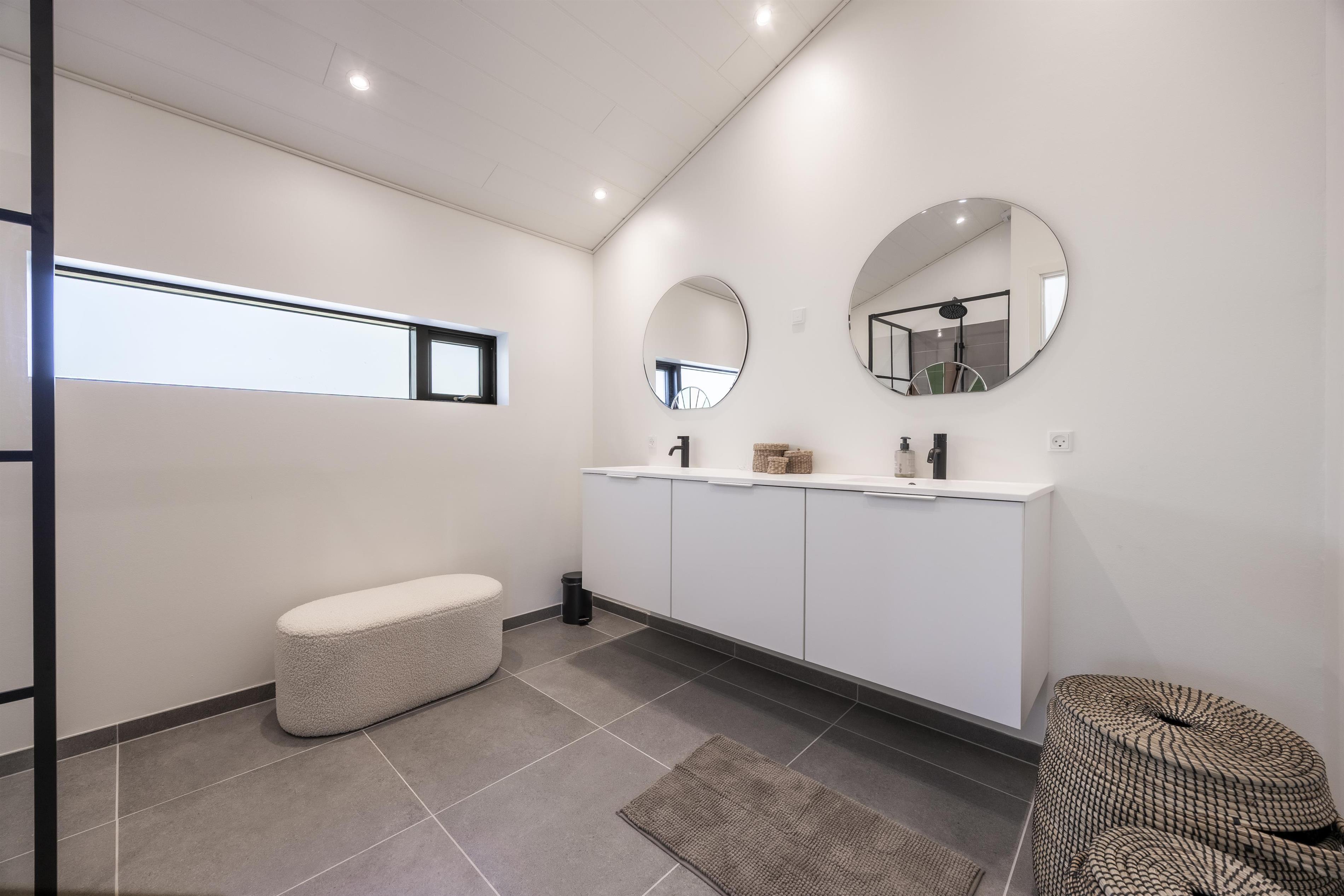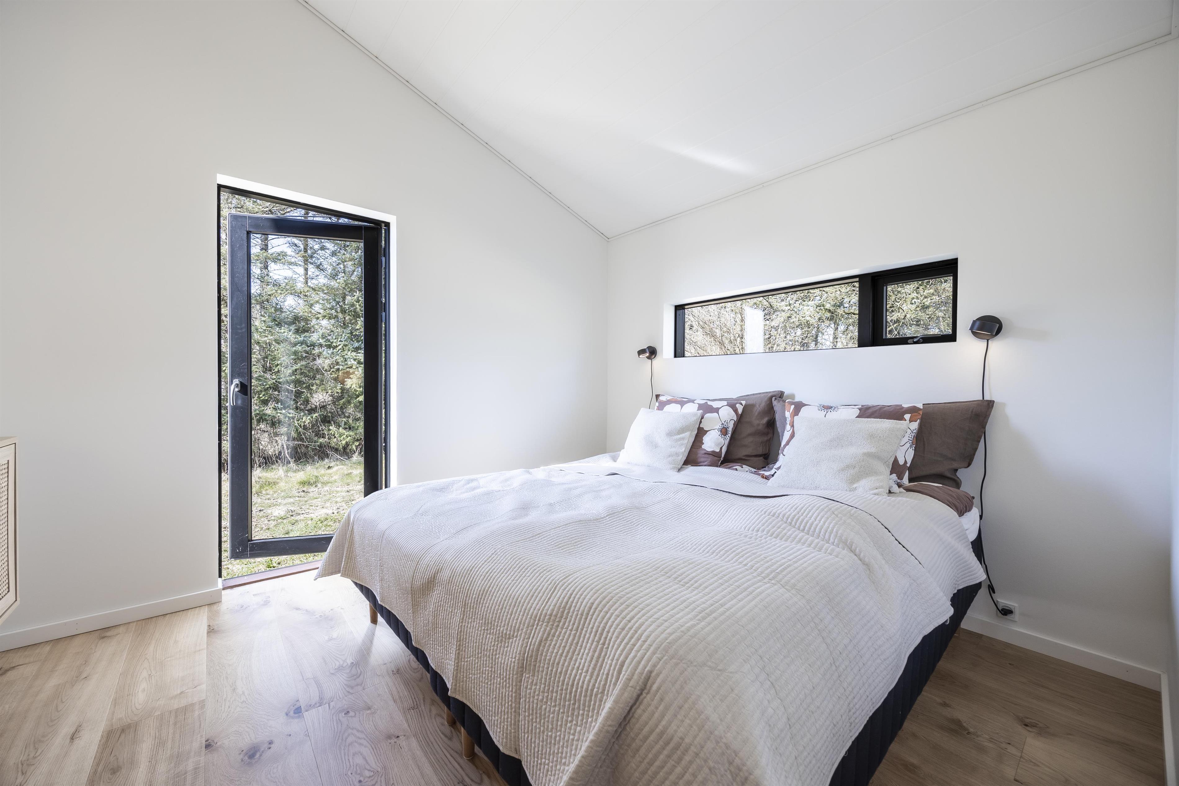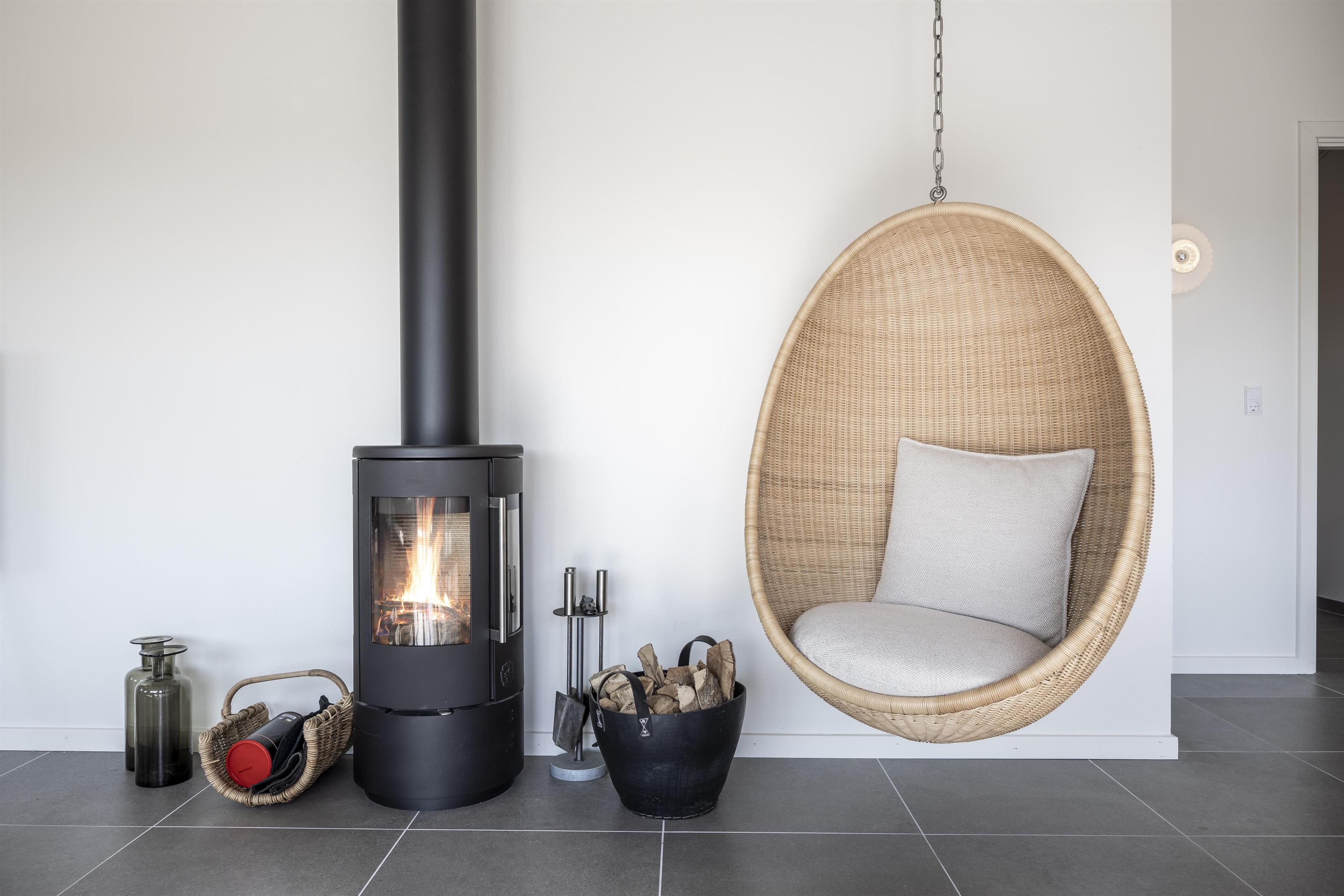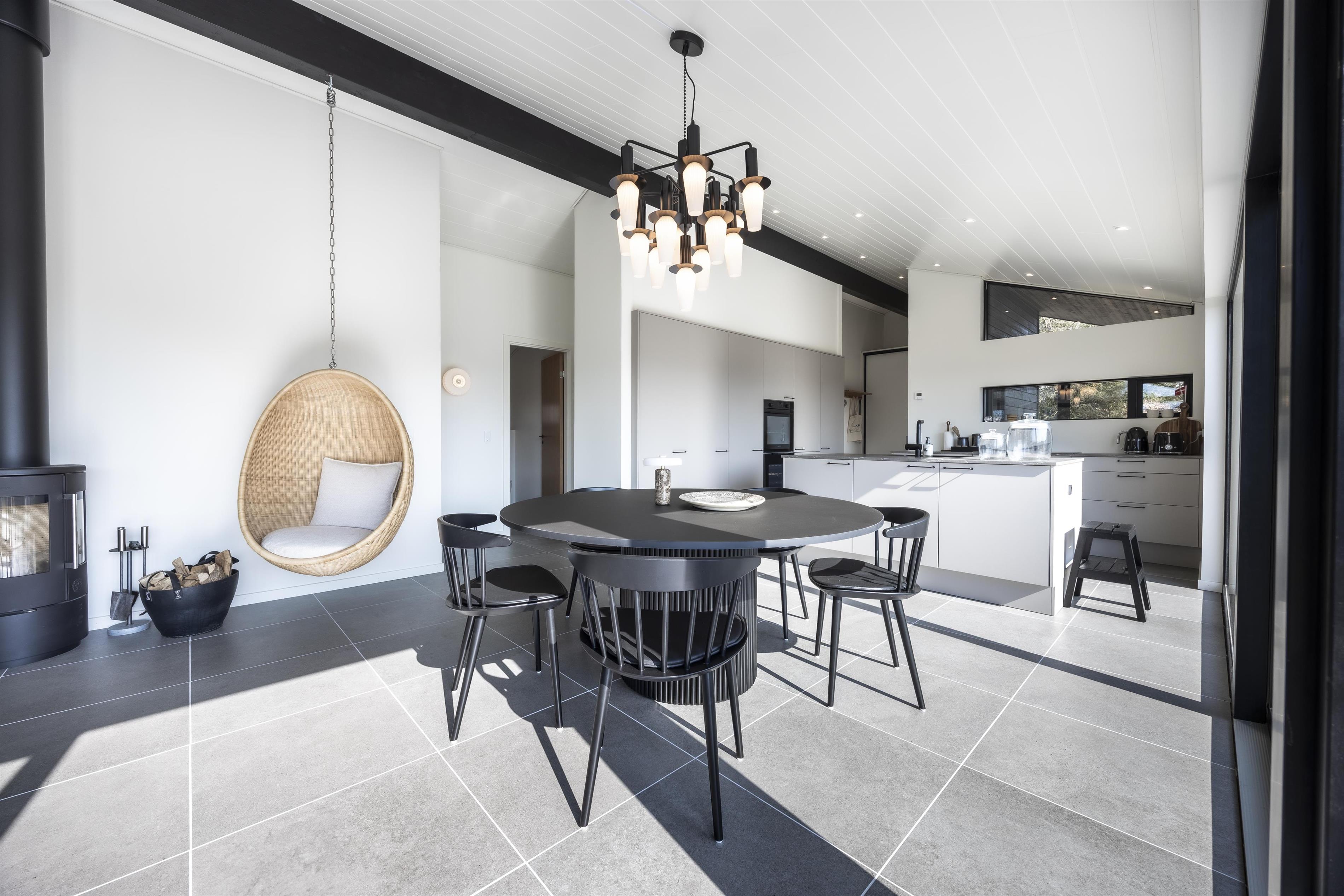 The entire home has a warm and natural feel. Large windows in the living area bring in the light and the surrounding nature, creating a peaceful atmosphere. On chilly days, curl up with a good movie, light the wood-burning stove, and enjoy a relaxing evening by the flickering fire. The house is energy-efficient and heated with a heat pump.