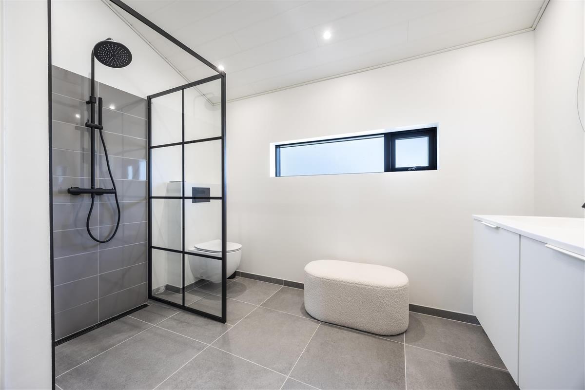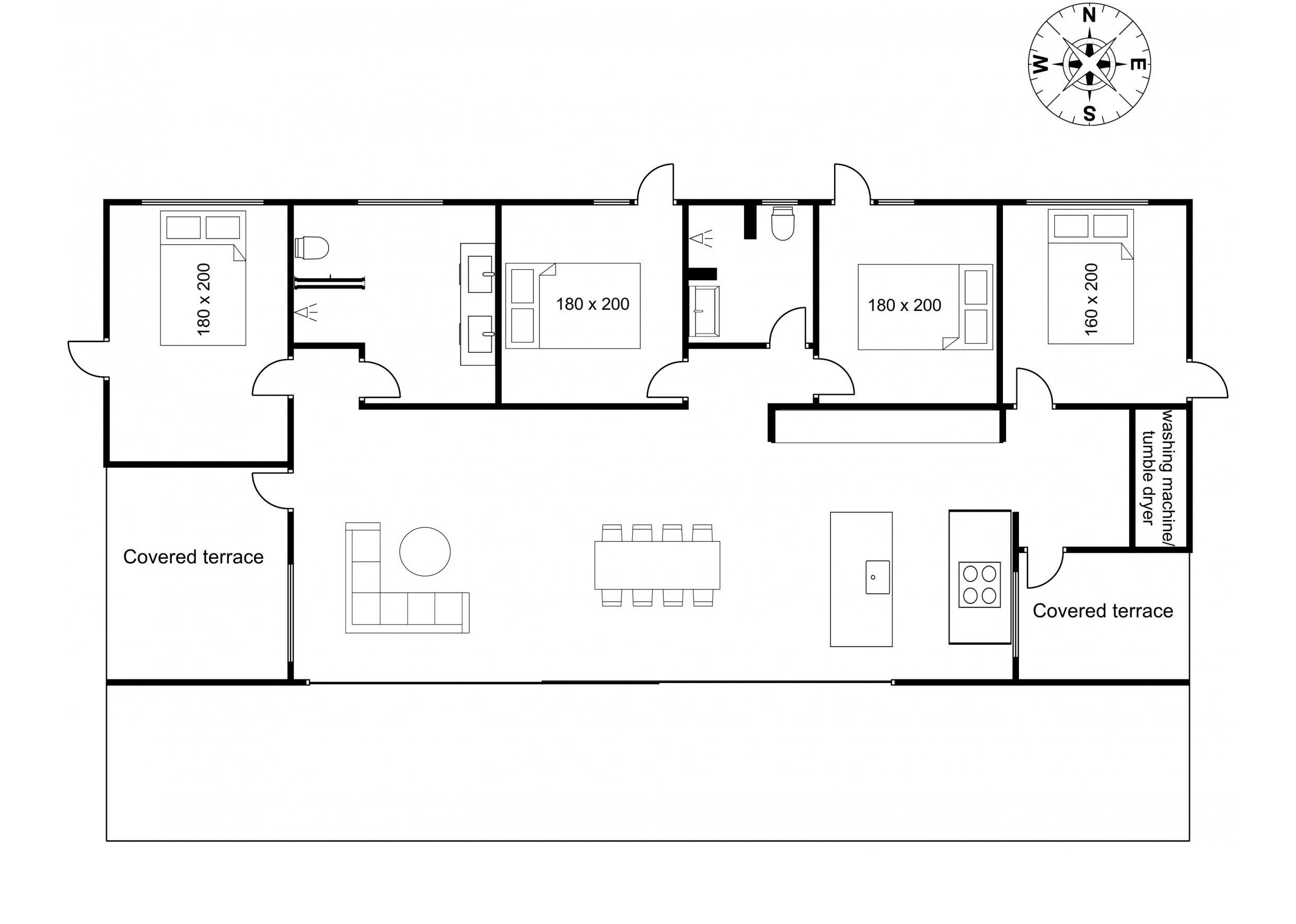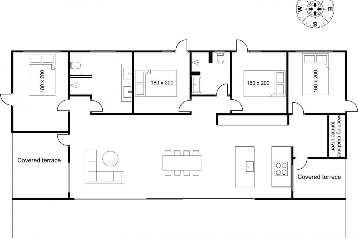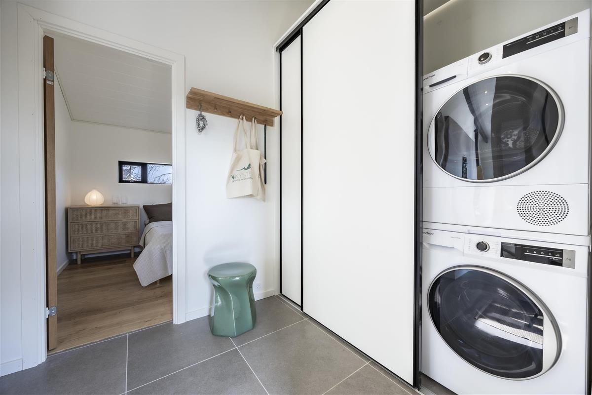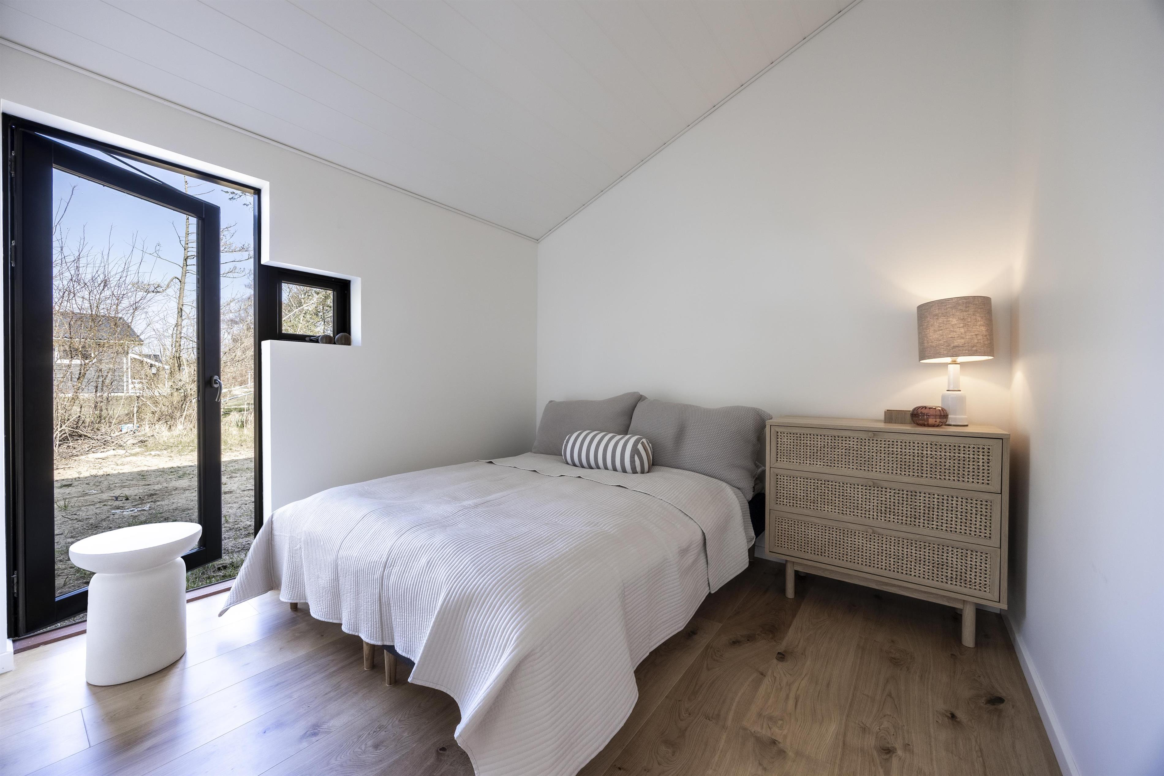 When you unlock the door to this inviting holiday home, you enter a spacious hallway with plenty of room for outerwear. Here you’ll also find a washing machine and tumble dryer. Further ahead is the first cozy bedroom with a double bed. The heart of the house is the open-plan kitchen, dining, and living area, with access to three additional spacious bedrooms and two large bathrooms, both with showers.