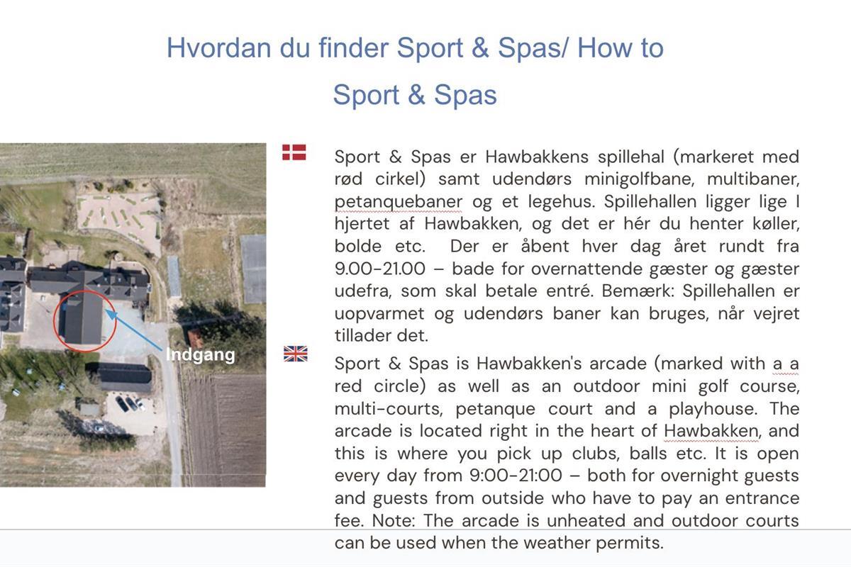 Hawbakken Sport & Spas offers more than 15 different activities for everyone, including mini-golf, basketball, football, volleyball, table tennis, petanque, air hockey, foosball, street hockey, Kubb, a playhouse, and much more. Sport & Spas is free for guests staying at Hawbakken, while external guests can access it for 75 DKK per day. Guests are responsible for maintaining order and taking care of amenities for other guests’ enjoyment. Sport & Spas is open every day, all year round, from 9:00 to 21:00 – for both overnight guests and external visitors (entry fee applies).
