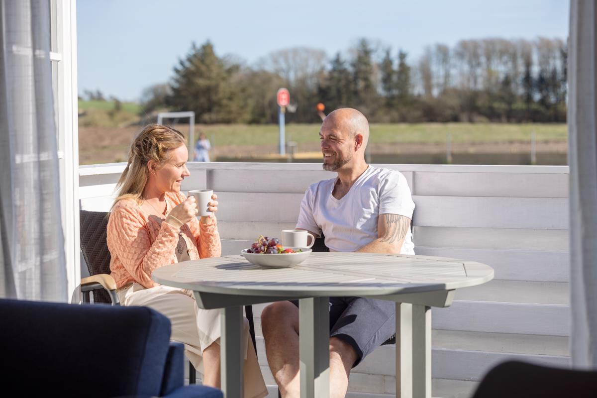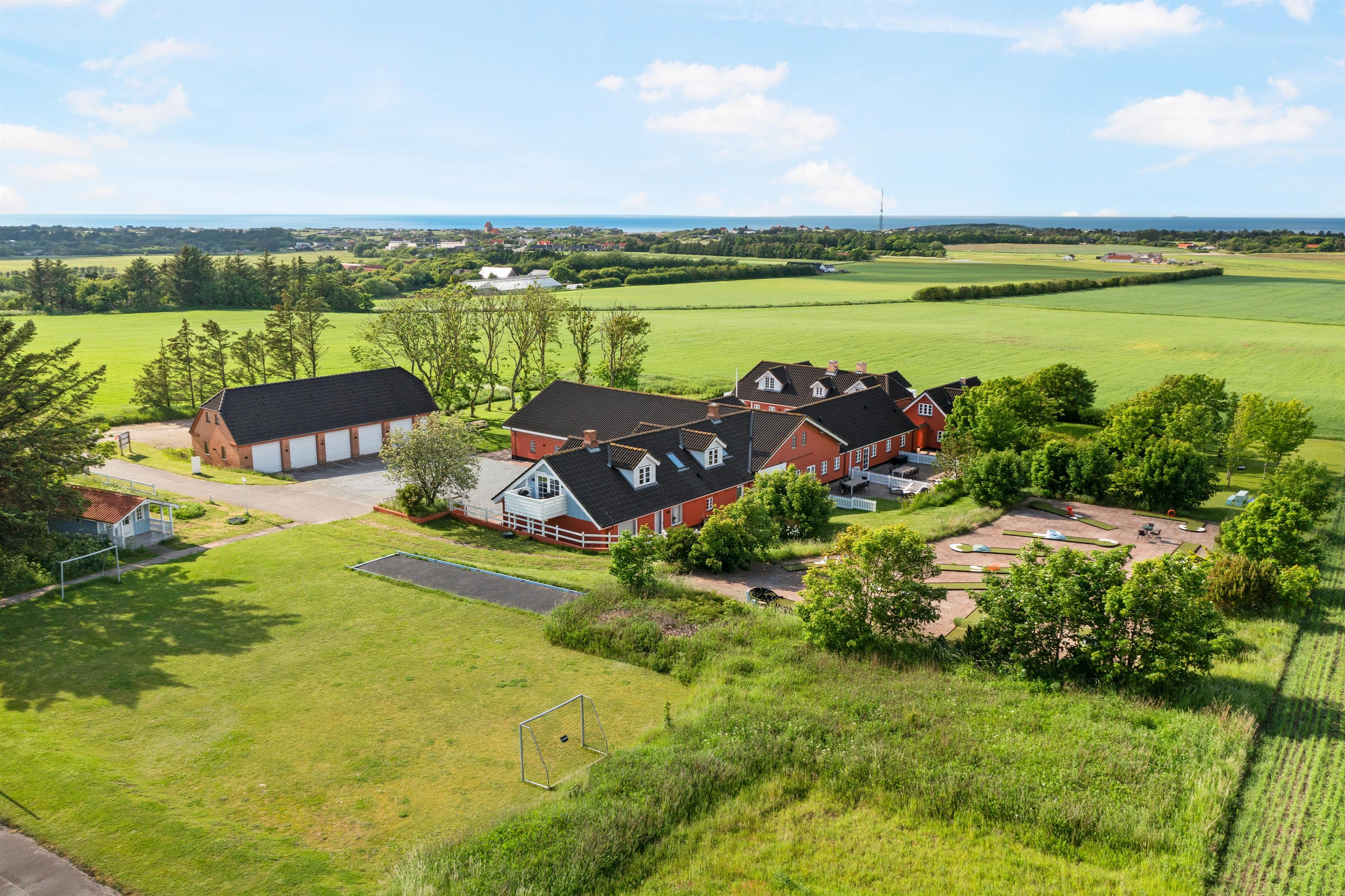 Outside at Hawbakken, there is ample space and many cozy spots with tables and benches, as well as a fantastic 180-degree panoramic view of the North Sea, Rubjerg Knude Lighthouse, and Lønstrup.